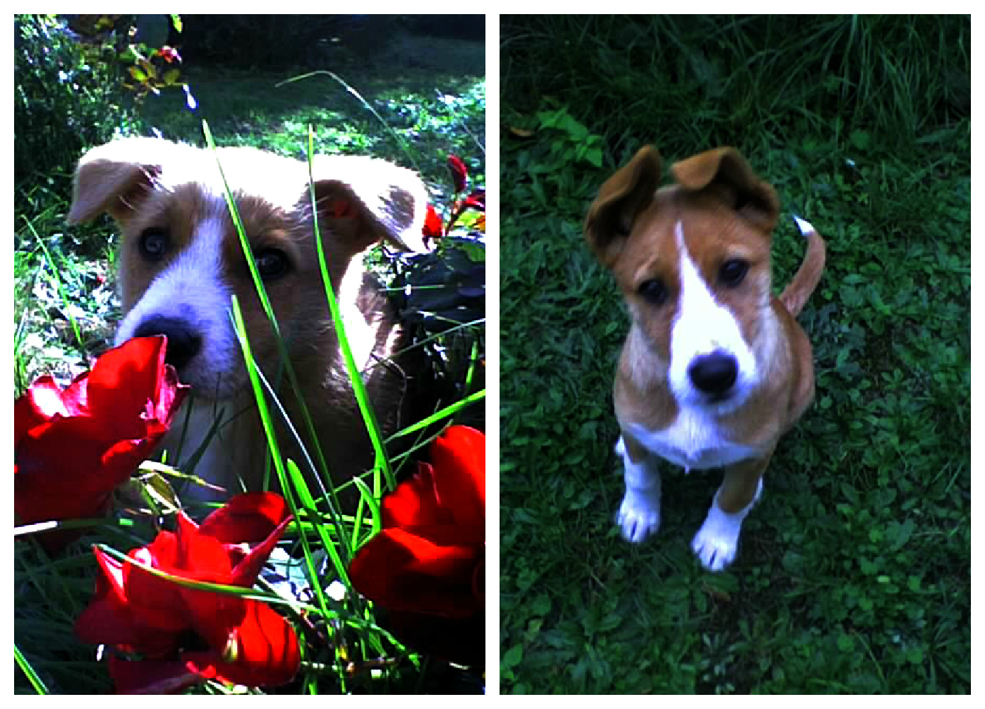 Trafiła do nas jako szczeniak. A właściwie przybłąkała się razem z dwójką rodzeństwa. Ją udało się złapać, reszta piesków niestety zwiała gdzieś w pola. Myśleliśmy, że może uciekły z czyjejś posesji, ale po kilku dniach (kiedy, chcąc nie chcąc, mała się już zadomowiła) okazało się, że to szczeniaki jakiegoś bezpańskiego psa. Od czasu do czasu można je było zobaczyć razem z matką gdzieś daleko na polach. Niestety nie mam pojęcia co później się z nimi stało, kilka osób próbowało je złapać i przygarnąć albo oddać do schroniska, ale się nie udało. To straszne jak wiele jest takich biednych bezpańskich psów, którymi nikt się zajmuje. Przynajmniej jednego z nich udało się uratować. Zdjęcie z lewej zrobiłam po jakimś tygodniu, a na tym po prawej widać, że jak każdy szczeniak, Lena rosła jak na drożdżach:
