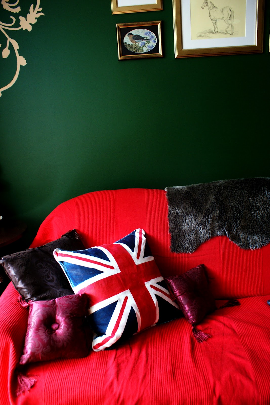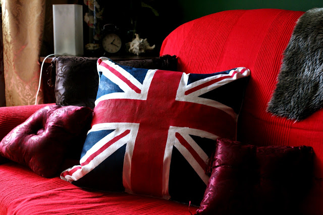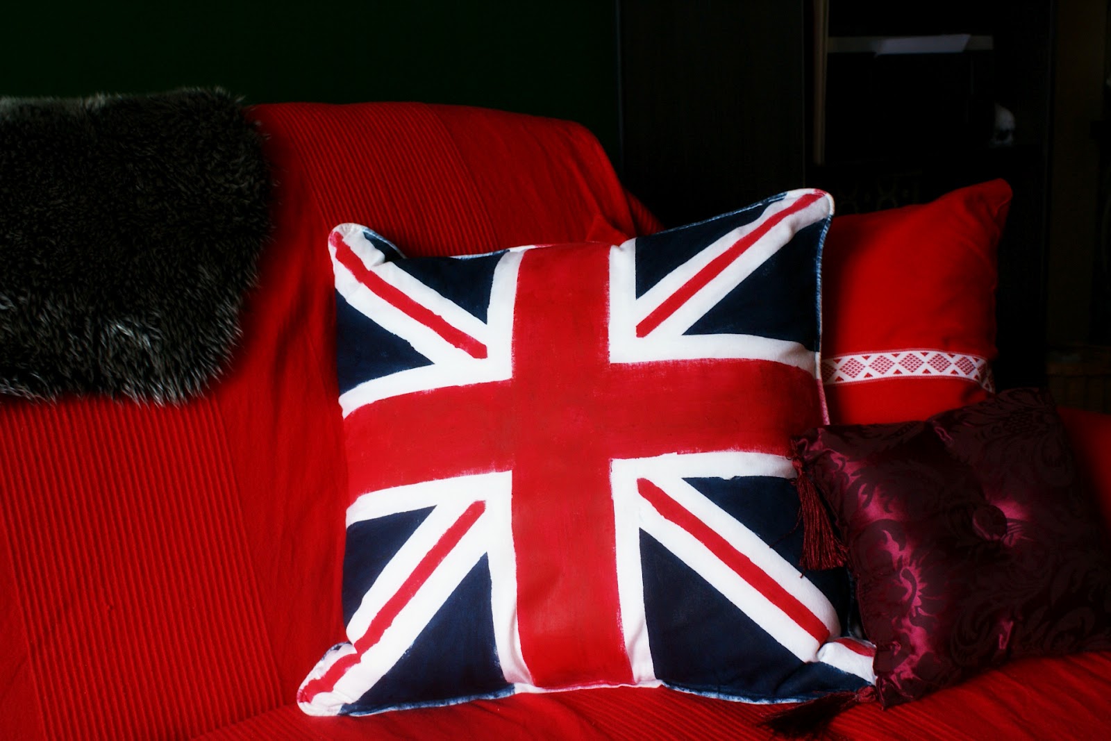 Tak jak wcześniej wspomniany slogan 'keep calm and carry on’, tak też brytyjski „Union Jack”, czyli po prostu brytyjska flaga, jest bardzo popularnym motywem graficznym, który pojawia się na zeszytach, kubkach, poduszkach, a nawet meblach! Pomyślałam, że coś takiego świetnie będzie pasowało do kolorów w mieszkaniu, więc zrobiłam sobie poduchę z Union Jackiem. Powiem skromnie, świetnie wyszło 😛