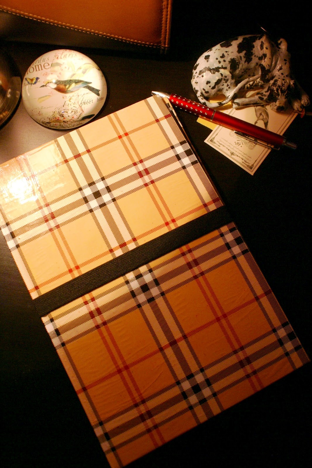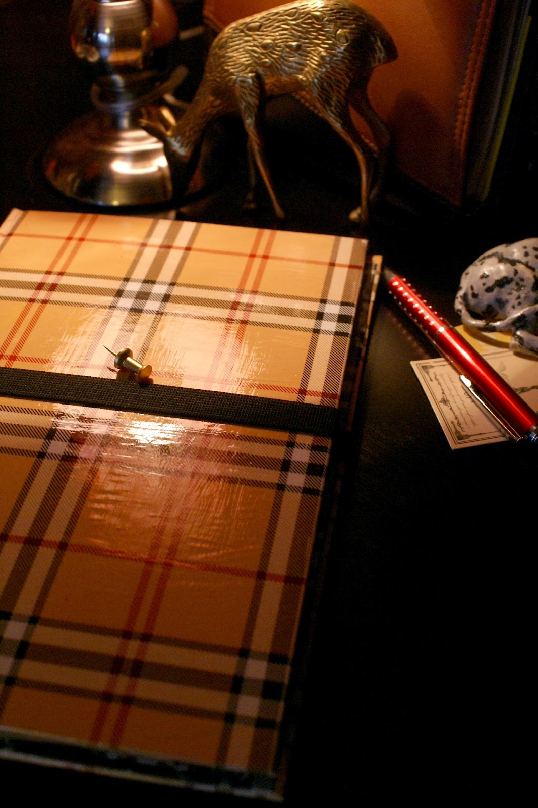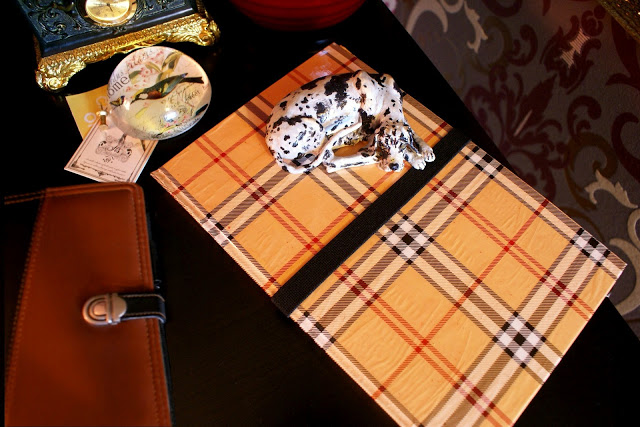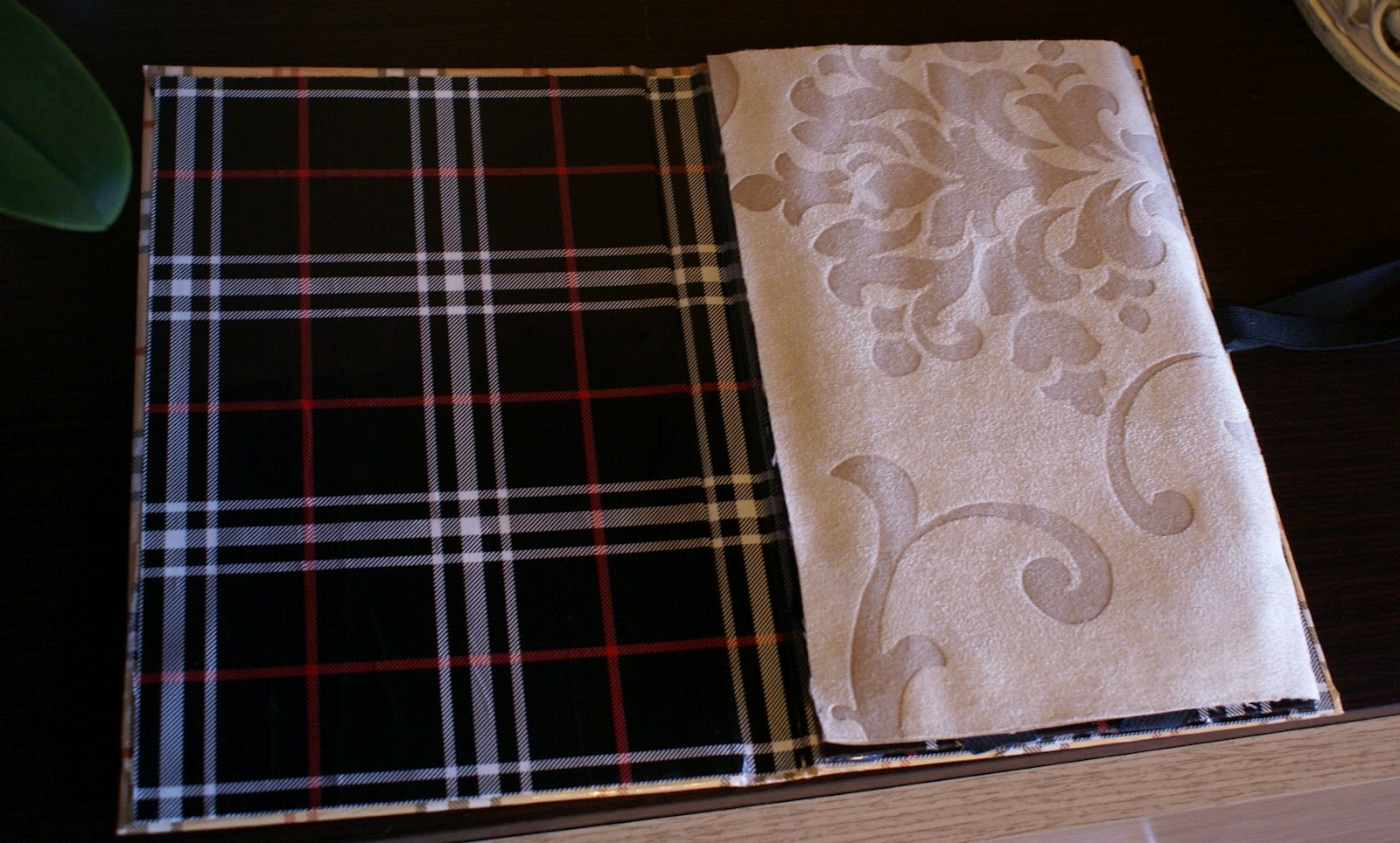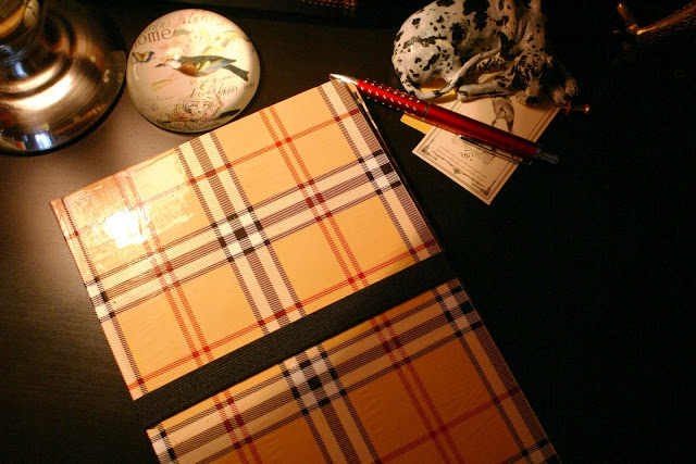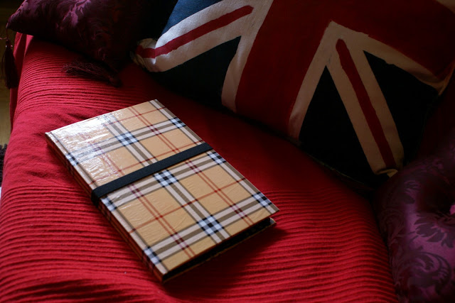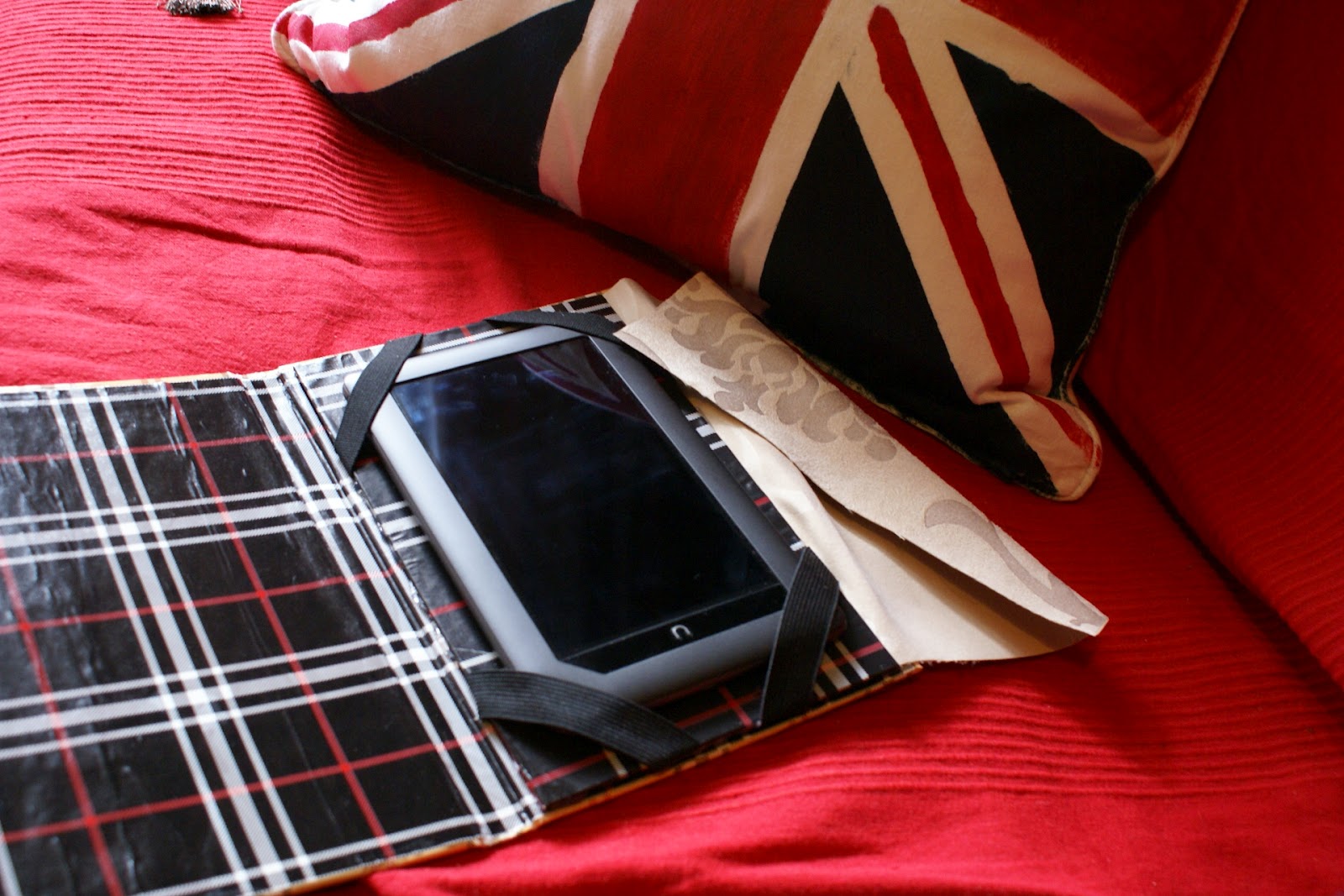 Wykonanie jest bardzo proste: wzięłam zeszyt z twardą okładką i wycięłam kartki. Później okleiłam wszystko papierem do prezentów, który specjalnie w tym celu kupiłam (spodobała mi się krata w stylu Burberry :P). Użyłam kleju Mod Podge. Następnie na prawej stronie przykleiłam gumkę dosyć długą, żeby bez problemu obejmowała całe etui. Na to na wszelki wypadek przykleiłam wzdłuż brzegu kawałek materiału dla ochrony ekranu. Później osobny kawałek tektury obkleiłam czarnym papierem, a w rogach zamontowałam gumki i całość przykleiłam wewnątrz etui po prawej stronie. Brzmi trochę zawile, ale ze zdjęć da się to wszystko wywnioskować 🙂