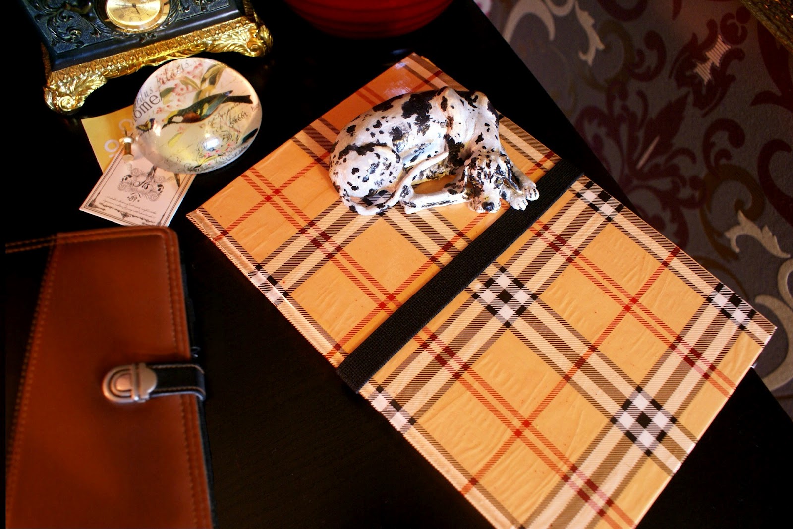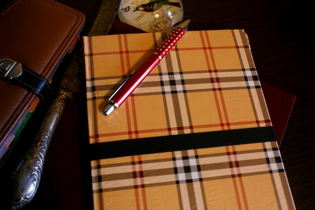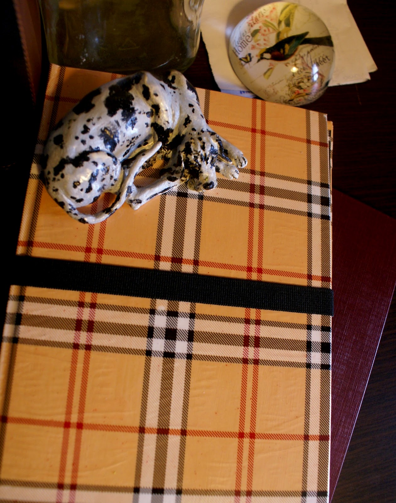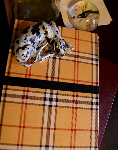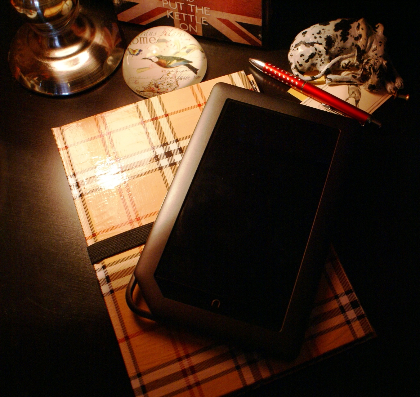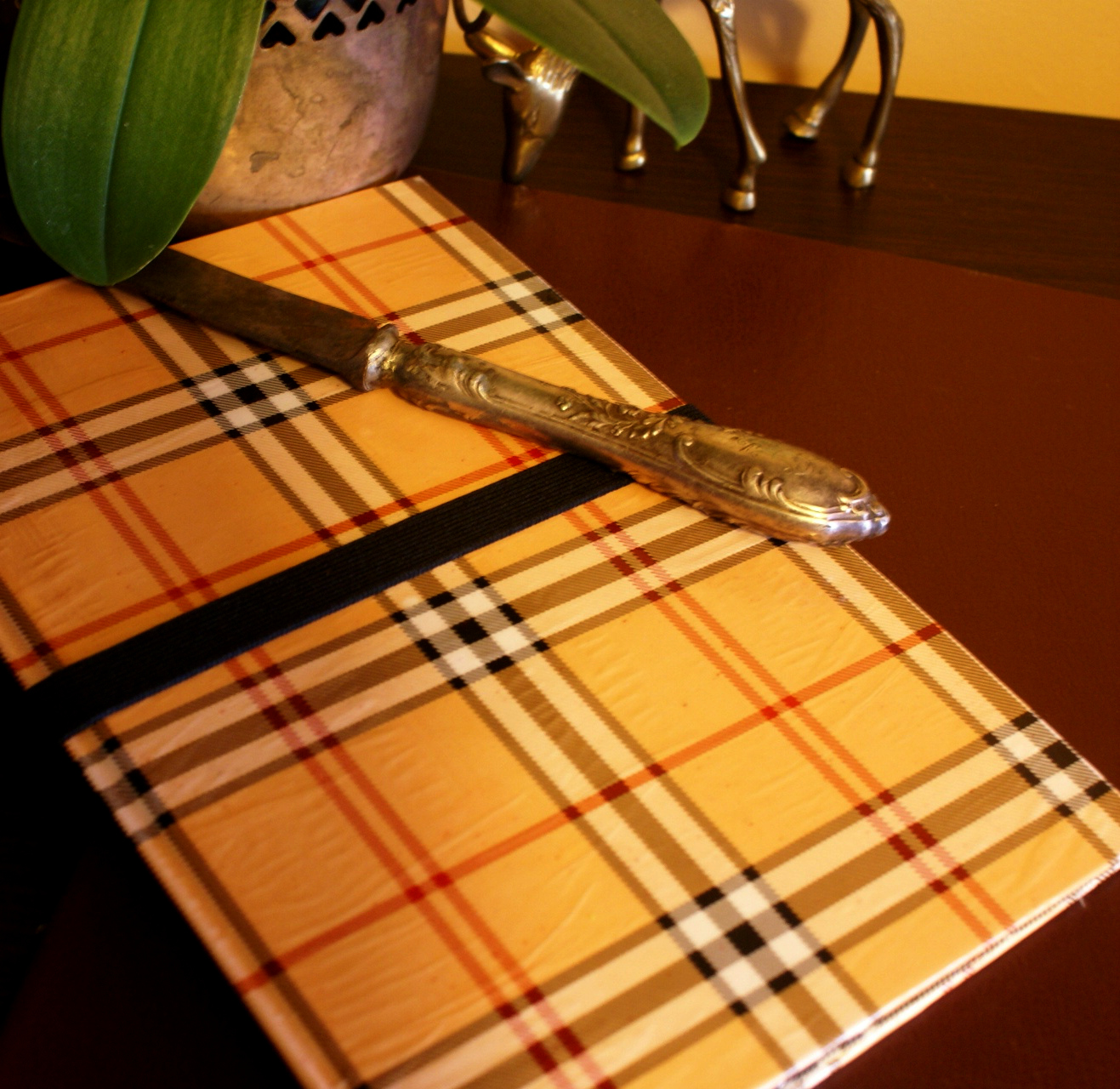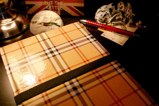 Wykonanie jest bardzo proste: wzięłam zeszyt z twardą okładką i wycięłam kartki. Później okleiłam wszystko papierem do prezentów, który specjalnie w tym celu kupiłam (spodobała mi się krata w stylu Burberry :P). Użyłam kleju Mod Podge. Następnie na prawej stronie przykleiłam gumkę dosyć długą, żeby bez problemu obejmowała całe etui. Na to na wszelki wypadek przykleiłam wzdłuż brzegu kawałek materiału dla ochrony ekranu. Później osobny kawałek tektury obkleiłam czarnym papierem, a w rogach zamontowałam gumki i całość przykleiłam wewnątrz etui po prawej stronie. Brzmi trochę zawile, ale ze zdjęć da się to wszystko wywnioskować 🙂
