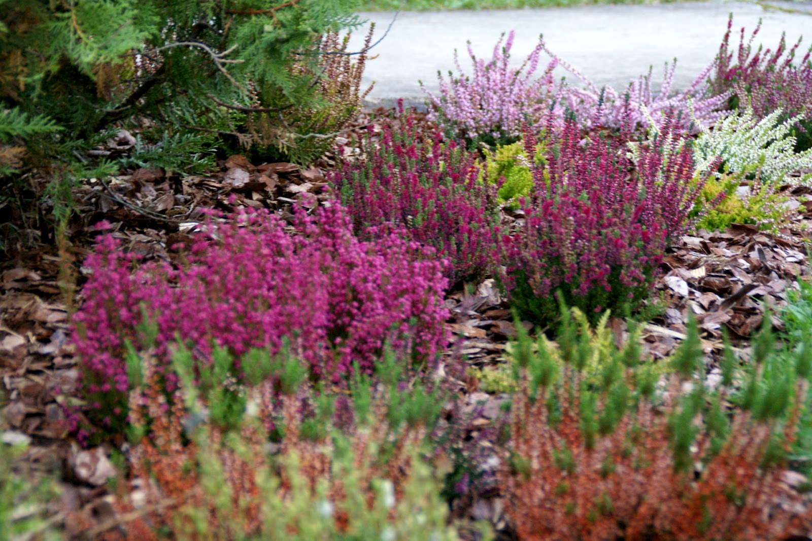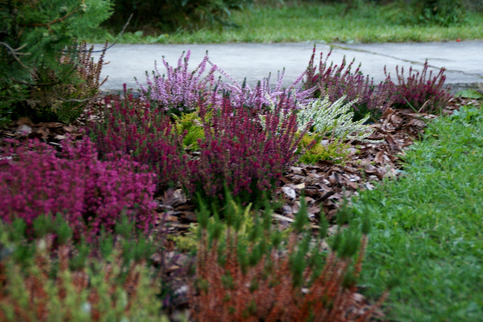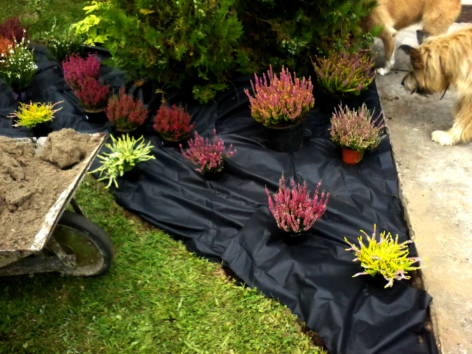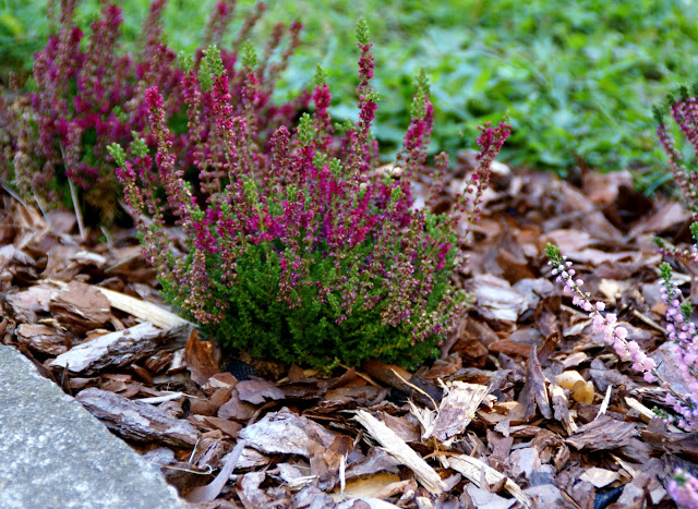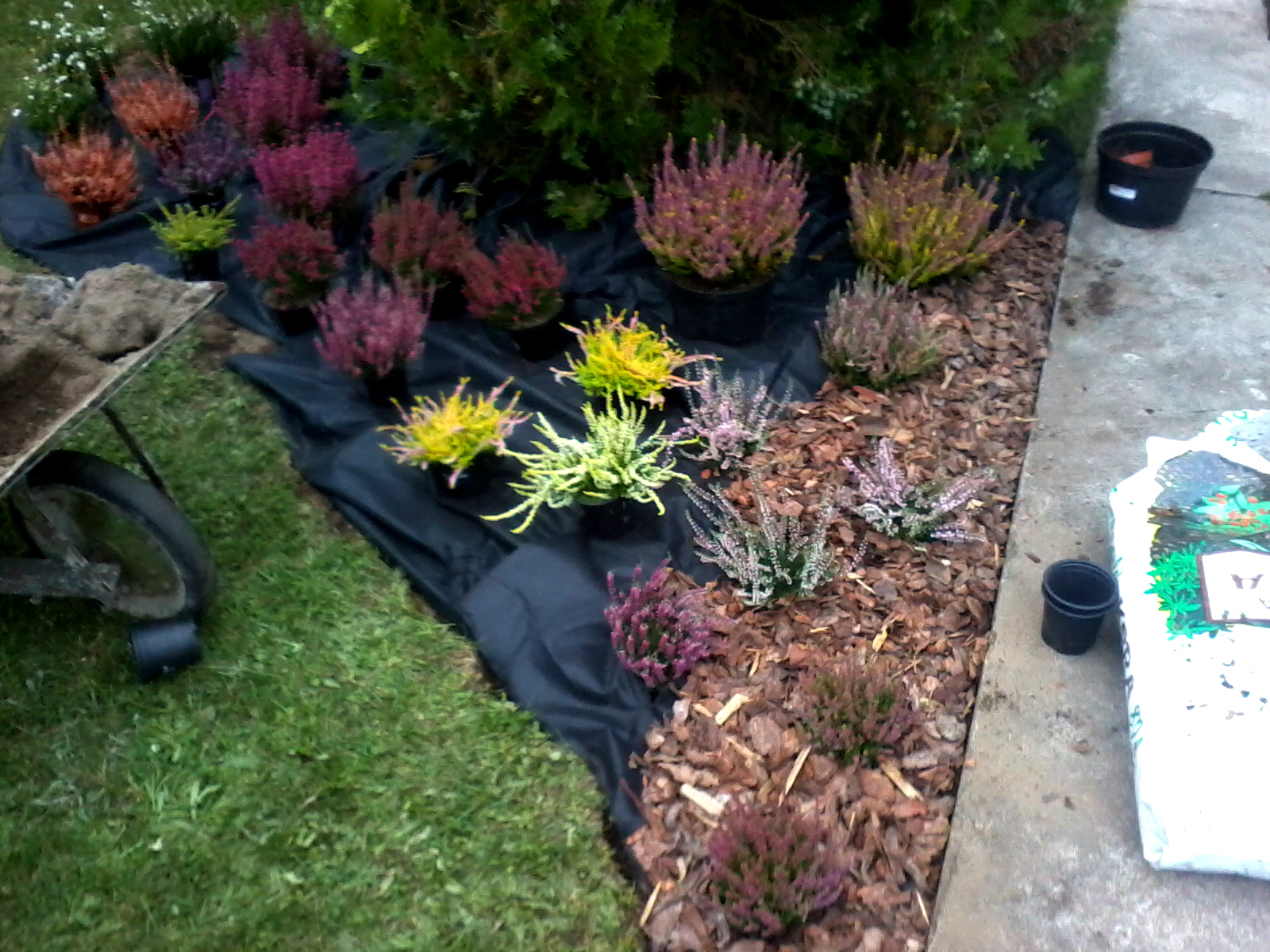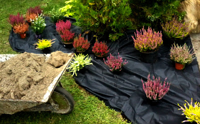 Ja w sumie zasadziłam 28 wrzosów w kilku odmianach (najlepiej sadzić je w grupach – co najmniej po 3 sztuki z każdego gatunku, dzięki temu unikniemy 'pstrokacizny’). Poza tym zużyłam też trzy worki ściółki dla wrzosowatych (bardzo kwaśne podłoże – torfowe, ph 3,5-5), dwa worki ziemi kwiatowej uniwersalnej i dwa worki kory. Sadząc wrzosy i wrzośce koniecznie trzeba postarać się o porządne przygotowanie miejsca, w którym będą rosły. W związku z tym spędziłam cały pierwszy dzień na przekopywaniu, a właściwie wykopywaniu ziemi – usunęłam ją na głębokość ok. 20cm i zamieniłam na mieszankę podłoża torfowego, ziemi uniwersalnej i miejscowej ziemi. Później rozłożyłam agrowłókninę i porozstawiałam wrzosy na swoich miejscach. Przez cały następny dzień sadziłam rośliny i obsypywałam je korą (która dodatkowo będzie zakwaszała podłoże). Ważne jest żeby wrzosy sadzić w odległości ok. 15-25cm, przy czym większe gatunki mogą wymagać nawet 40cm wolnej przestrzeni na rozrost.