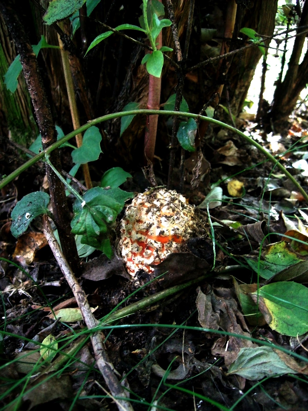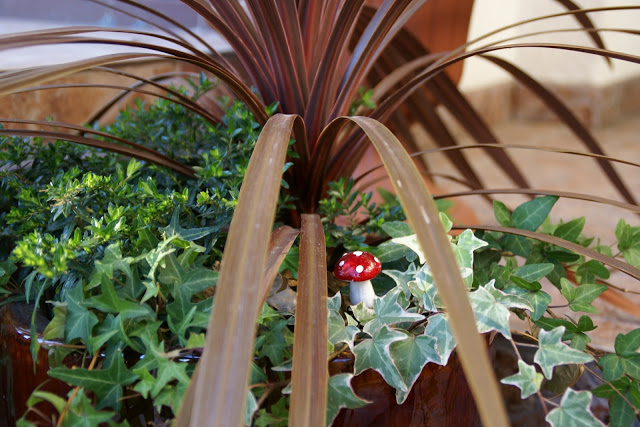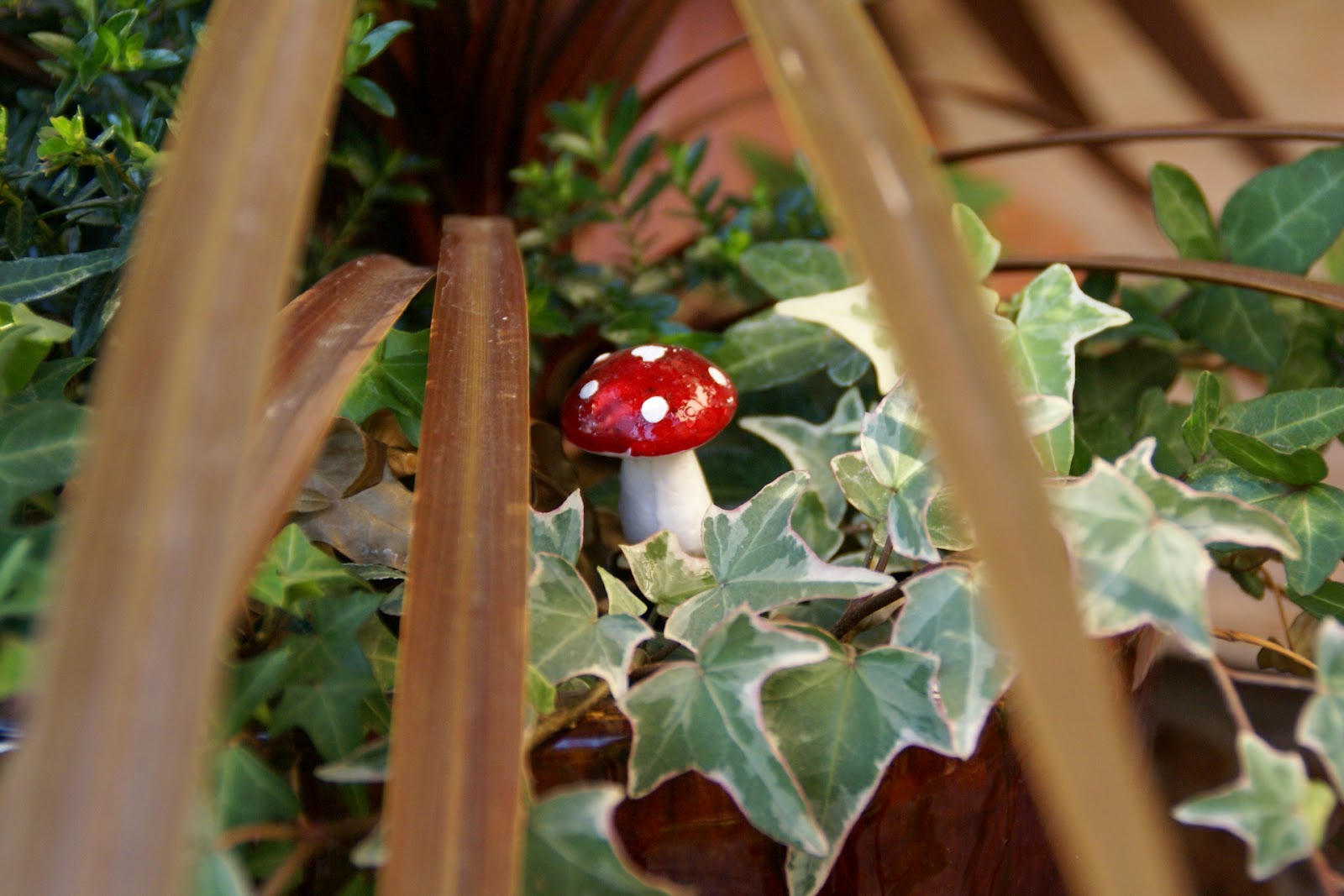 Było o prawdziwych muchomorach, więc pokażę jeszcze jednego, który zagnieździł się w donicy z bluszczem i trawą 🙂
