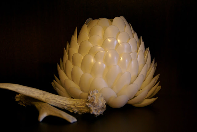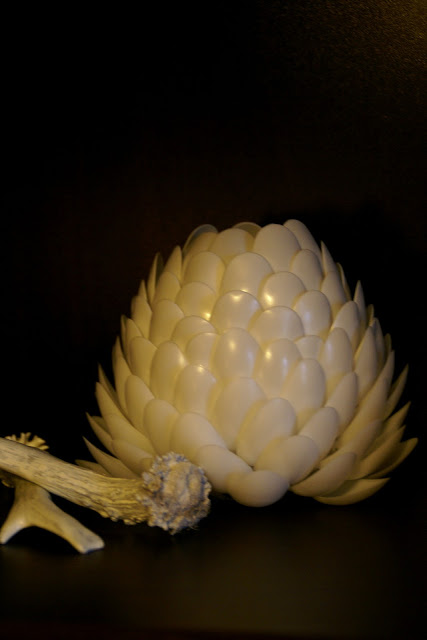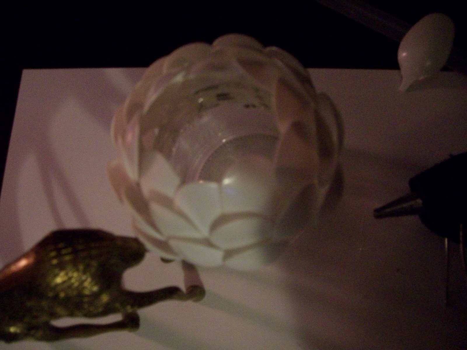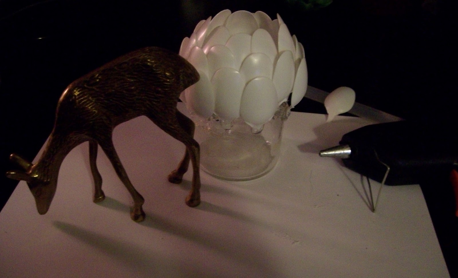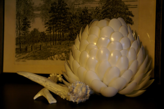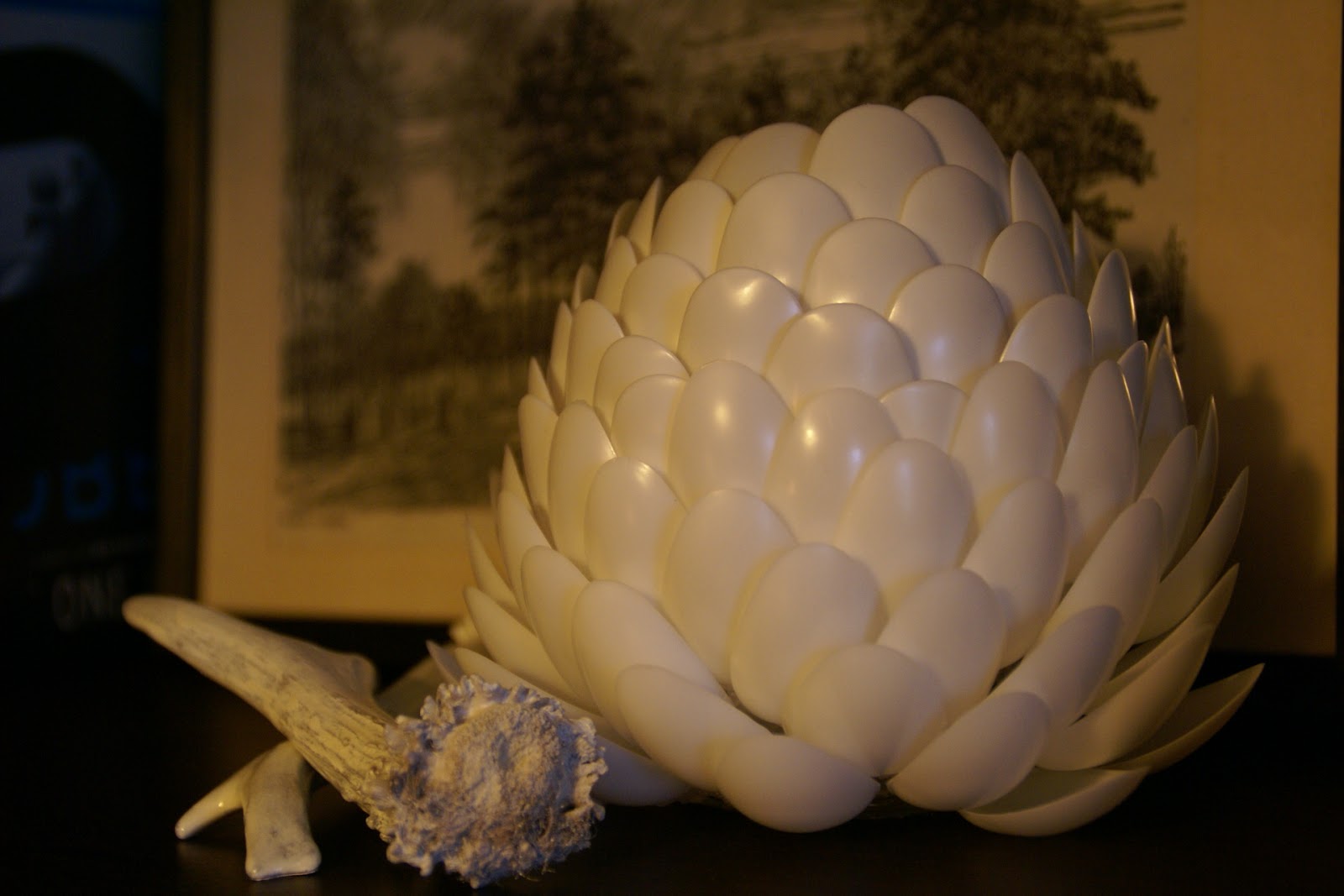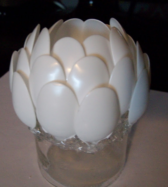 I co? Karczoch? Nie karczoch? 😉  A może ktoś zgadnie z czego go zrobiłam? Ktoś myślał, że to z tipsów 😛 Ale nie, to po prostu plastikowe łyżeczki, poodcinałam uchwyty a łebki przykleiłam klejem na gorąco do słoika (znowu zdj zrobione komórką):