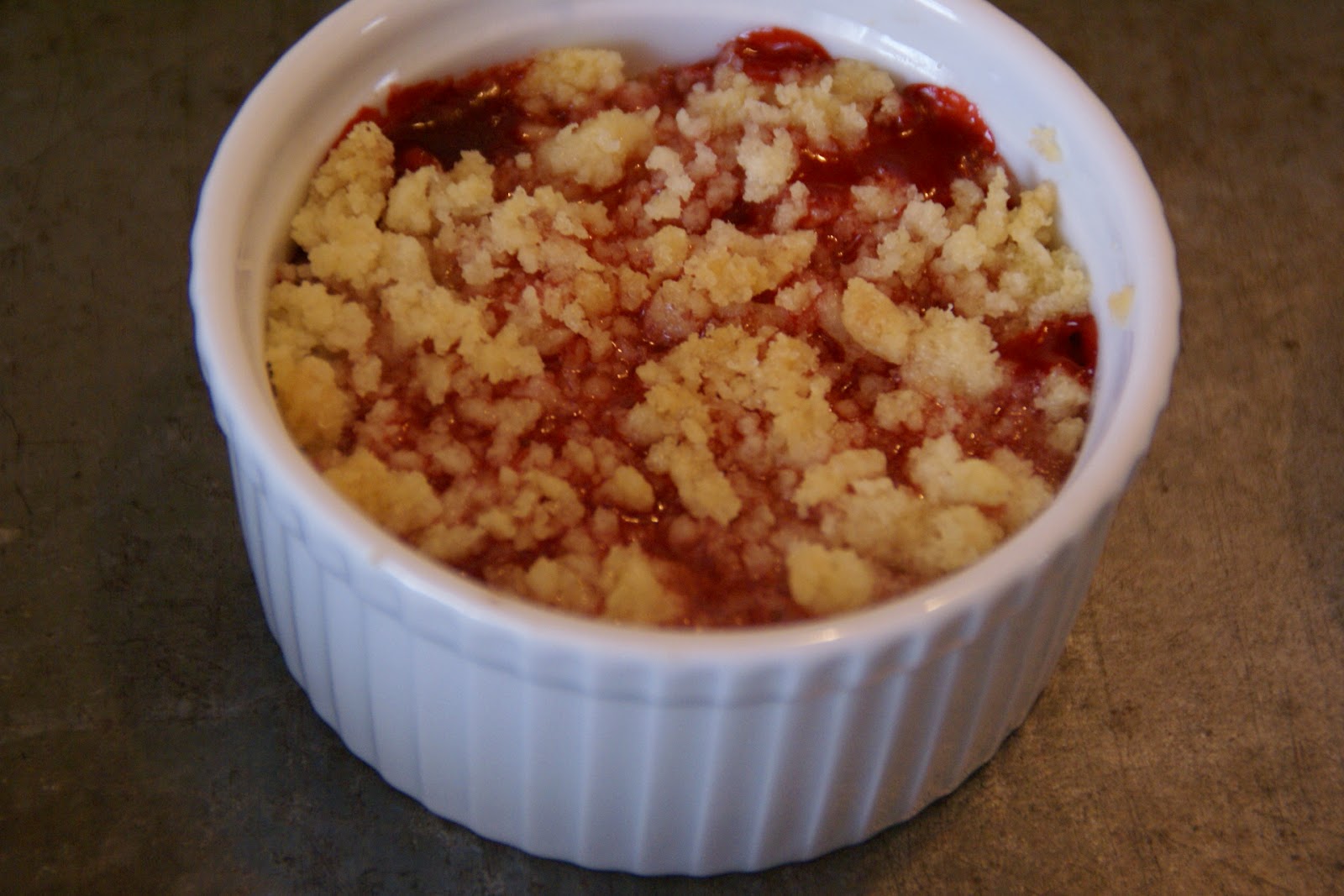 Następnie ułożyłam kilka truskawek na dnie każdego z naczyń i przysypałam kruszonką – drobne kawałeczki. Podobno dobrym sposobem jest też użycie tarki dla uzyskania ładnych kuleczek.