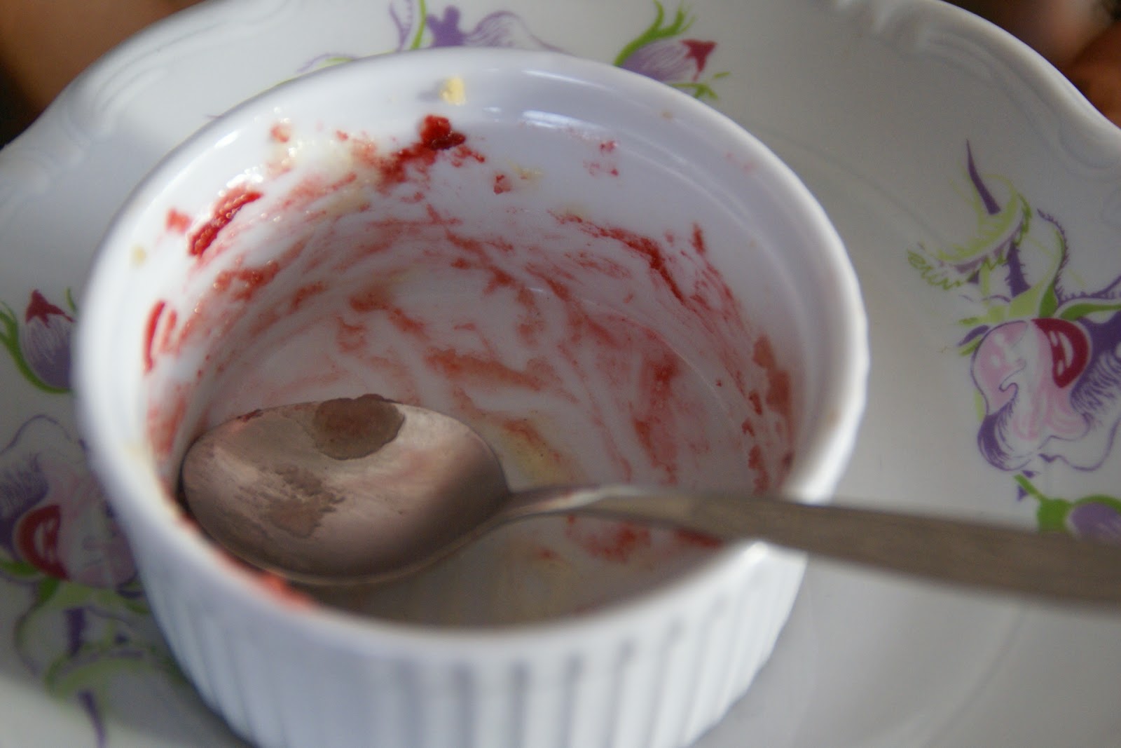 Deserek zaskakująco szybko zniknął… Genialne połączenie gorącego z zimnym. Ale teraz kiedy znam już ten „sekretny sekret” jego przyrządzania, na pewno często będzie się pojawiał na moim talerzu 🙂 No właśnie, co do talerzy, to dobrze jest postawić kokilki na jakimś talerzyku, żeby swobodnie sobie z nim wędrować. Deser powinno się zjeść gorący od razu po wyjęciu z piekarnika, więc nie bardzo można te porcelanowe naczynia dotykać.