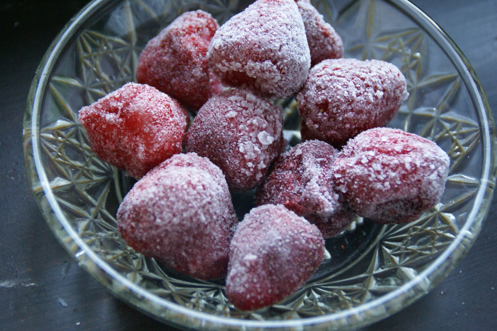 Najpierw wyciągnęłam z paczki tyle truskawek ile było mi potrzebne, czyli ok. 5-6 sztuk do każdego deseru. Zostawiłam, żeby sobie spokojnie roztajały, a w między czasie zaczęłam robić kruszonkę.