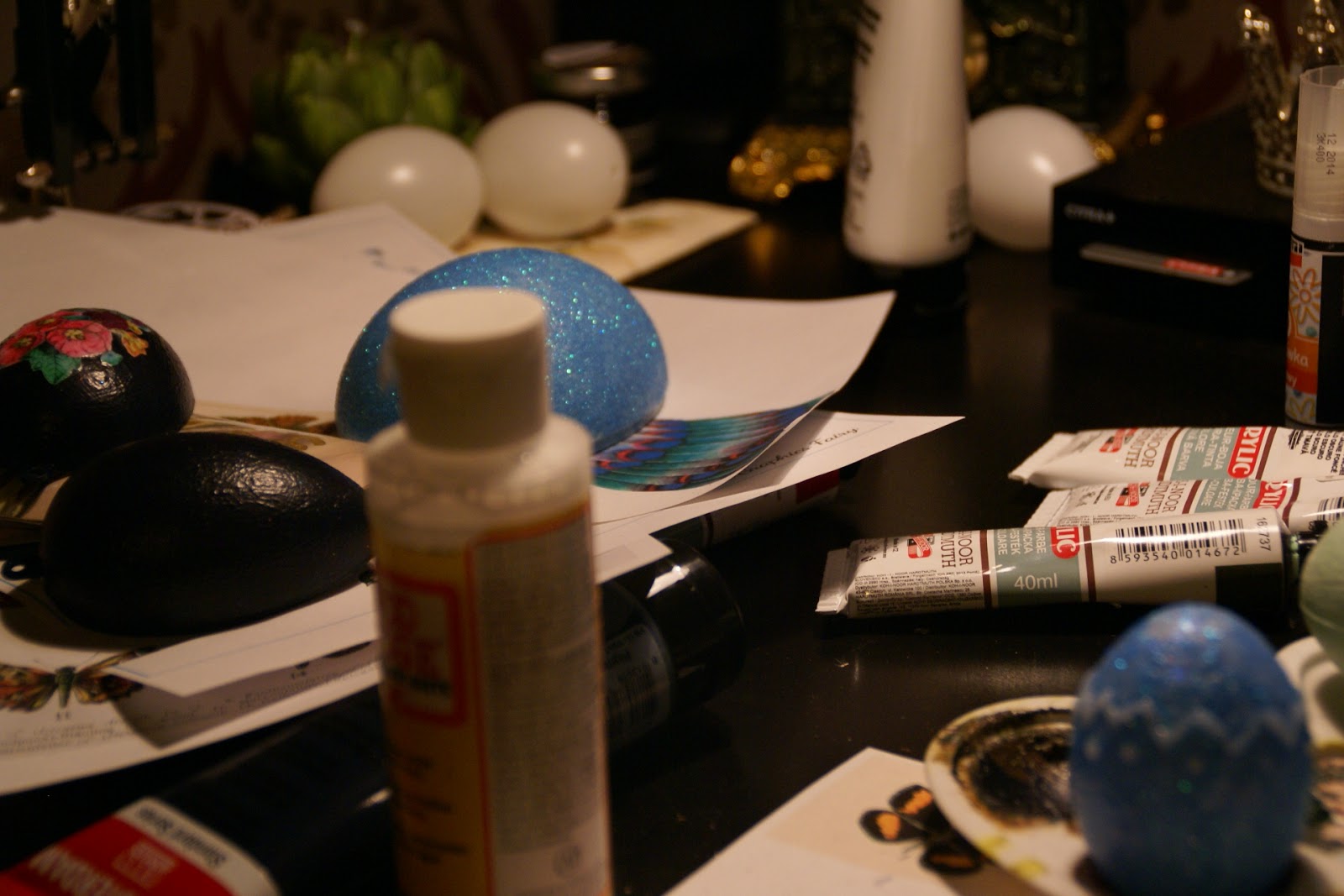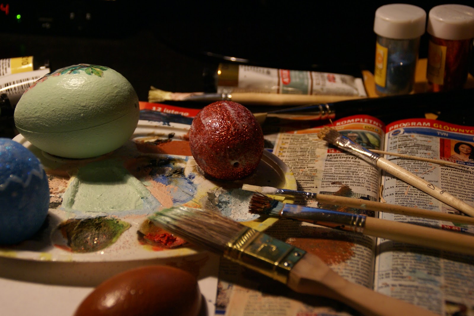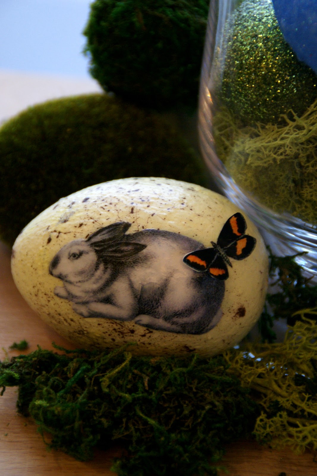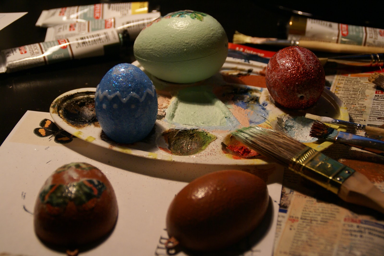 Jestem bardzo zadowolona z tego brokatowego jajka 🙂 polakierowane, żeby wszędzie nie walał się brokat – jedna z najbardziej irytujących rzeczy jakie przychodzą mi w tym momencie do głowy – raz się dotknie i przez najbliższy tydzień znajduję brokat na twarzy, ubraniach, meblach…psie 😛