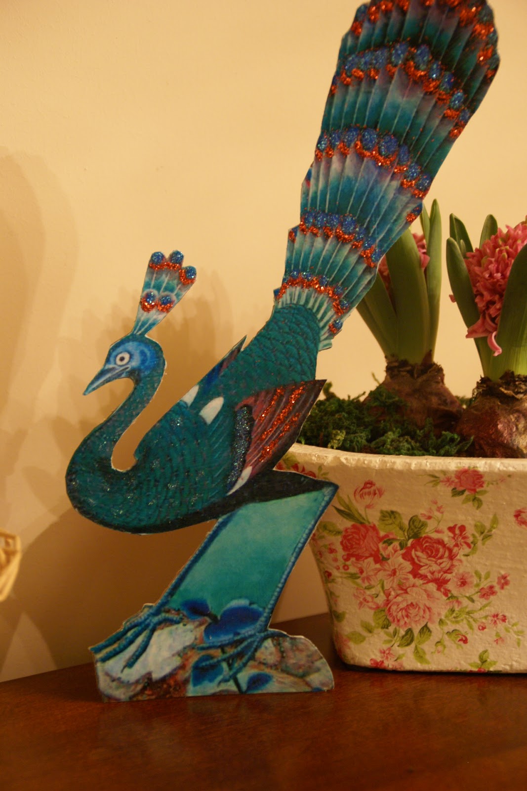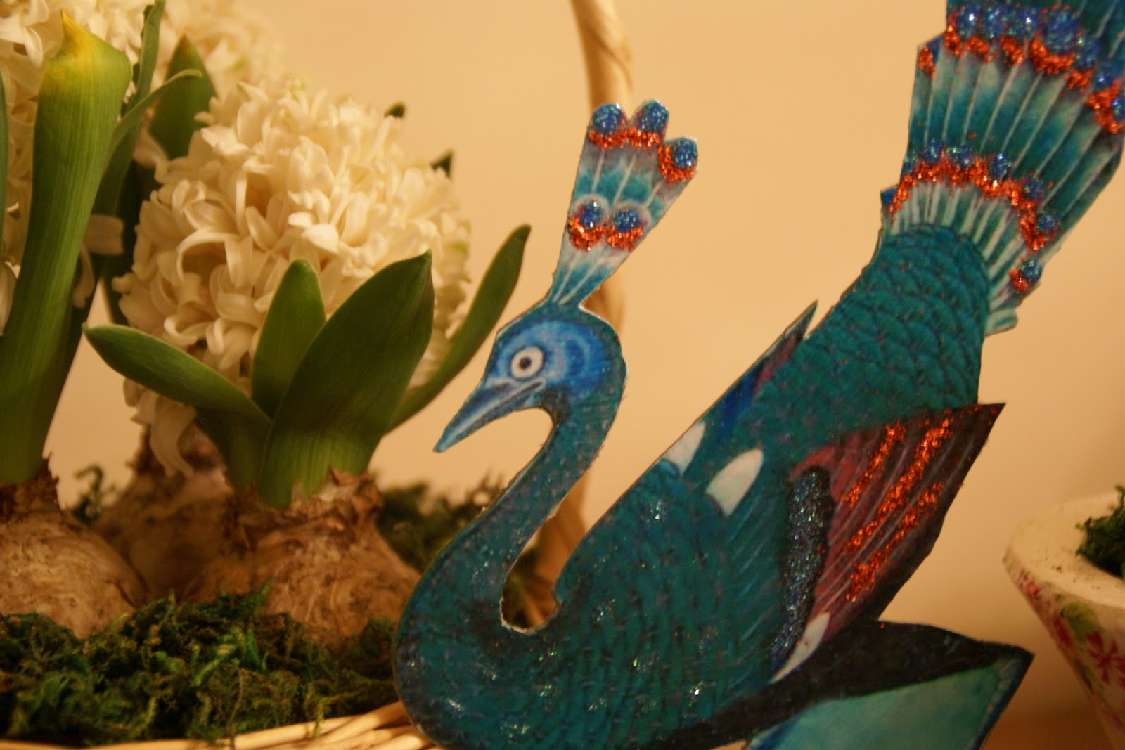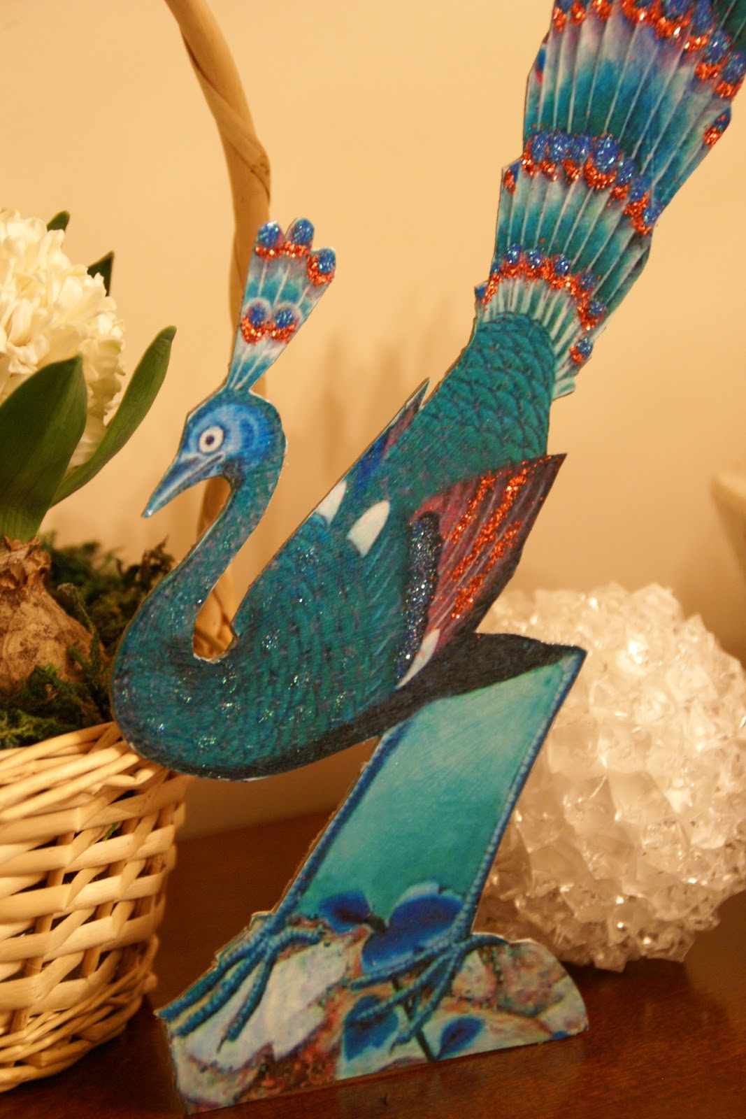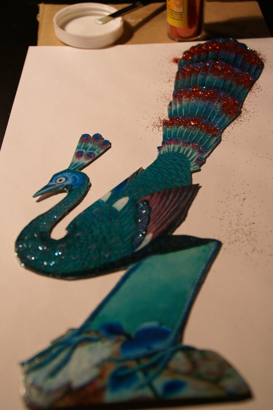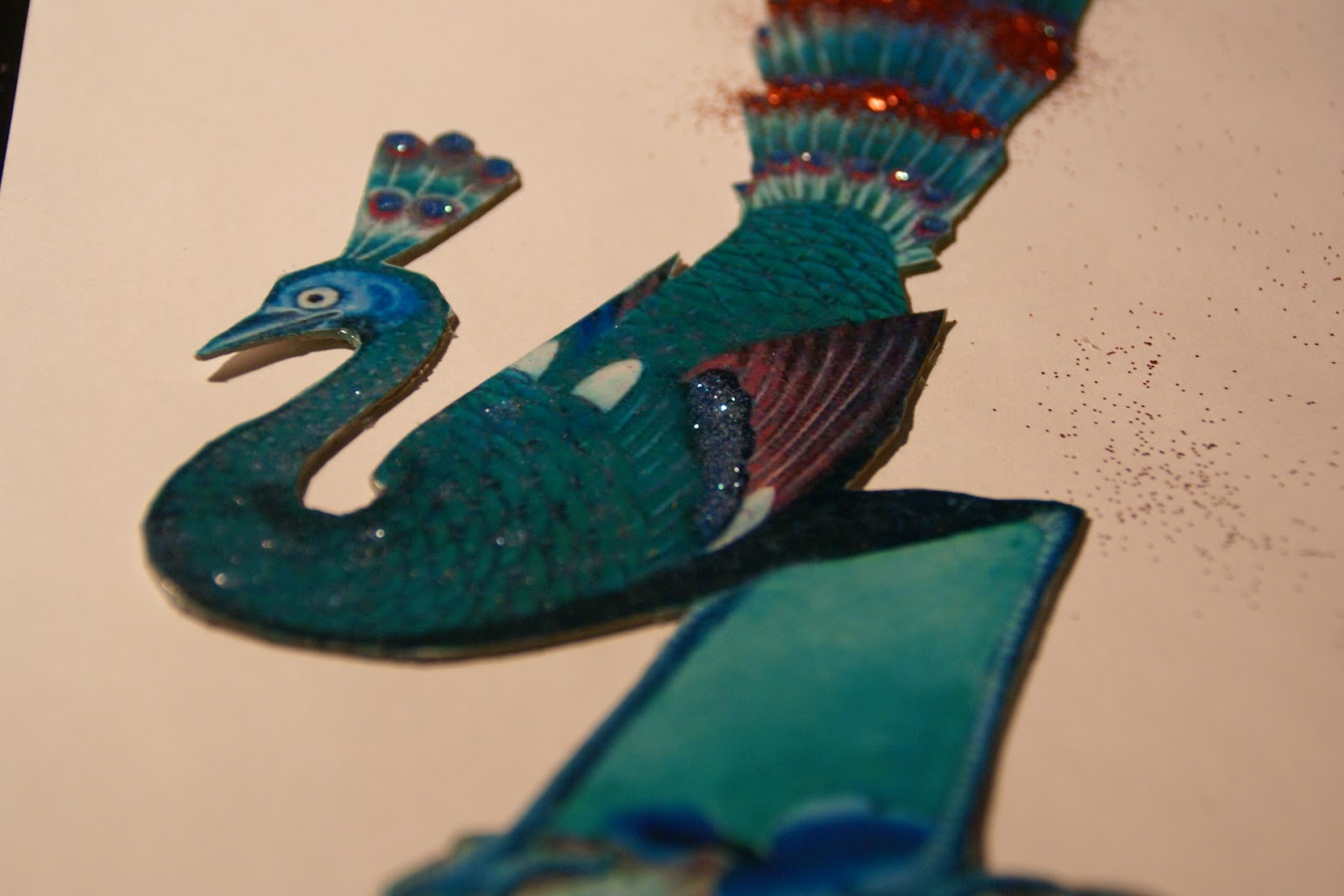 Następnie polakierowałam Mod Podge (dwie warstwy), po wyschnięciu cienkim pędzelkiem pomalowałam warstewkę Mod Podge na niebieskich oczkach pawia i szybko posypałam niebieskim brokatem (allegro-2zł za kolor). Poczekałam aż wyschnie i potrząsnęłam, żeby pozbyć się nadmiaru.