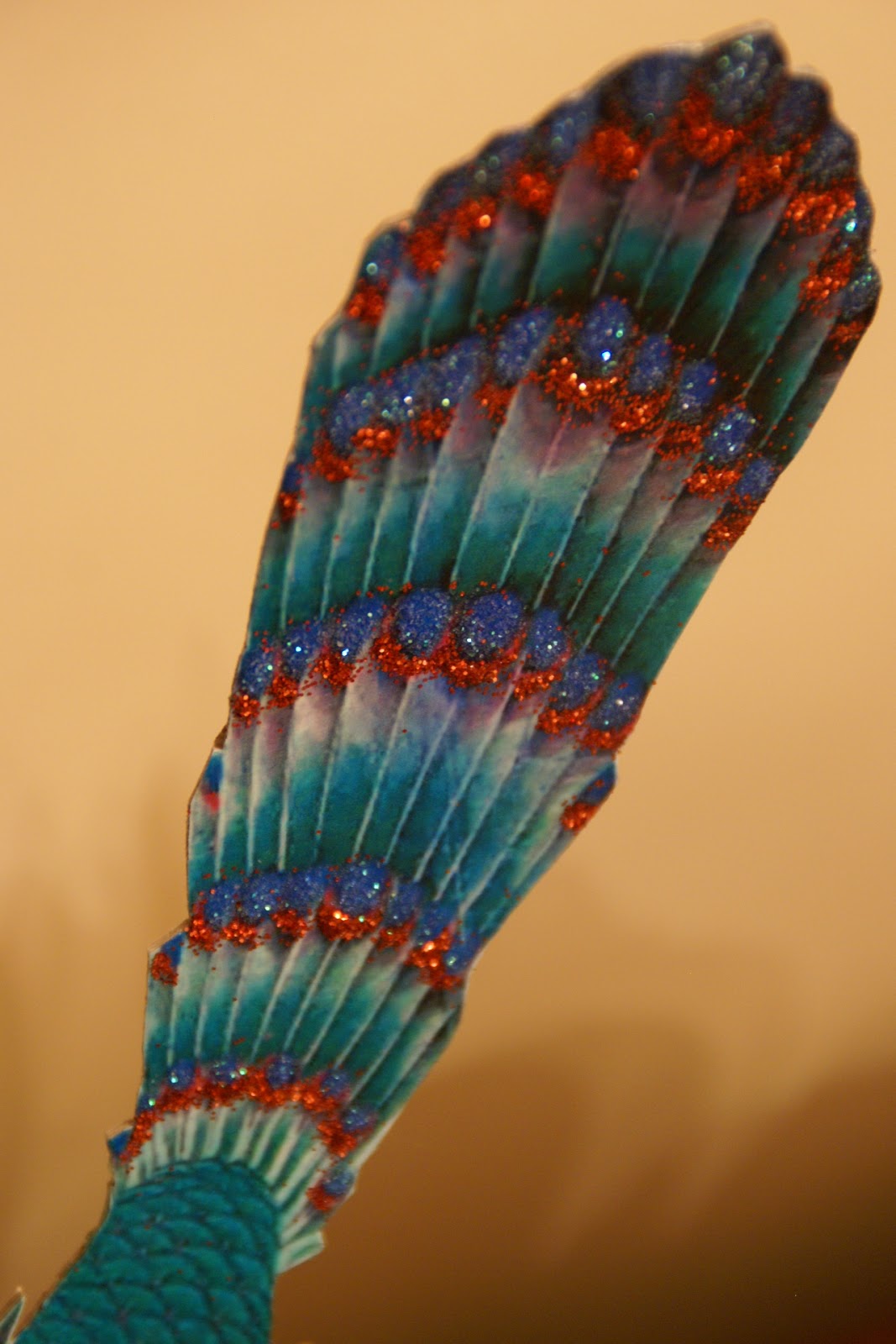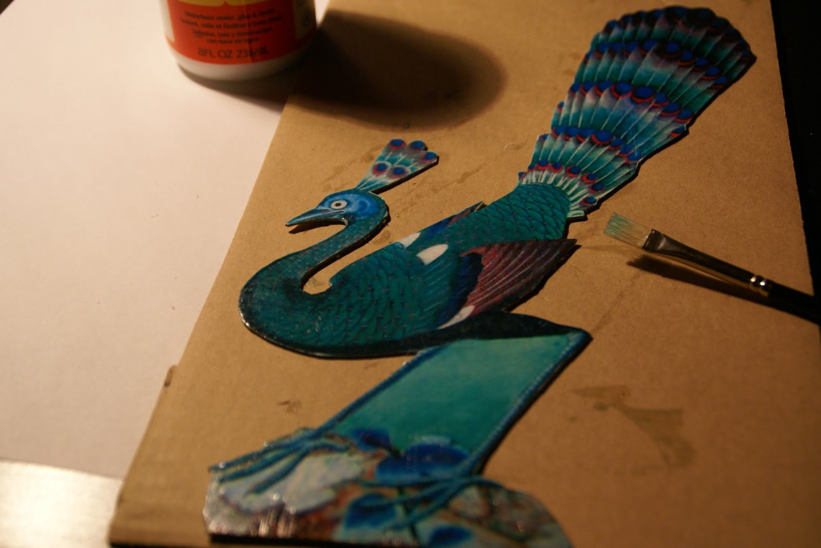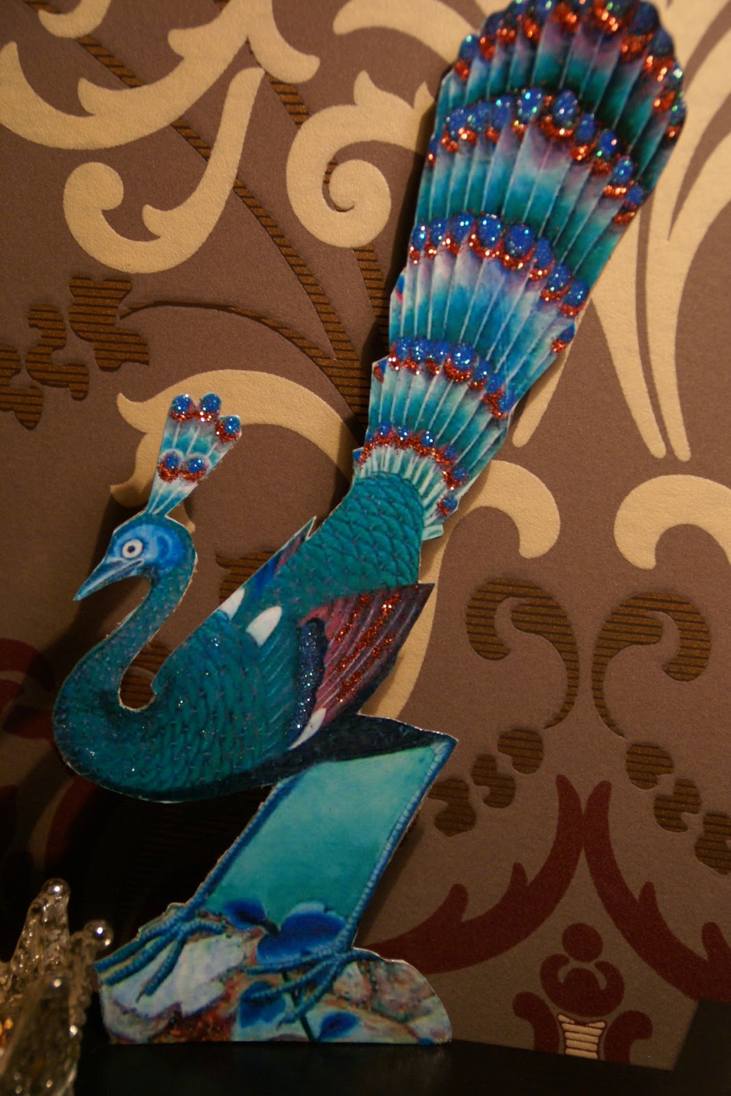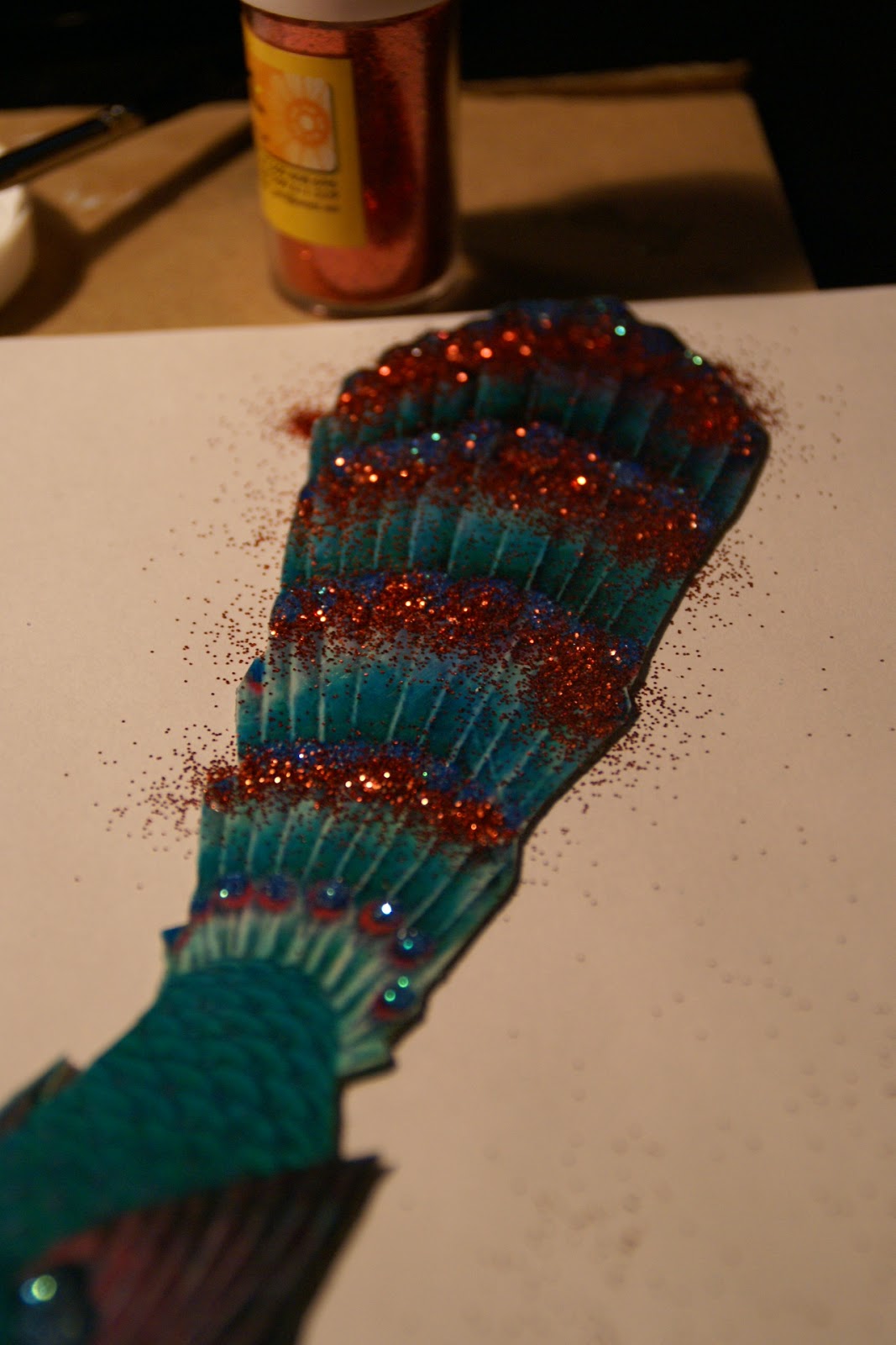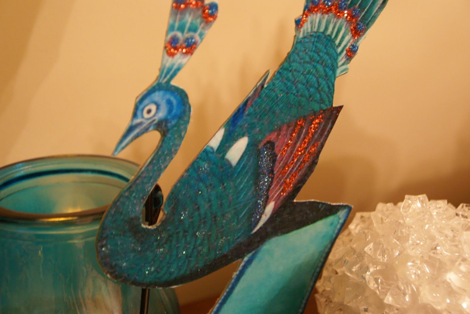 Następnie polakierowałam Mod Podge (dwie warstwy), po wyschnięciu cienkim pędzelkiem pomalowałam warstewkę Mod Podge na niebieskich oczkach pawia i szybko posypałam niebieskim brokatem (allegro-2zł za kolor). Poczekałam aż wyschnie i potrząsnęłam, żeby pozbyć się nadmiaru.