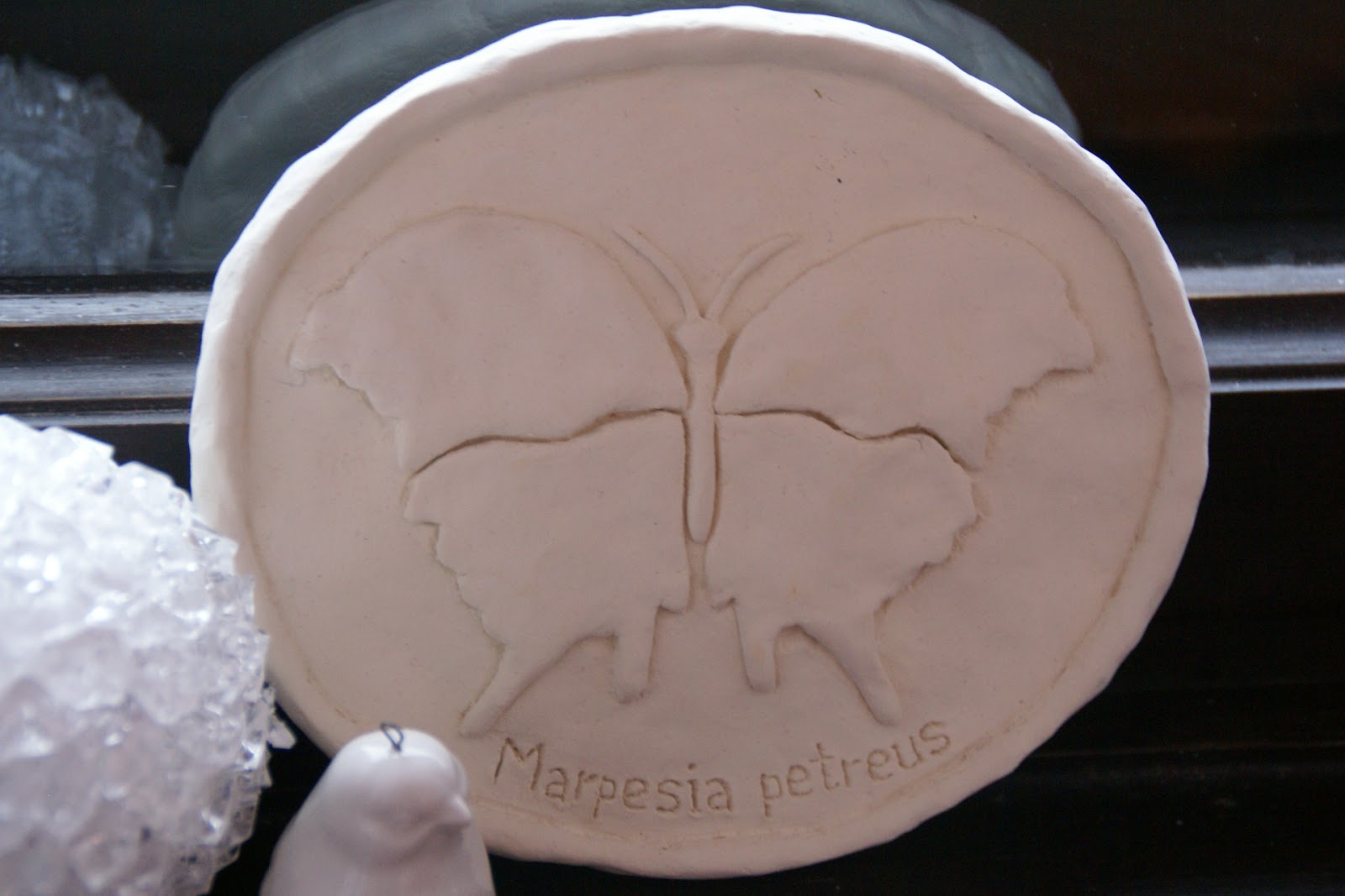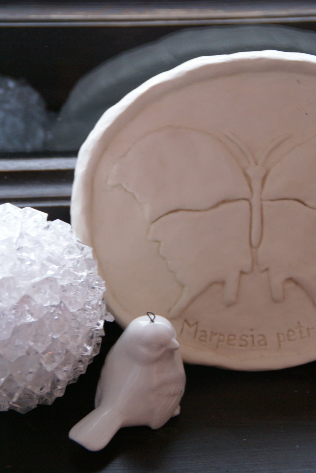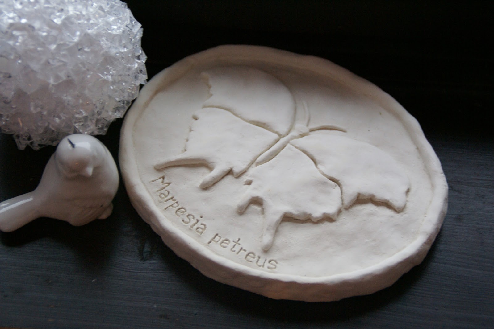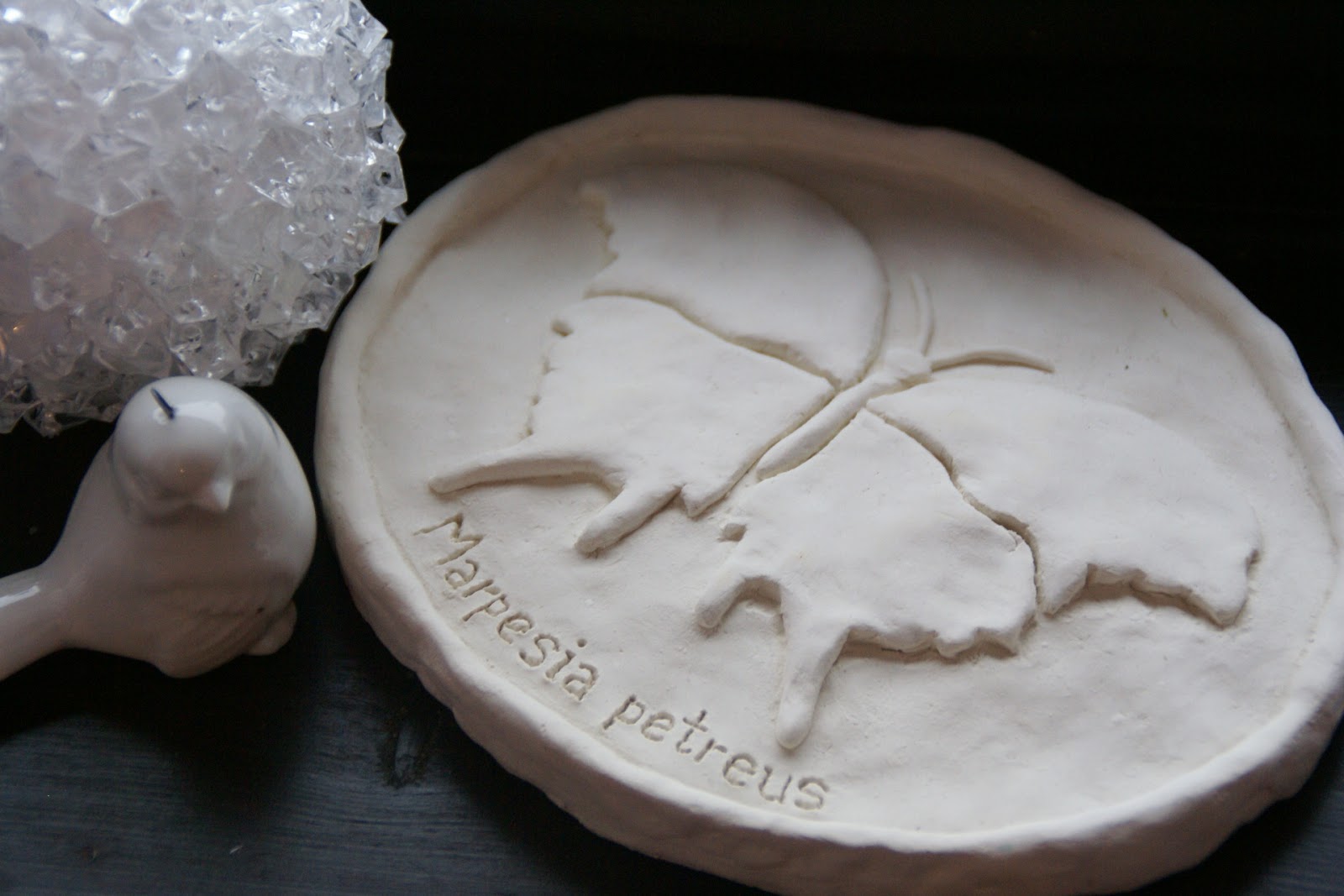 No i ostatni dzisiaj: Motylek. Znalazłam ten pomysł na pottery barn. Coś takiego robiła też Lucy z craftberrybush. Nic prostszego, bierzemy kawał gliny i maziamy aż wyjdzie z tego motyl 😛