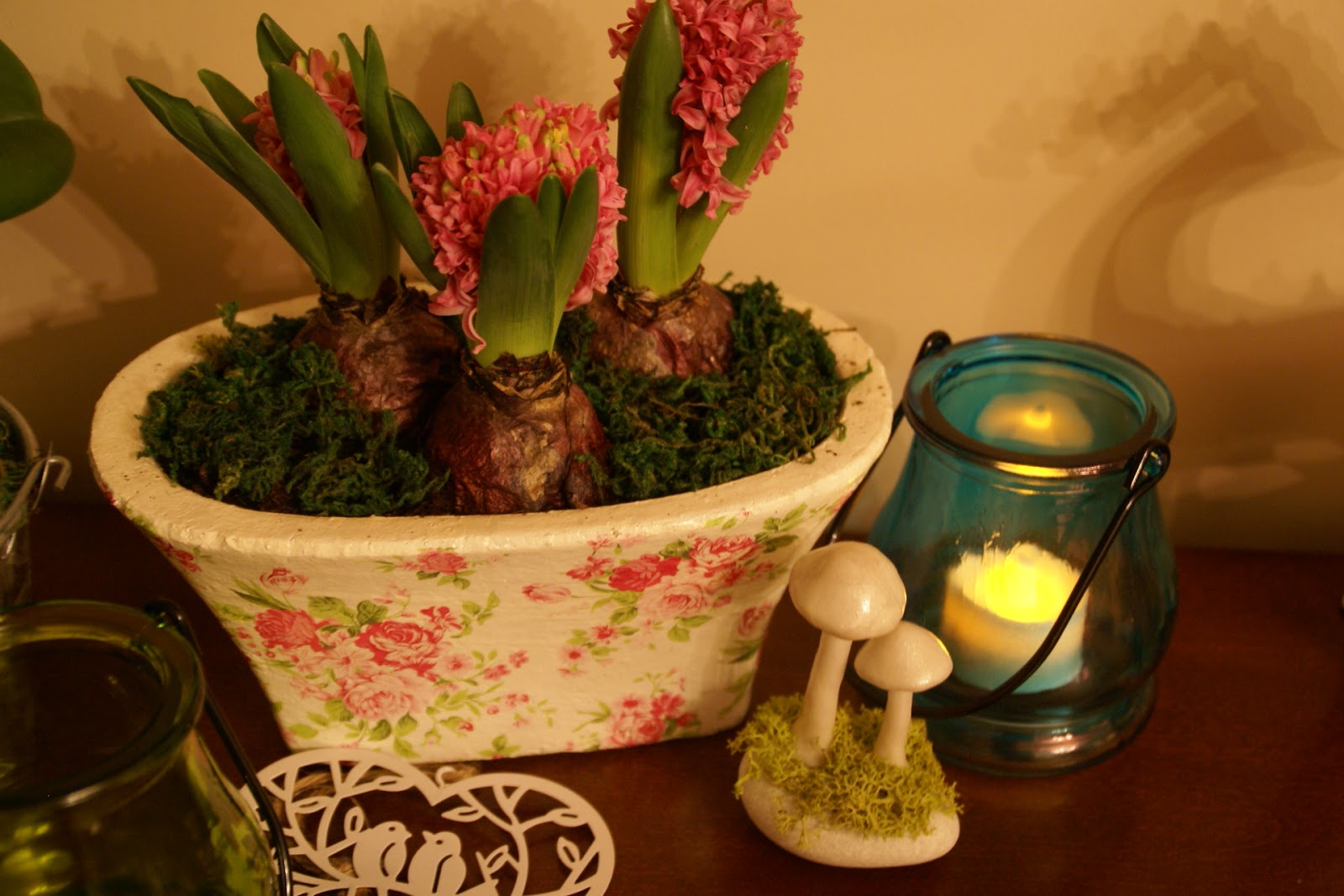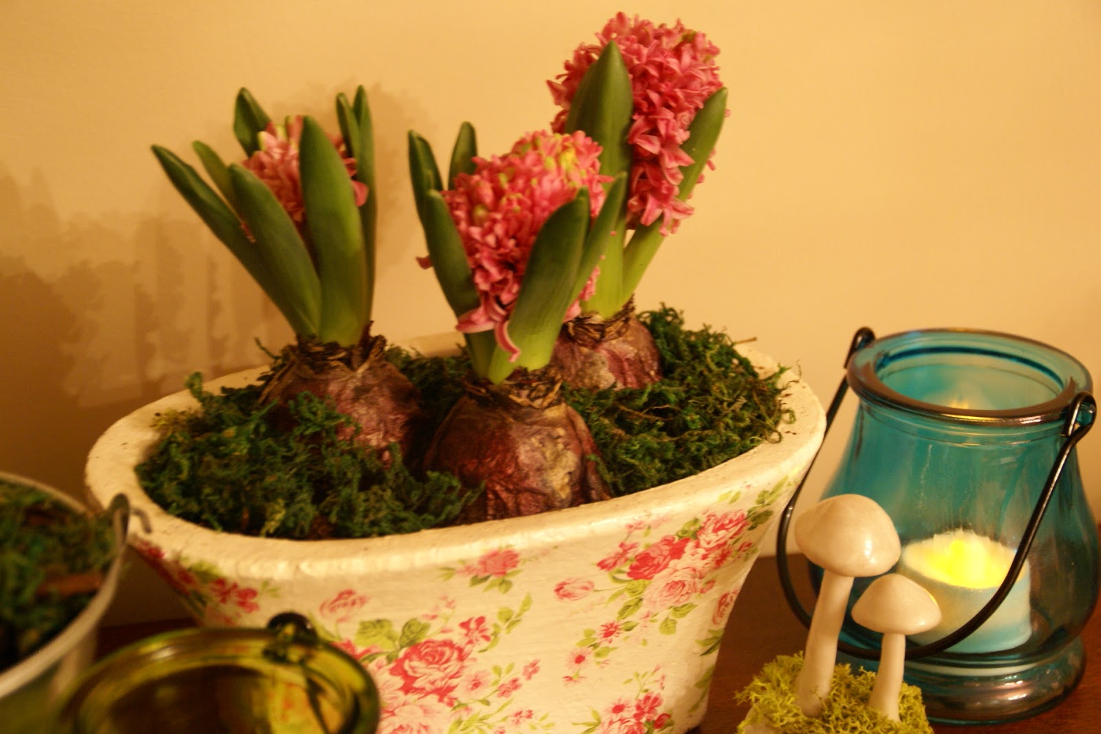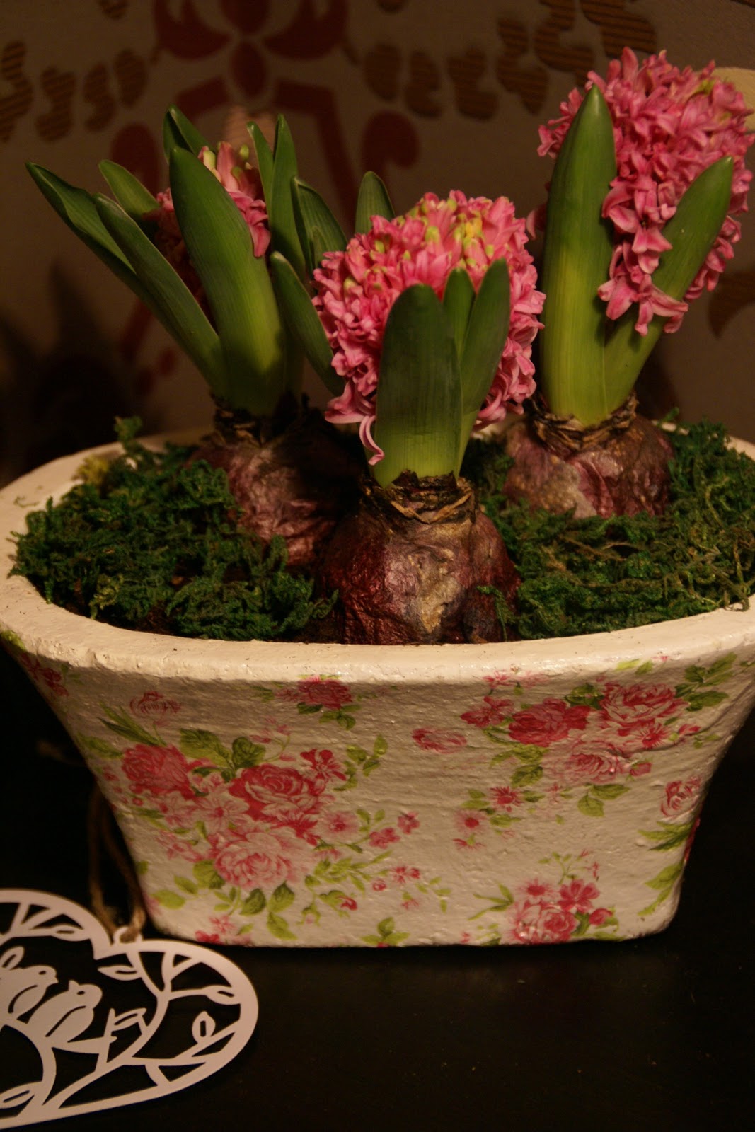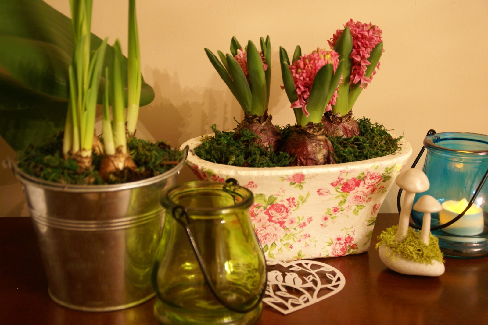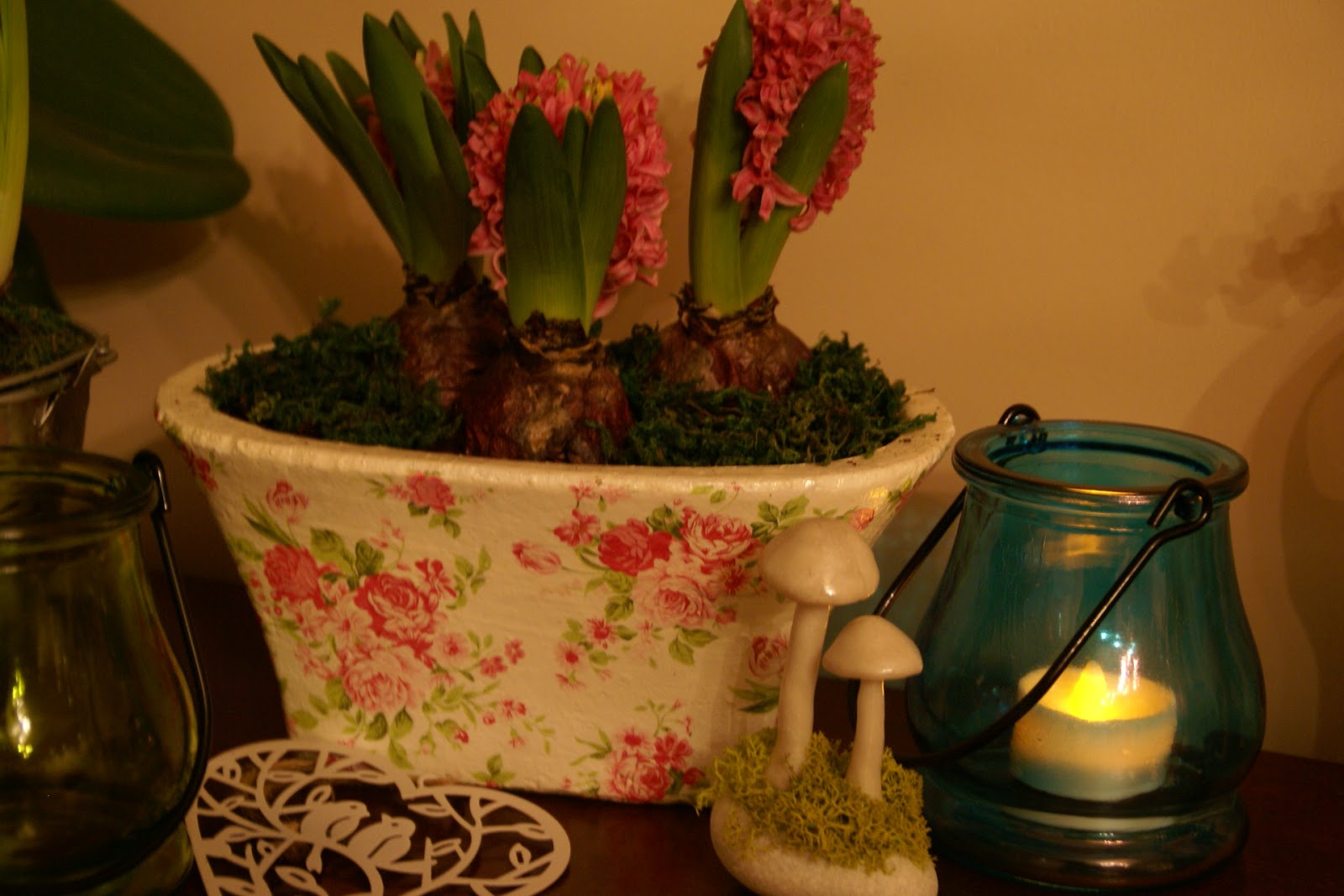 Kupiłam w Auchan hiacynty i narcyzy w plastikowych doniczkach, w domu wygrzebałam wszystko co by się nadawało do przesadzenia i zaczęłam zabawę 😛