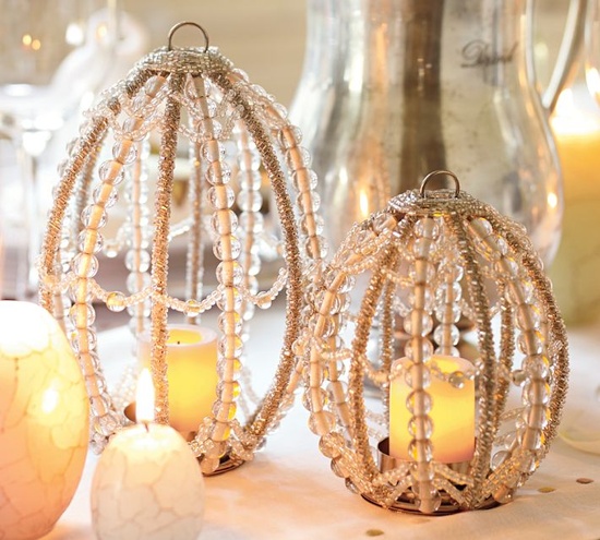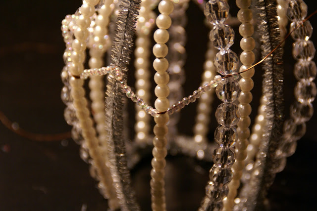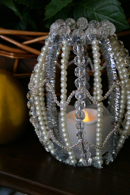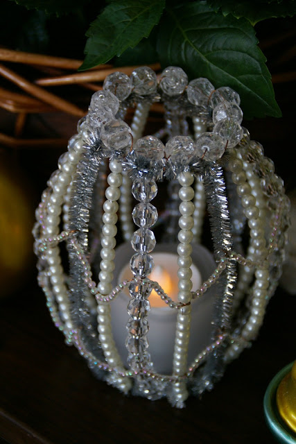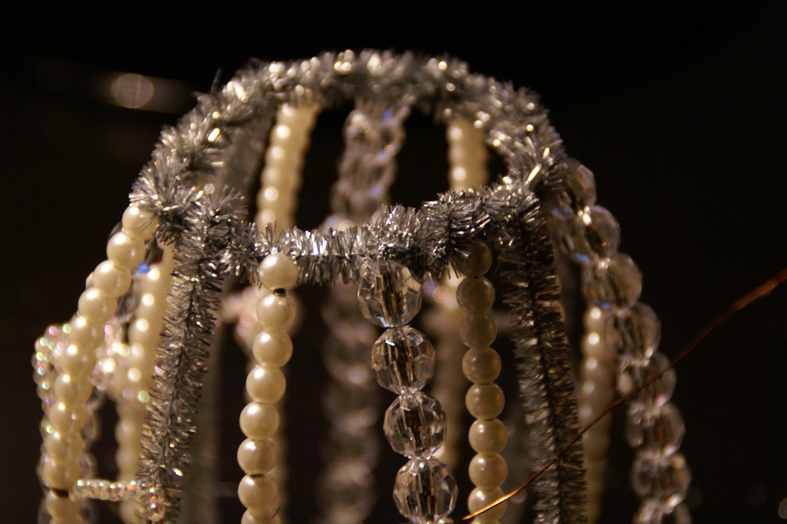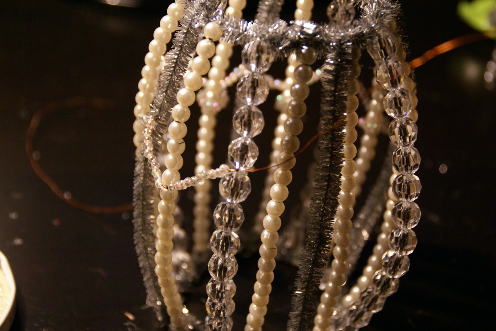 Zaczęłam od zrobienia dolnej „obręczy” z drucika (wielkość dopasujcie do swojej świeczki). Na zdjęciu akurat górna obręcz, ale na dole jest taka sama tyle, że większa. Cztery srebrne druciki od razu przyczepiłam do dolnego kółka w równych odstępach (czyli akurat po jednym z każdej „strony świata”, że tak powiem). Później na cztery kolejne takie druciki nawlekłam po 13 dużych przezroczystych koralików (na poniższym zdj. to te największe). Przyczepiłam je pomiędzy srebrnymi drucikami. Następnie zrobiłam to samo z 8 kawałkami drucika;) używając mniejszych mlecznych perełek i umieściłam je pomiędzy każdym z już gotowych drucików.