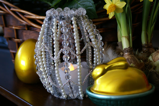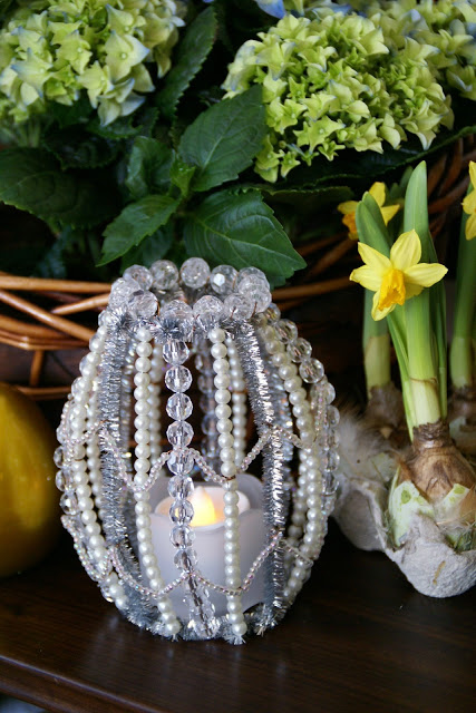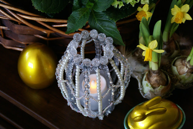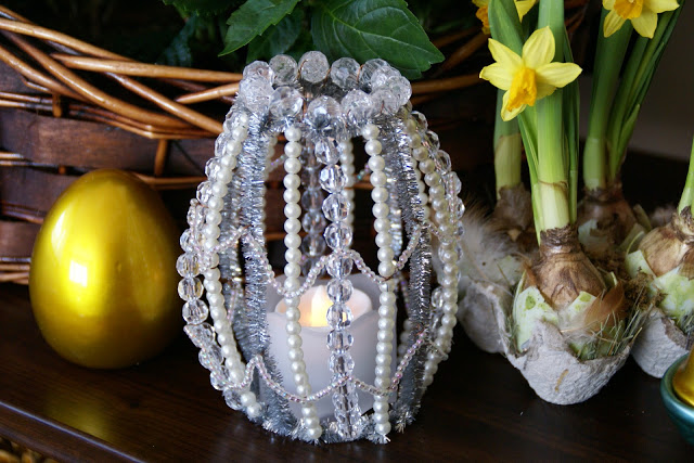 Następnie zrobiłam mniejszą obręcz na górę i przymocowałam do niej wszystkie druciki z dolnej obręczy. Kolejnym etapem było umocowanie cienkiego brązowego drucika na wybranej wysokości pomiędzy perełkami. Nawlekłam na nie najmniejsze, przezroczyste kuleczki – tyle ile zmieści się pomiędzy każdą „kolumną” (już nie wiem jak to nazywać, więc wybaczcie:P) po czym znowu okręcałam drucik w okół następnej kolumny i nawlekałam kolejną porcję koralików. I tak w kółko aż objechałam całe jajko.