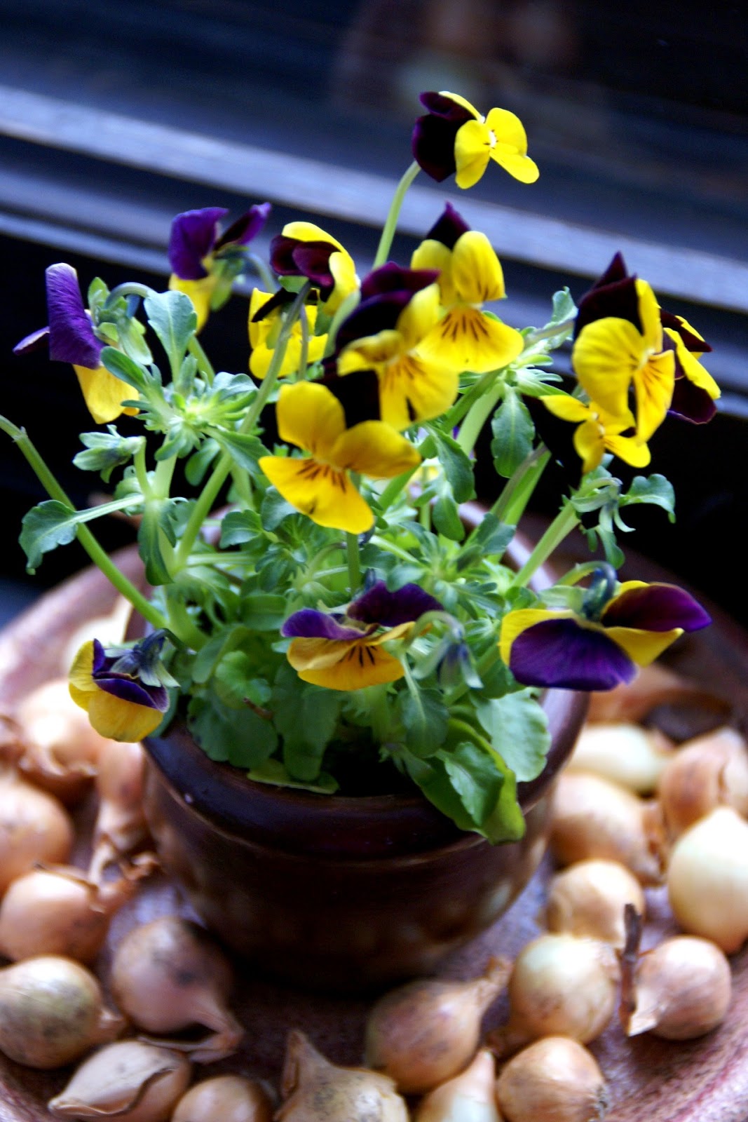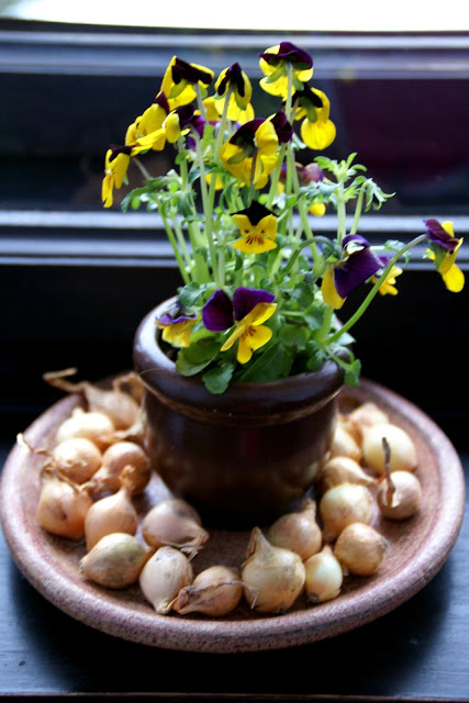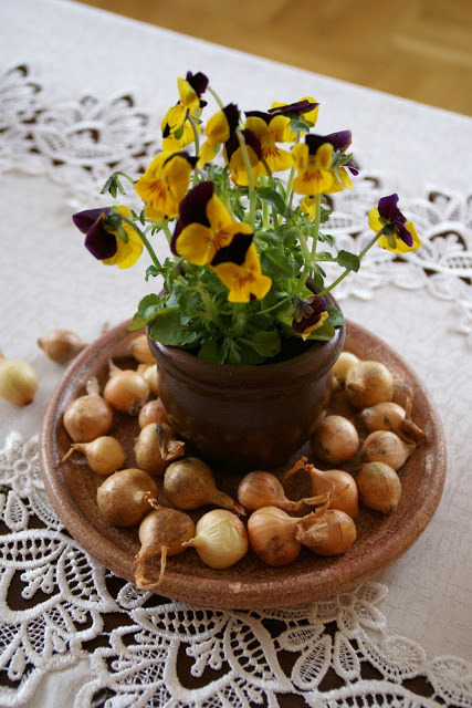 No i jeszcze bratki, miały być pod kloszem, ale okazał się za niski o jakieś 2cm :/ w takim wypadku postanowiłam zostawić je tak jak są, obsypałam tylko cebulkami dla ozdoby.