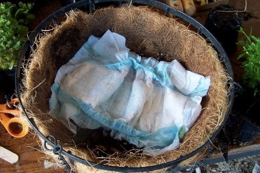 Tak, dobrze widzicie, pieluchy w doniczce 😉 Podobno fachowcy polecają je na dno donic – pomagają długo utrzymać wilgoć w glebie.