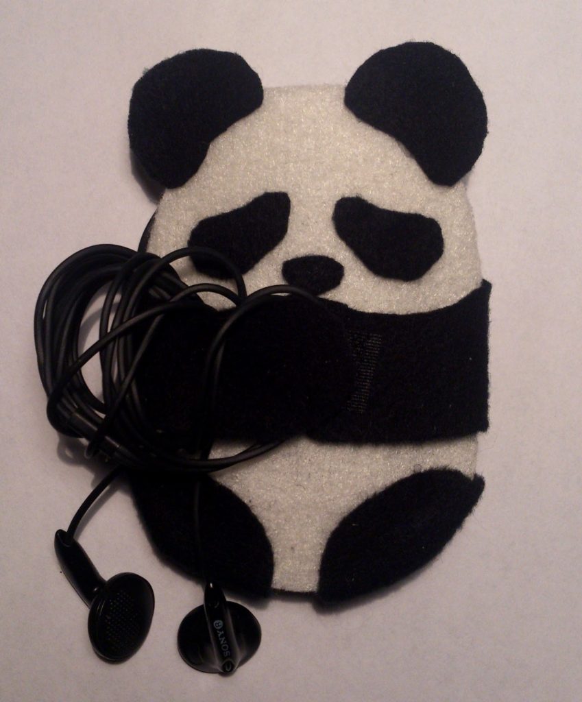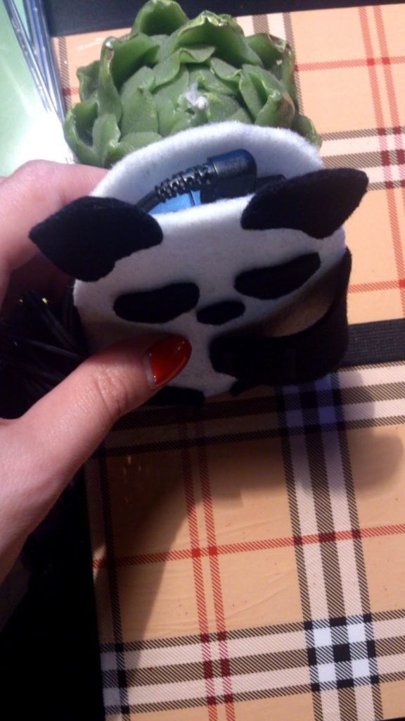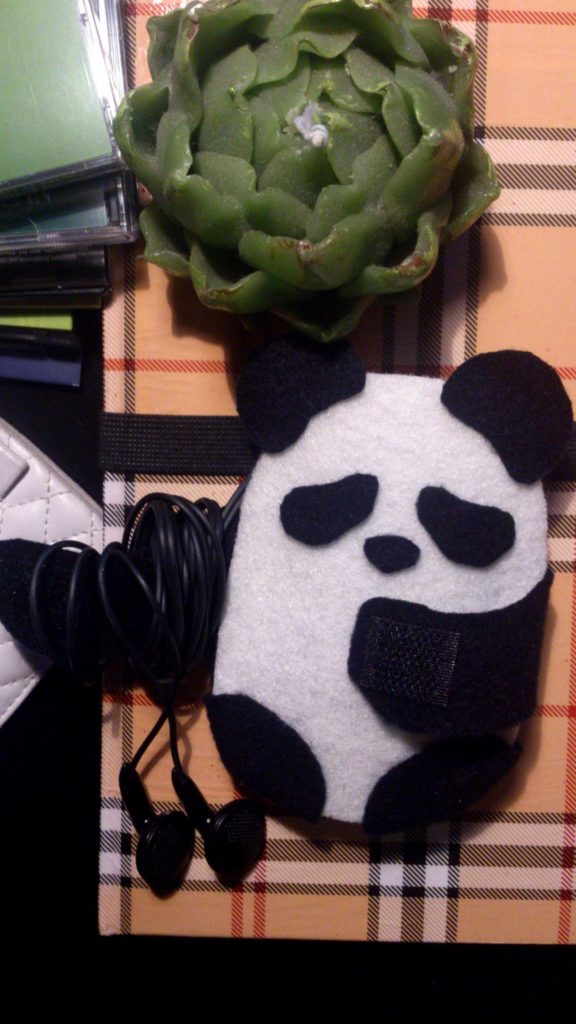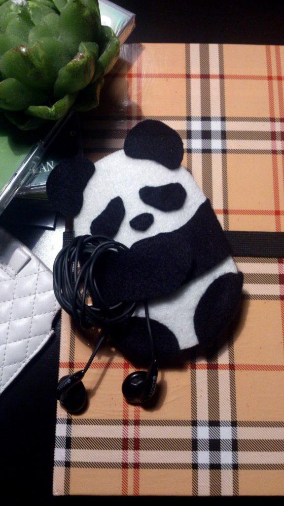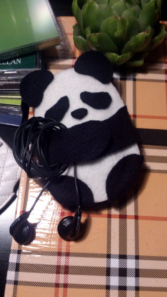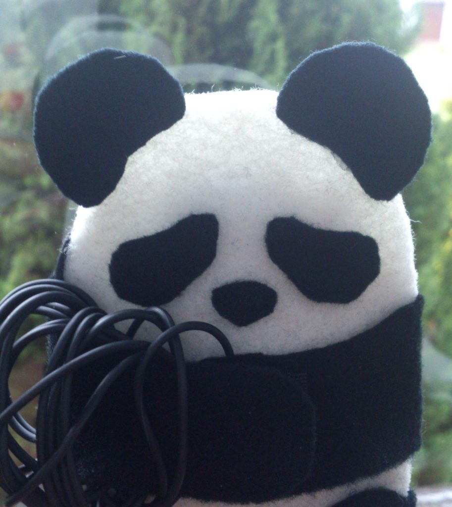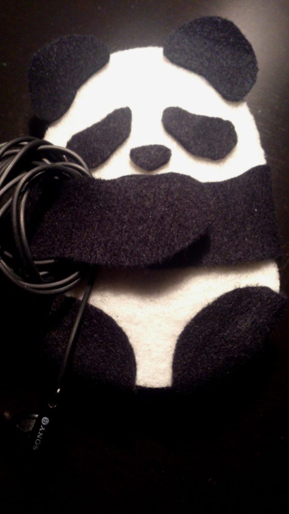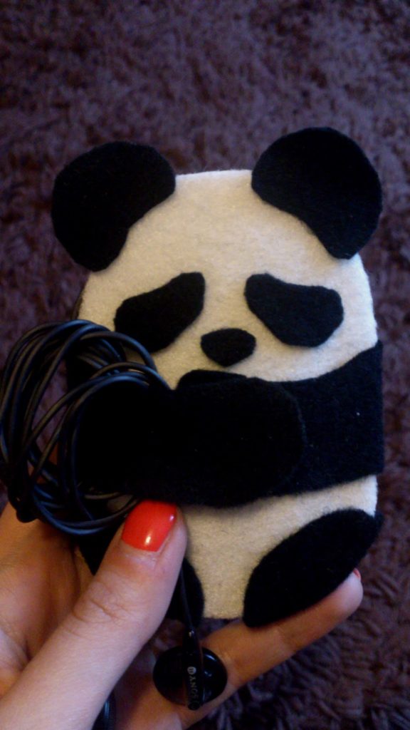 A tutaj już gotowa panda 🙂 Na przednią część przykleiłam uszy, a łapki trzymają się na rzep, dzięki czemu łatwo można owinąć na nich kabel od słuchawek.