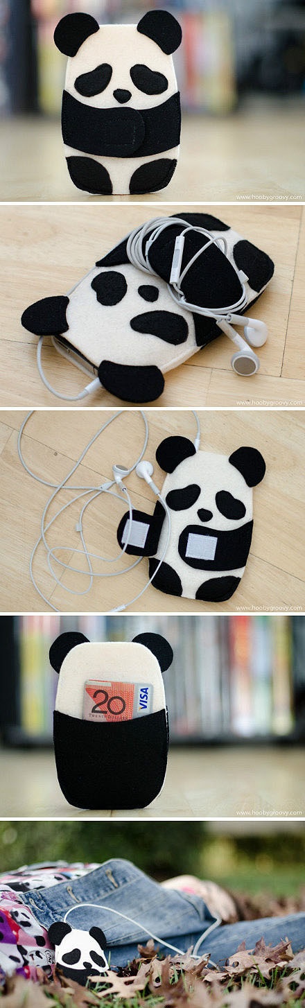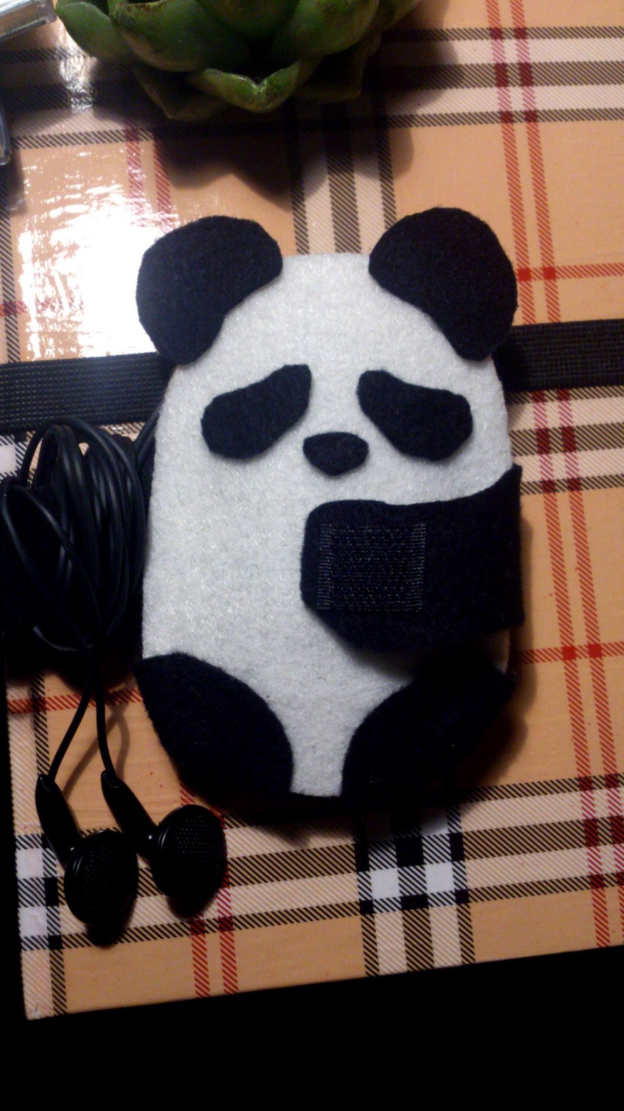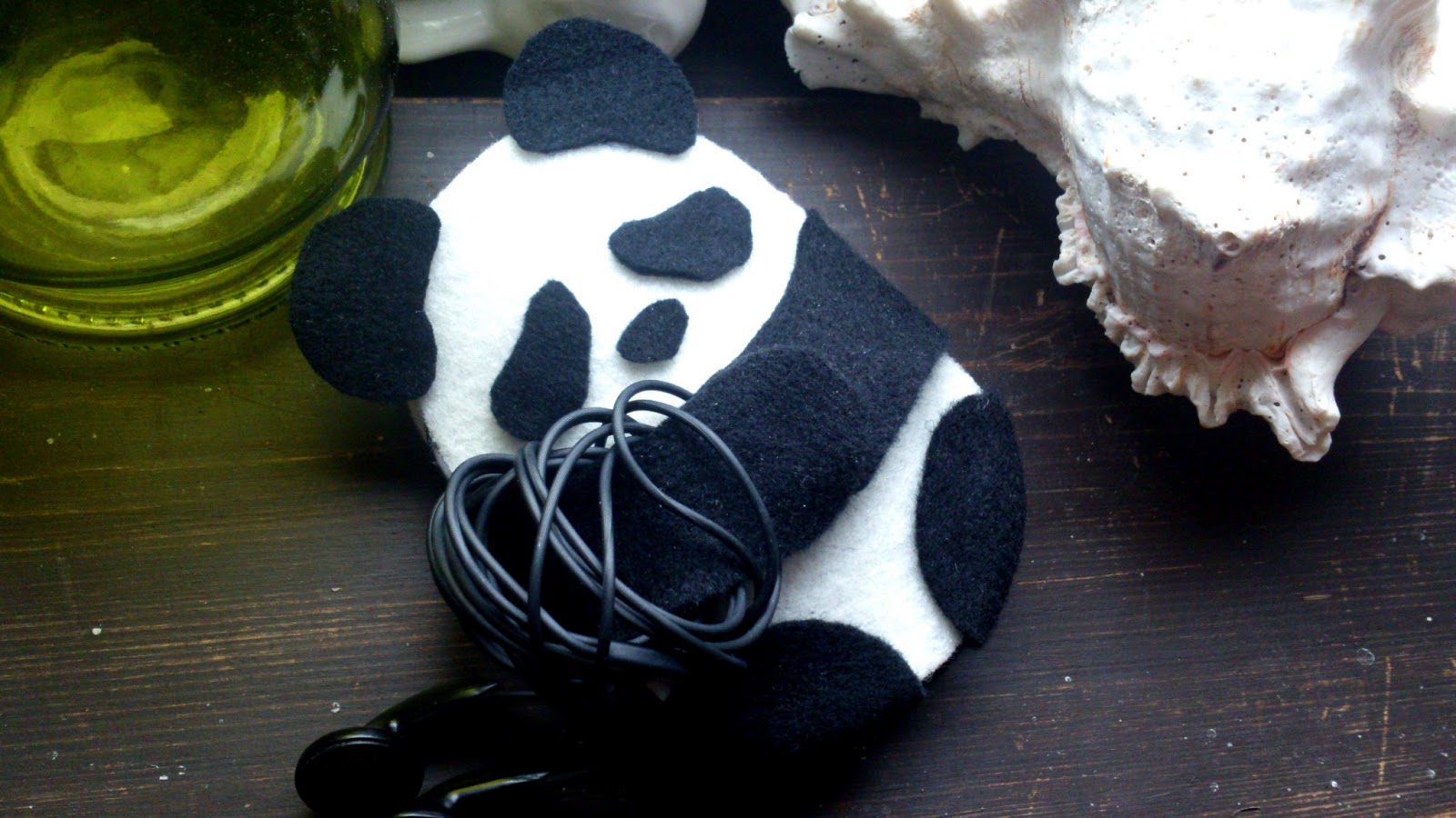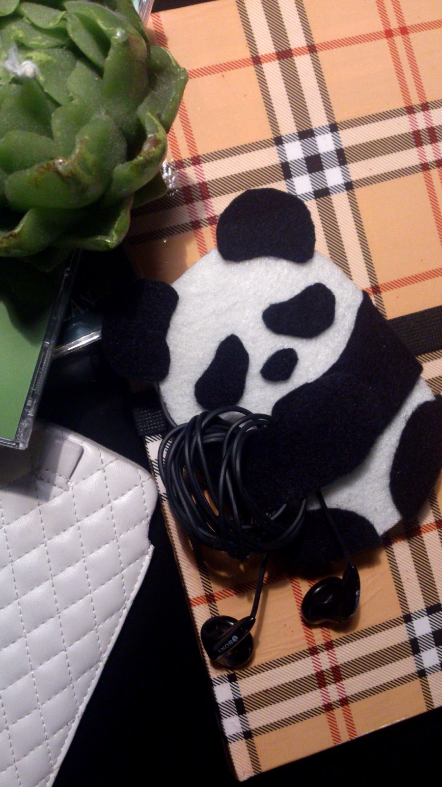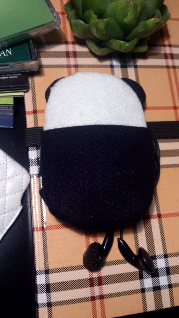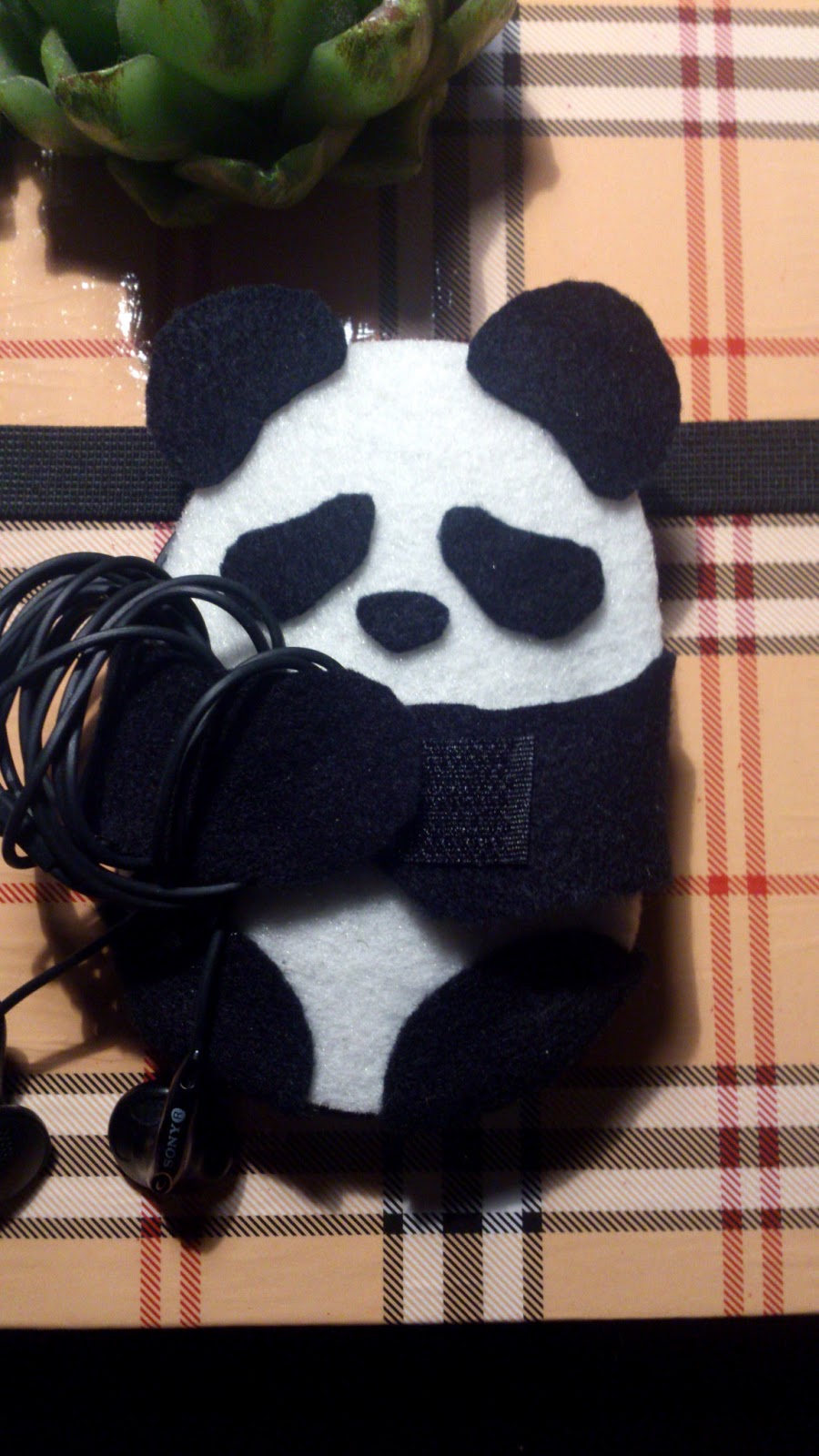 A tutaj już gotowa panda 🙂 Na przednią część przykleiłam uszy, a łapki trzymają się na rzep, dzięki czemu łatwo można owinąć na nich kabel od słuchawek.