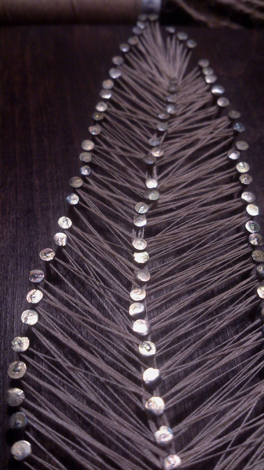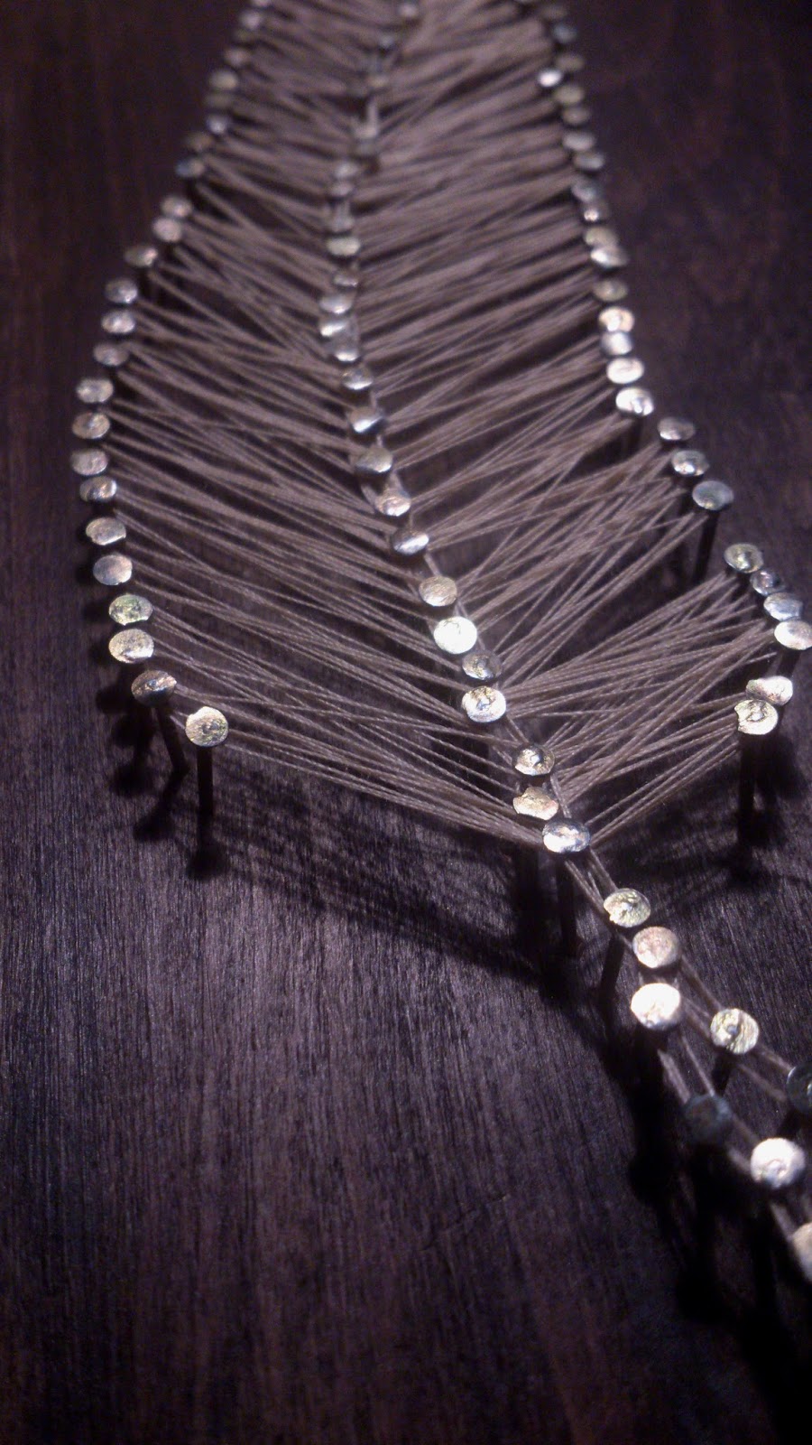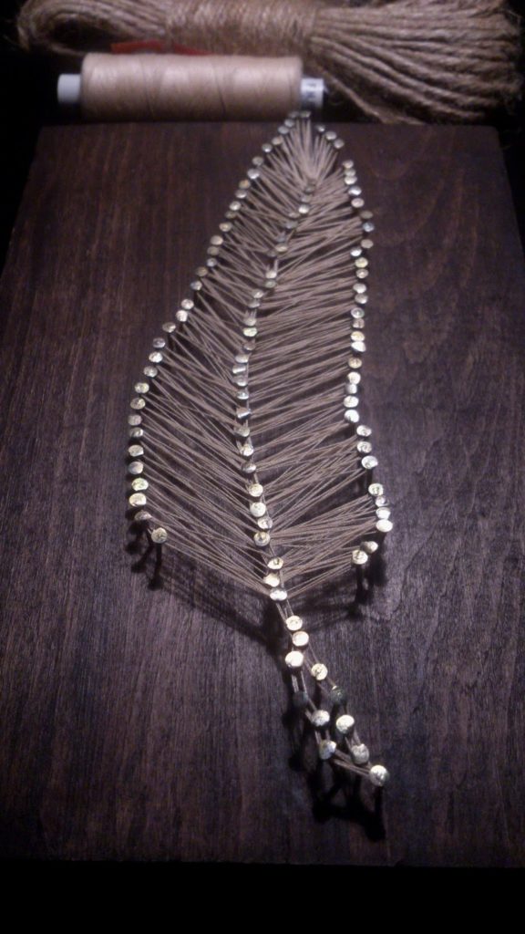 Ja sobie wymyśliłam piórko, z internetu wydrukowałam zdjęcie odpowiedniej wielkości, przykleiłam do deseczki i stwierdziłam, że łatwiej mi będzie z gwoździami jak sobie nawiercę dziurki.