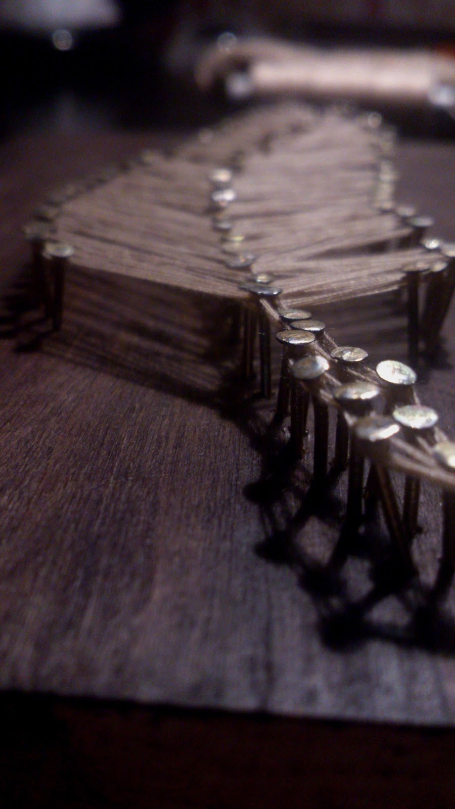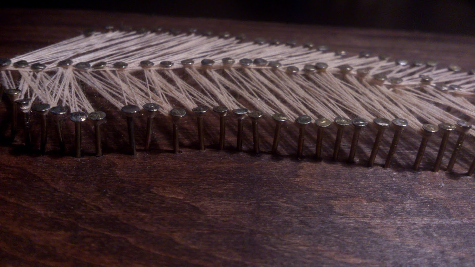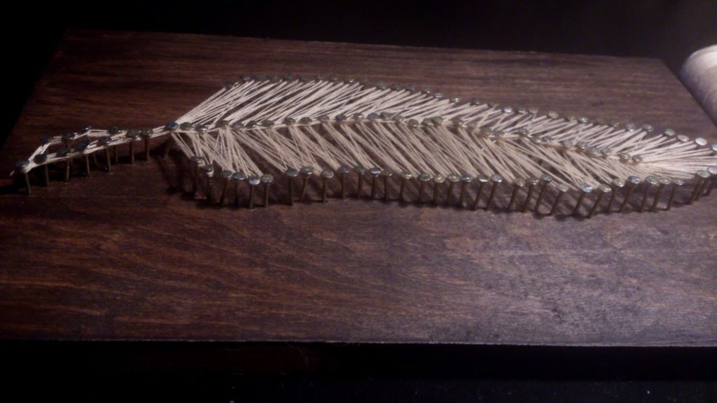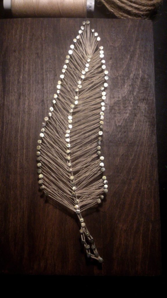 Ja sobie wymyśliłam piórko, z internetu wydrukowałam zdjęcie odpowiedniej wielkości, przykleiłam do deseczki i stwierdziłam, że łatwiej mi będzie z gwoździami jak sobie nawiercę dziurki.