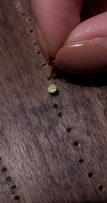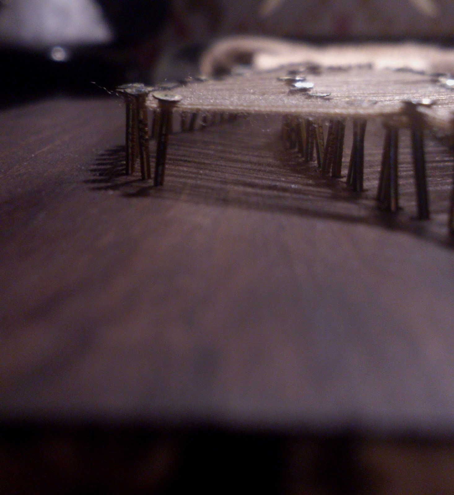 Nie bardzo chciało mi się znowu jechać 10km po inne gwoździe, wiec przygotowałam sobie inną deseczkę i zaczęłam…kooooszmar 😛 Miałam do zrobienia 110 dziur, najpierw wbijałam od razu te gwoździe, ale były tak tycie, że ciężko mi było jakoś sensownie je przytrzymać. Po godzinie miałam jakieś 10 😛 Wtedy przyniosłam sobie duży gwóźdź, którym robiłam sobie takie „dziurki na rozruch” ;)) i dopiero w nie wbijałam gwoździe właściwe. To już szło trochę szybciej.