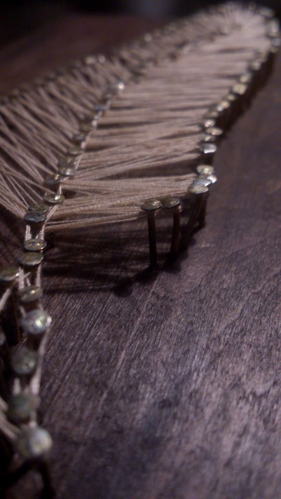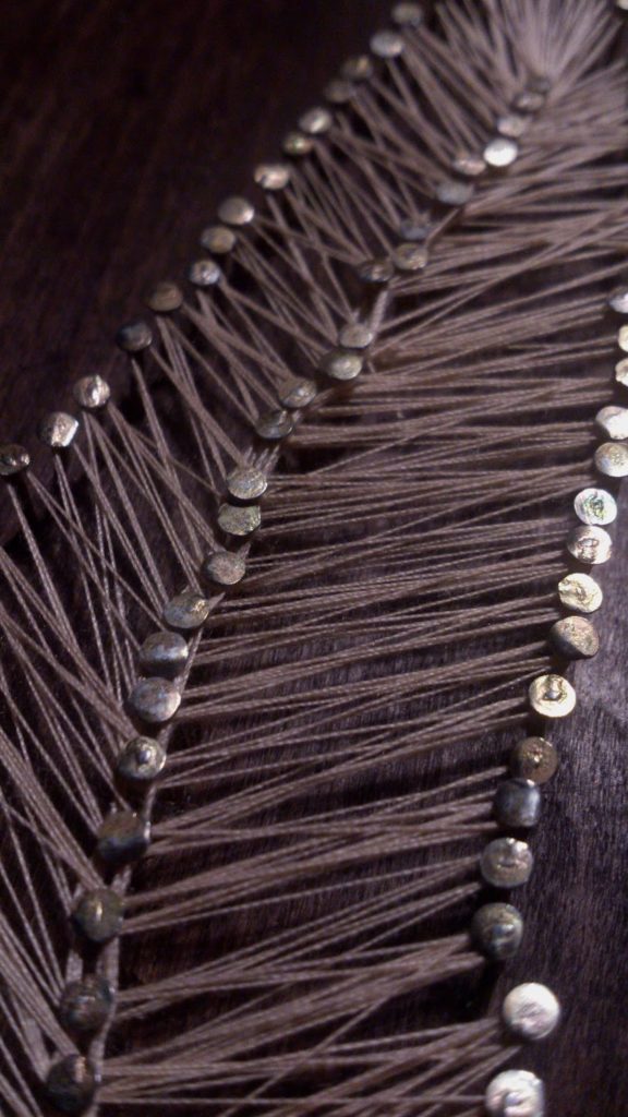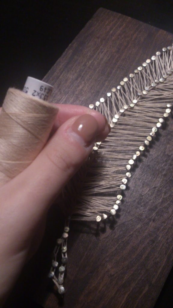 No ale ja już tak mam, że jak coś zaczynam to muszę skończyć 😉 Tak więc po czterech dniach miałam wreszcie te durne gwoździe powbijane. Wtedy mogłam zacząć się bawić nitką. Wybrałam beżową, zawiązałam na gwoździu na samym dole i od niego szłam w górę.