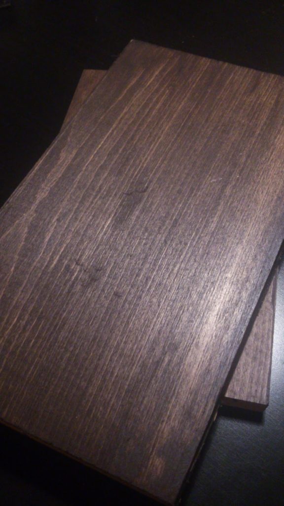 Najpierw było łatwo: znalazłam deseczkę, która pasowała mi wielkością i zrobiłam tzw. stain (przebarwianie?), czyli maluje się drewno grubszą warstwą wybranej farby i zostawia na 15min., po tym czasie starłam farbę szmatką i uzyskałam fajny efekt starego drewna: