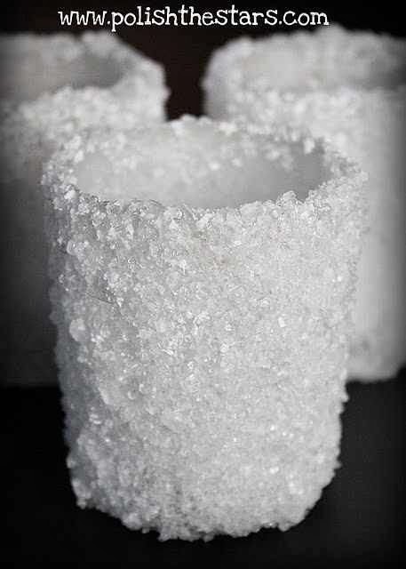 Poniżej zwykłe szklanki oklejone brokatem, na to przyklejone ozdobne broszki.