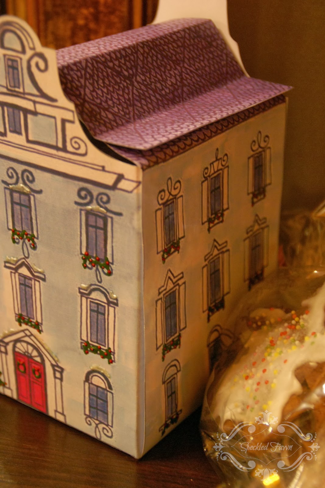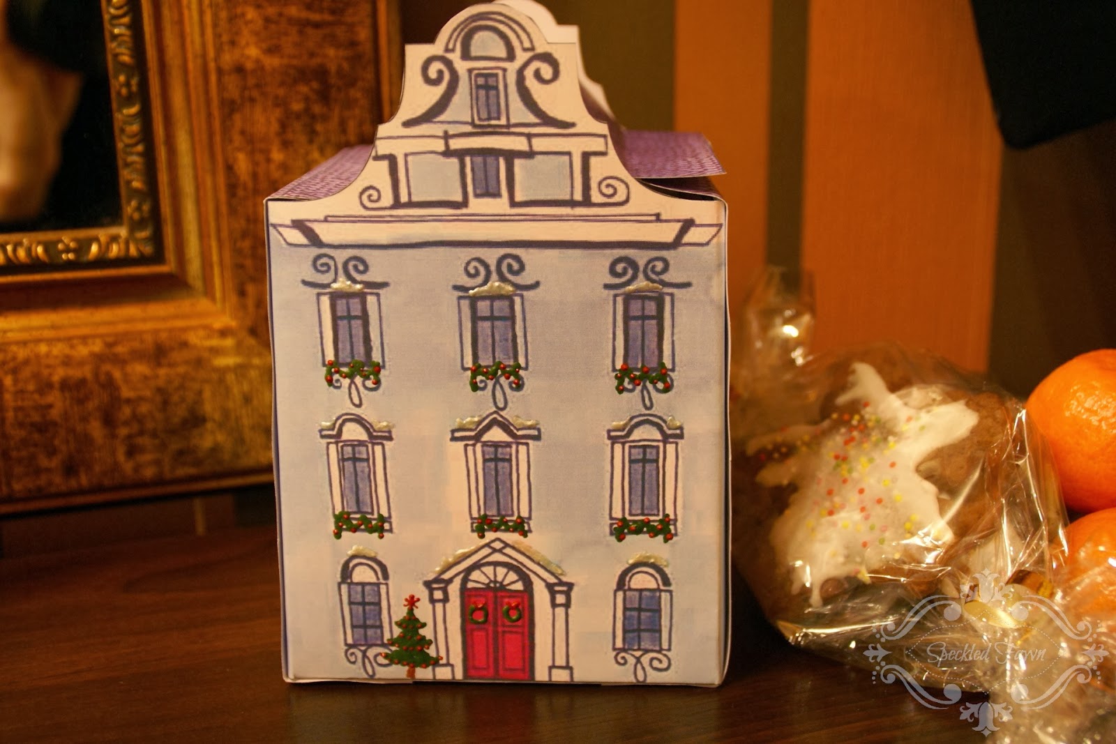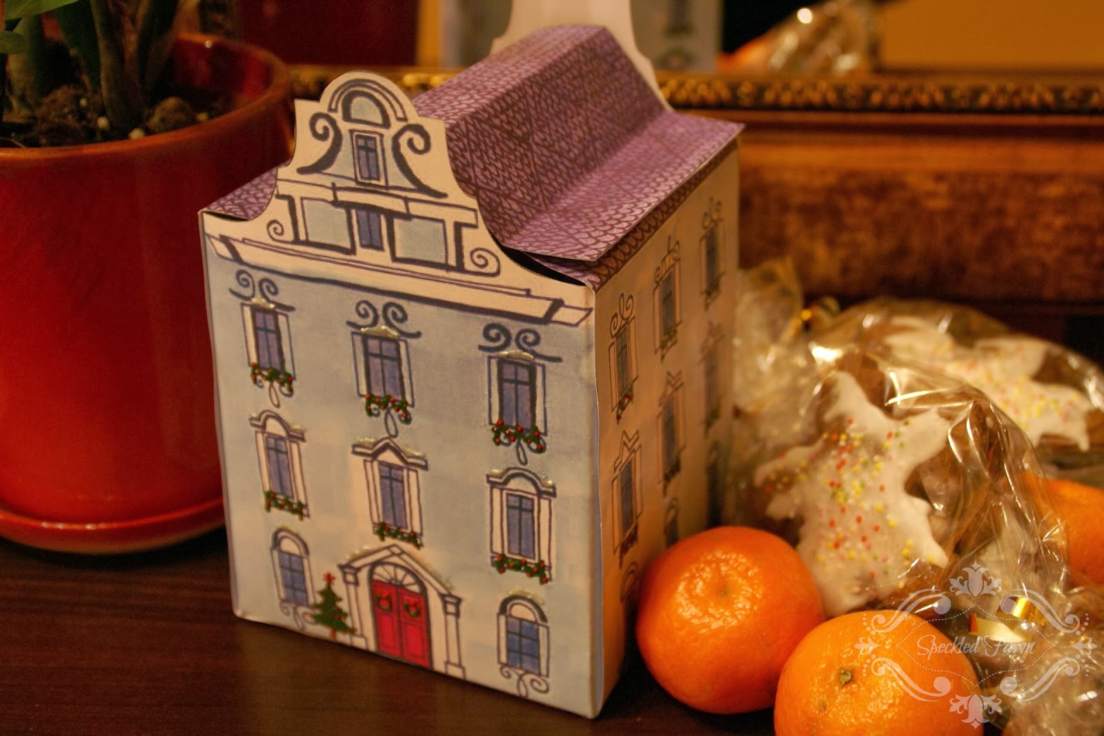 A właściwie taka bardziej kamienica ;))) Kolejny z ciekawych pomysłów jakie znalazłam na stronie Marthy Stewart. Trochę tylko przy jej szablonie pokombinowałam – przede wszystkim mój domek na łakocie jest sporo większy, musi pomieścić domowe pierniczki, które kupiłam podczas świątecznego kiermaszu. Poza tym oryginał to bardziej taka nakładka na gotowe kartonowe pudełko, domek zdejmuje się w górę i w ten sposób odsłania pudełko z ciasteczkami. Ja wydrukowany domek okleiłam w środku grubą tekturą, a dach przykleiłam tylko z jednej strony – z drugiej się podnosi. Mam do zrobienia jeszcze dwa takie 🙂 A ponieważ domek wydawał mi się trochę mało świąteczny, domalowałam girlandy, choinkę i wieńce na drzwiach :)))