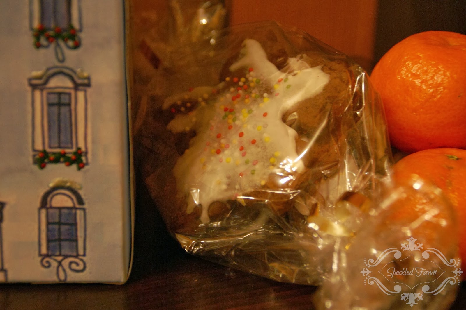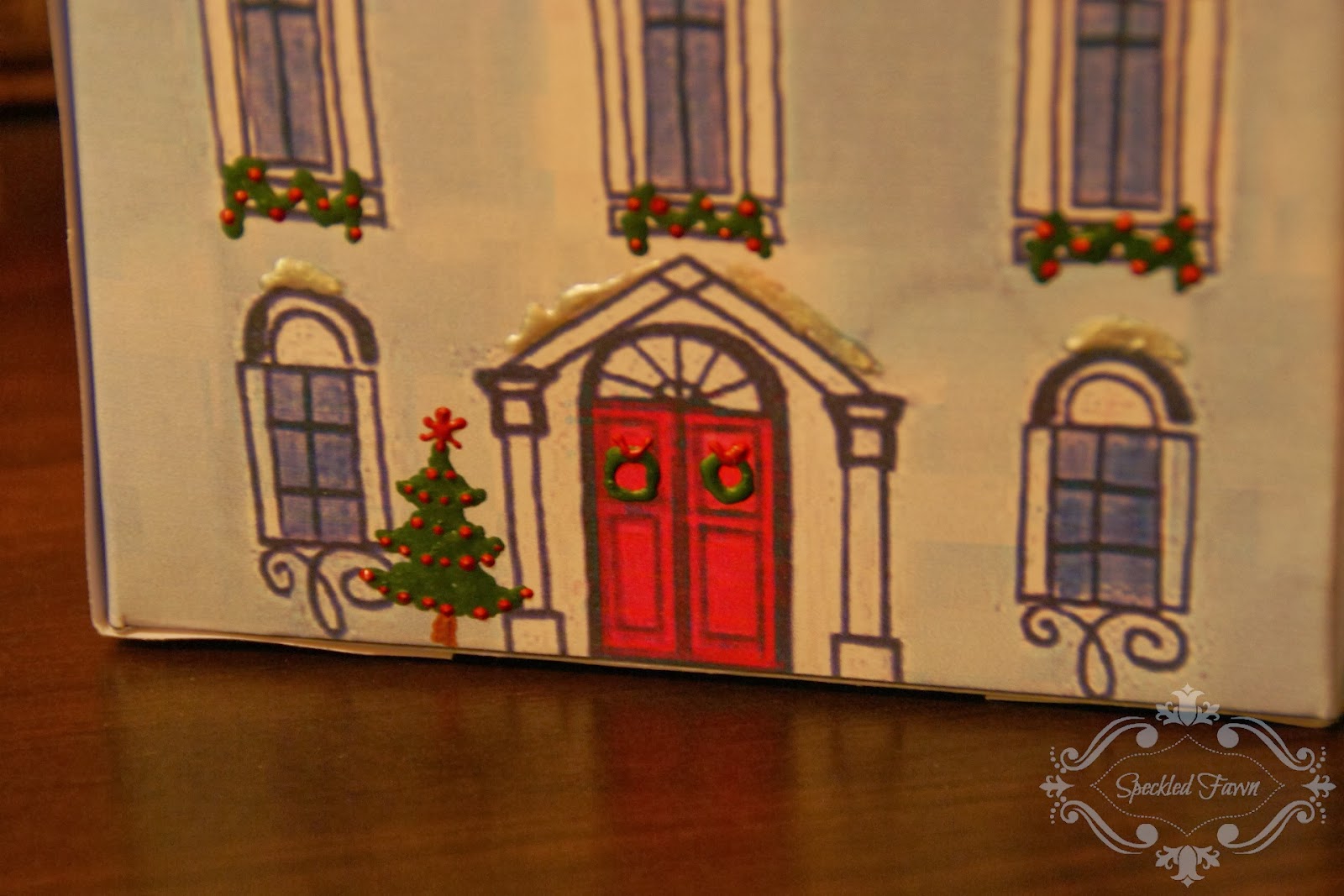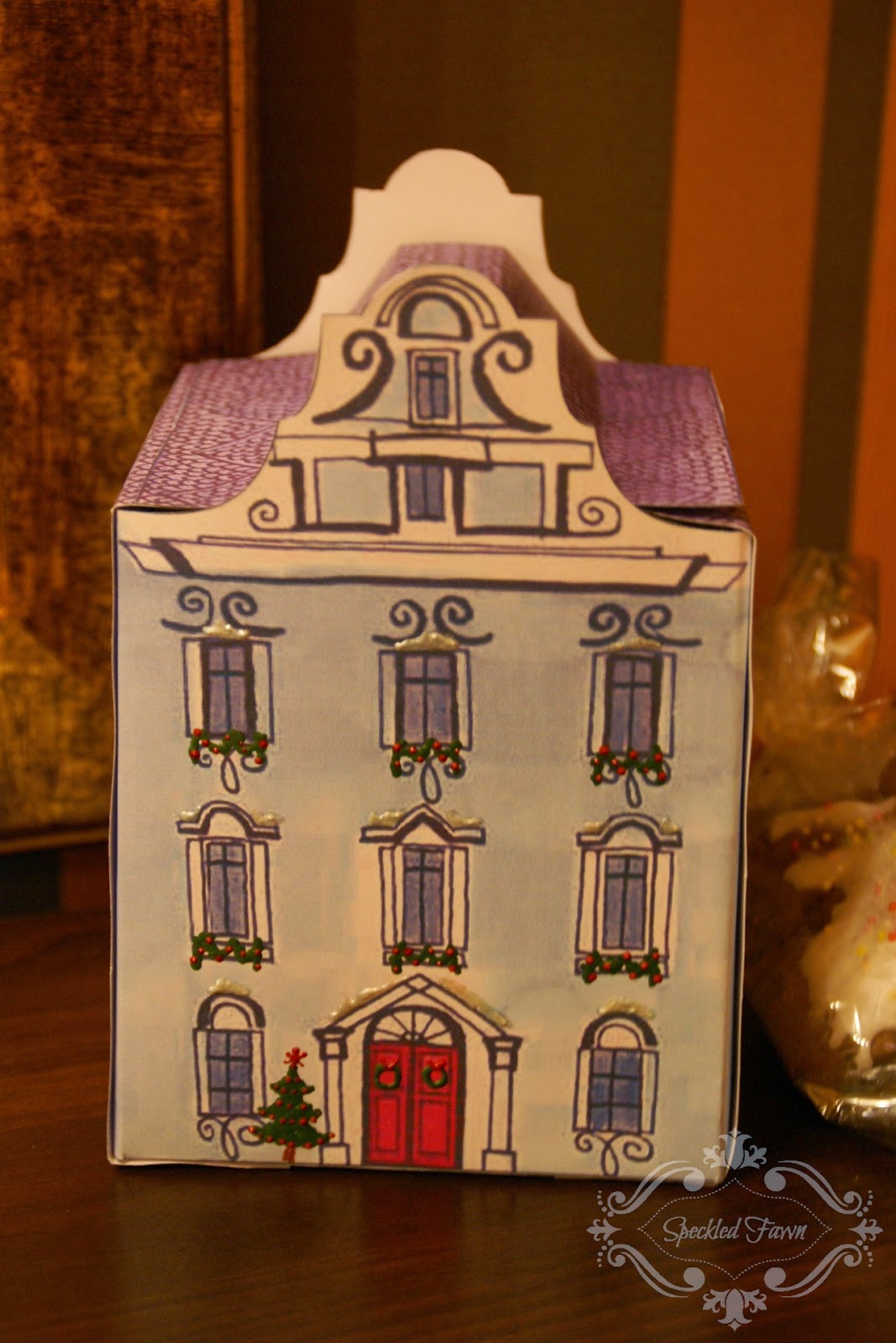 A właściwie taka bardziej kamienica ;))) Kolejny z ciekawych pomysłów jakie znalazłam na stronie Marthy Stewart. Trochę tylko przy jej szablonie pokombinowałam – przede wszystkim mój domek na łakocie jest sporo większy, musi pomieścić domowe pierniczki, które kupiłam podczas świątecznego kiermaszu. Poza tym oryginał to bardziej taka nakładka na gotowe kartonowe pudełko, domek zdejmuje się w górę i w ten sposób odsłania pudełko z ciasteczkami. Ja wydrukowany domek okleiłam w środku grubą tekturą, a dach przykleiłam tylko z jednej strony – z drugiej się podnosi. Mam do zrobienia jeszcze dwa takie 🙂 A ponieważ domek wydawał mi się trochę mało świąteczny, domalowałam girlandy, choinkę i wieńce na drzwiach :)))