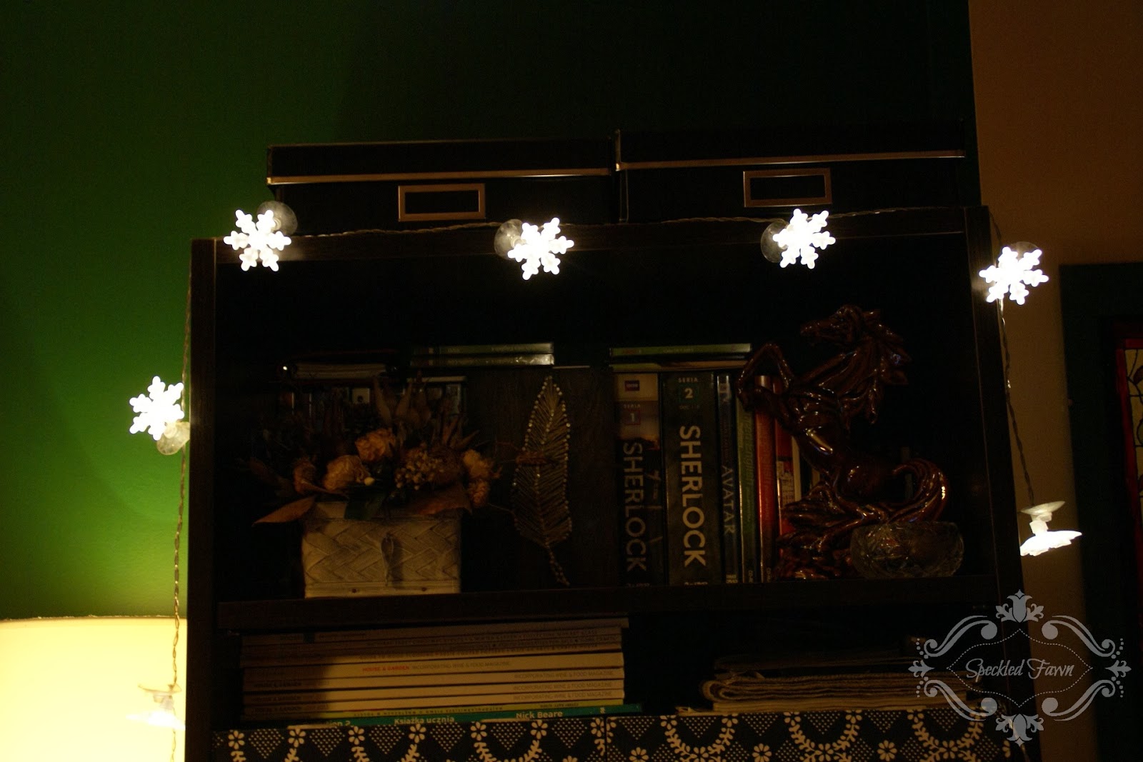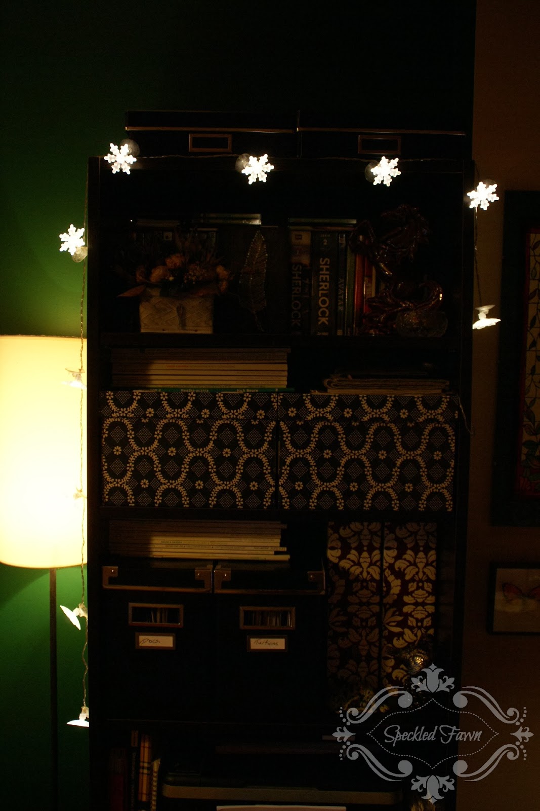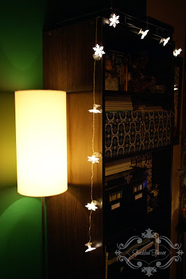 Światełka z Ikei jednak nie trafiły na okno, ciągle się odklejały, więc po prostu przewiesiłam je przez regał.