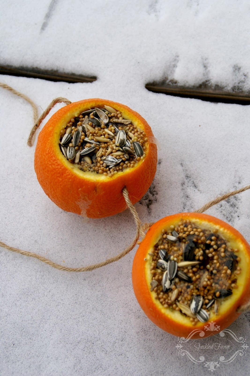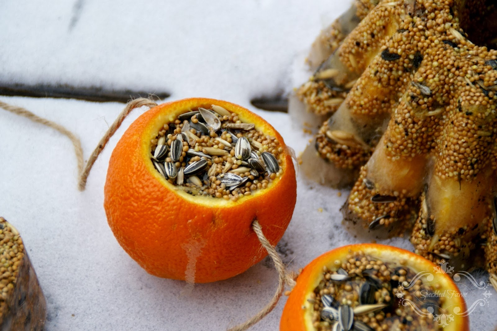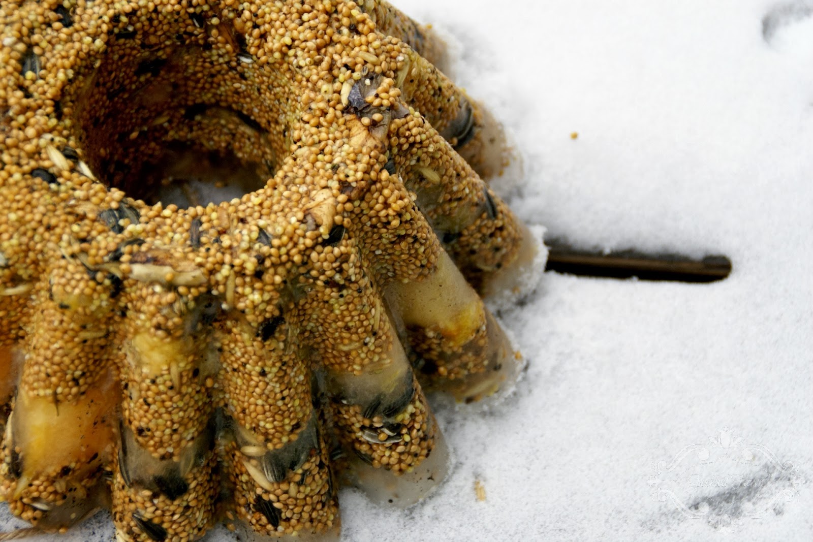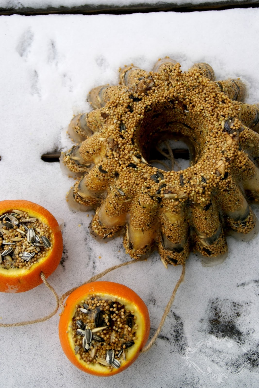 Zrobienie takich karmników trwa chwilę. Trzeba tylko kupić mieszankę ziaren, pomarańcze no i (jeśli akurat nie macie w domu) sznurek i żelatynę. Pomarańczę trzeba wydrążyć i przewlec sznurki, później nasypać smakołyków i zalać żelatyną albo wodą. Następnie do zamrażarki na jakiś czas i gotowe 🙂