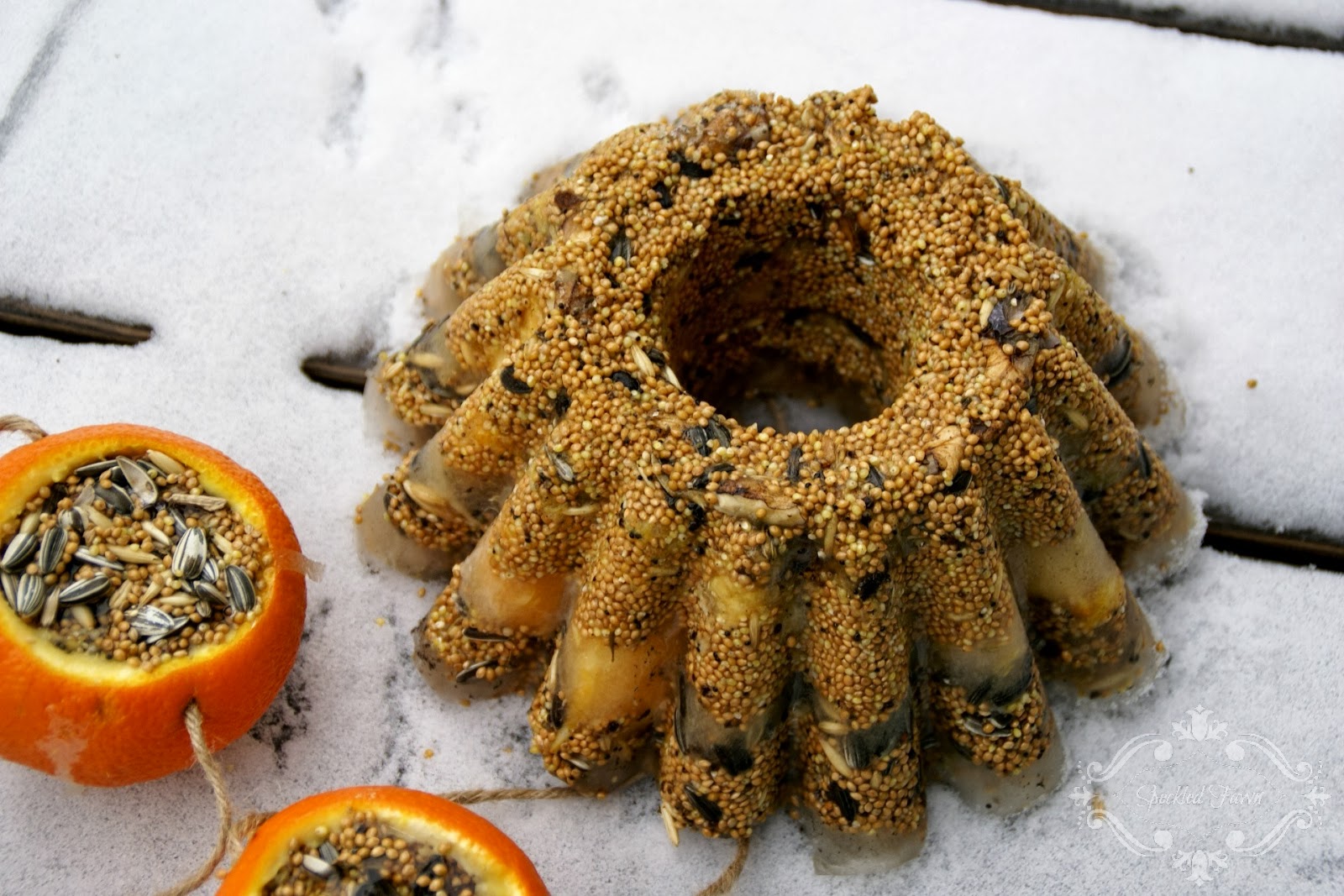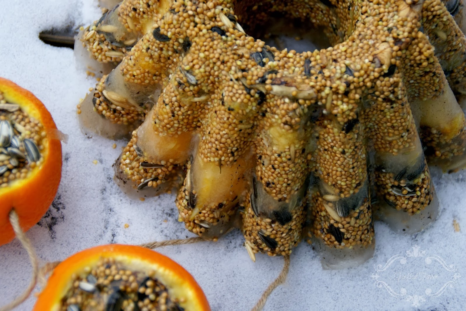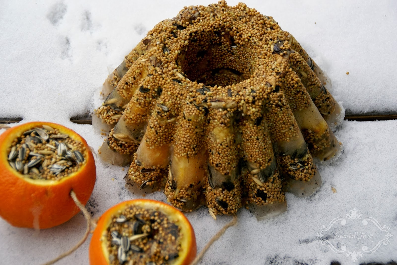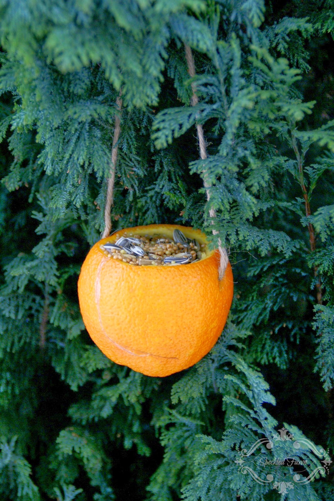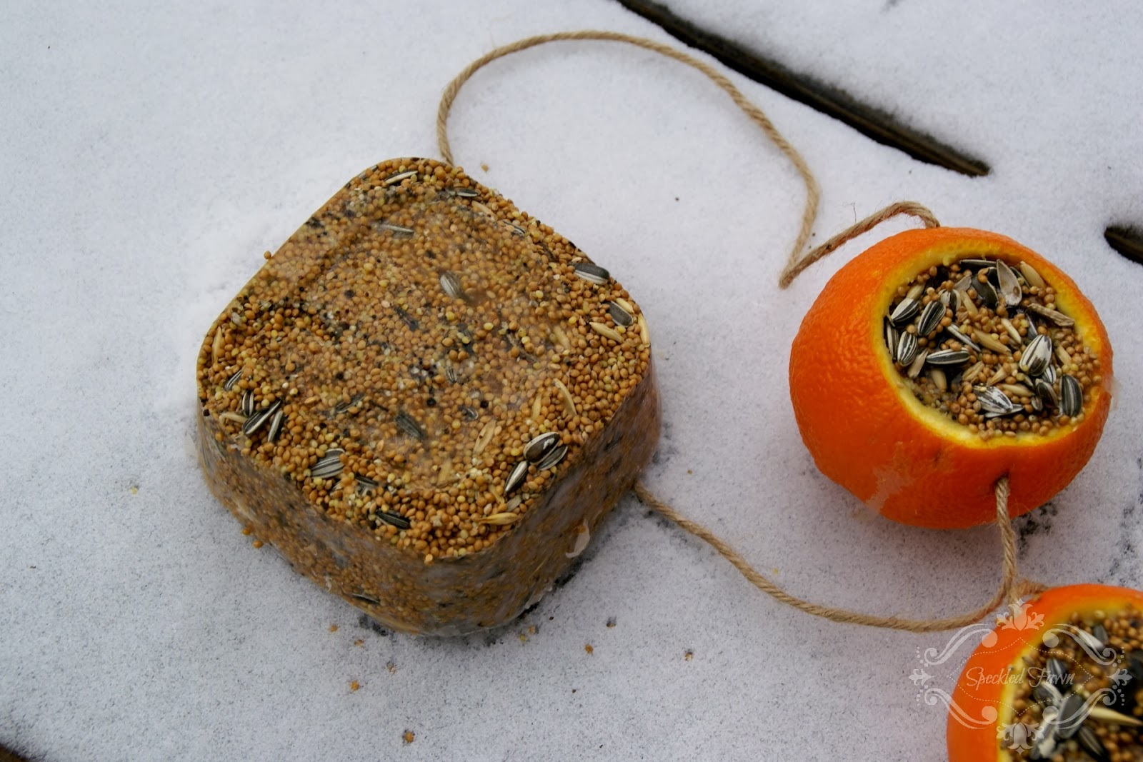 Zrobienie takich karmników trwa chwilę. Trzeba tylko kupić mieszankę ziaren, pomarańcze no i (jeśli akurat nie macie w domu) sznurek i żelatynę. Pomarańczę trzeba wydrążyć i przewlec sznurki, później nasypać smakołyków i zalać żelatyną albo wodą. Następnie do zamrażarki na jakiś czas i gotowe 🙂