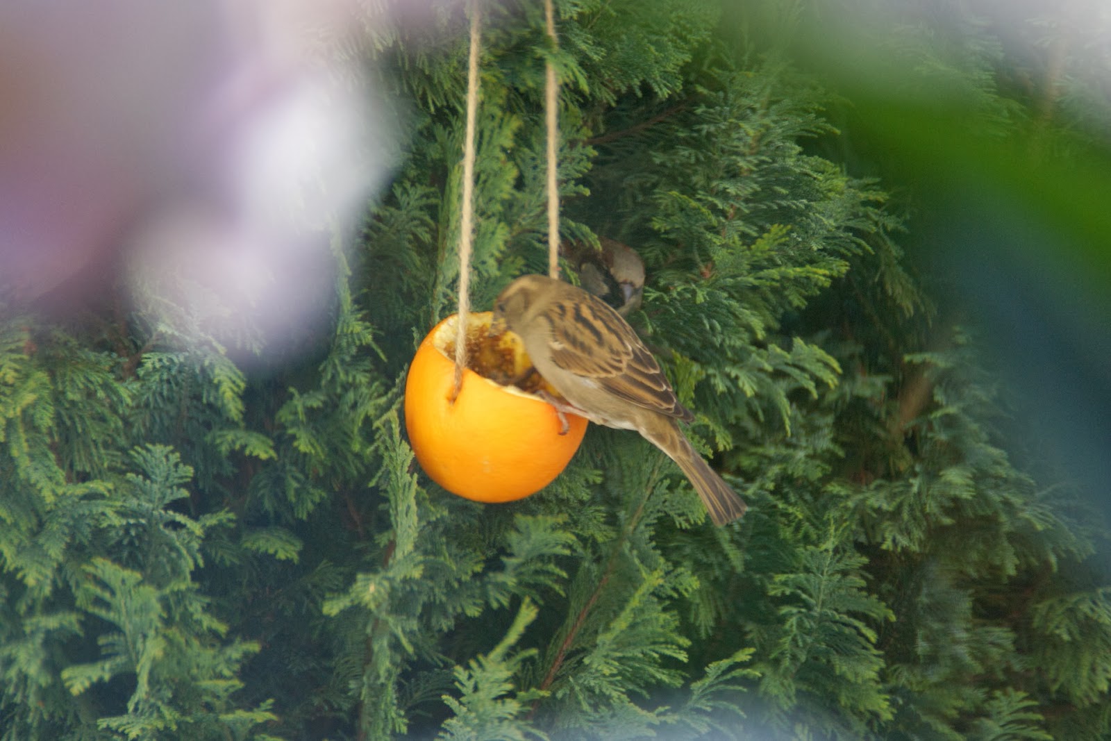 jeden wróbel je, drugi ukrywa się w gałęziach z niecnym zamiarem przejęcia pomarańczy, wyglądało to naprawdę przezabawnie, co chwilę wyskakiwał w innym miejscu, to na górze, to na dole, to znowu gdzieś z lewej, sprawdzając jakby tu „zajść” całą tę sytuację ;)) A ten jedzący żyje w błogiej nieświadomości 😛