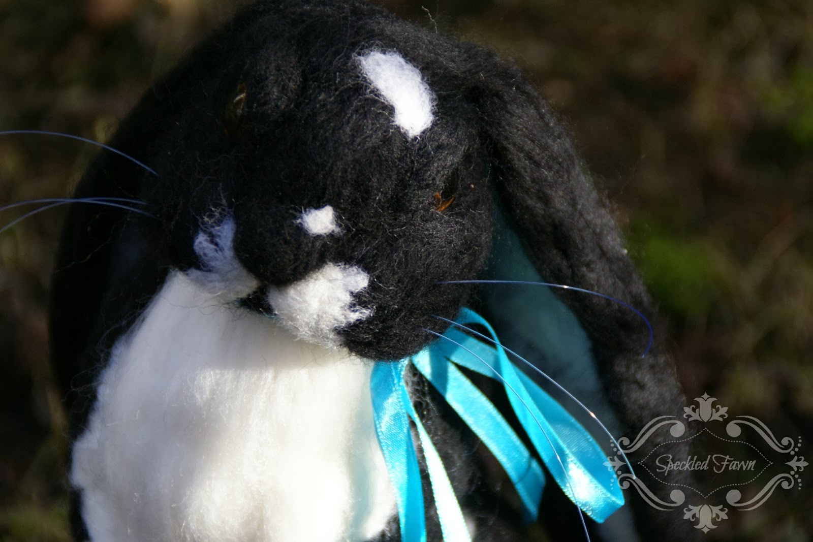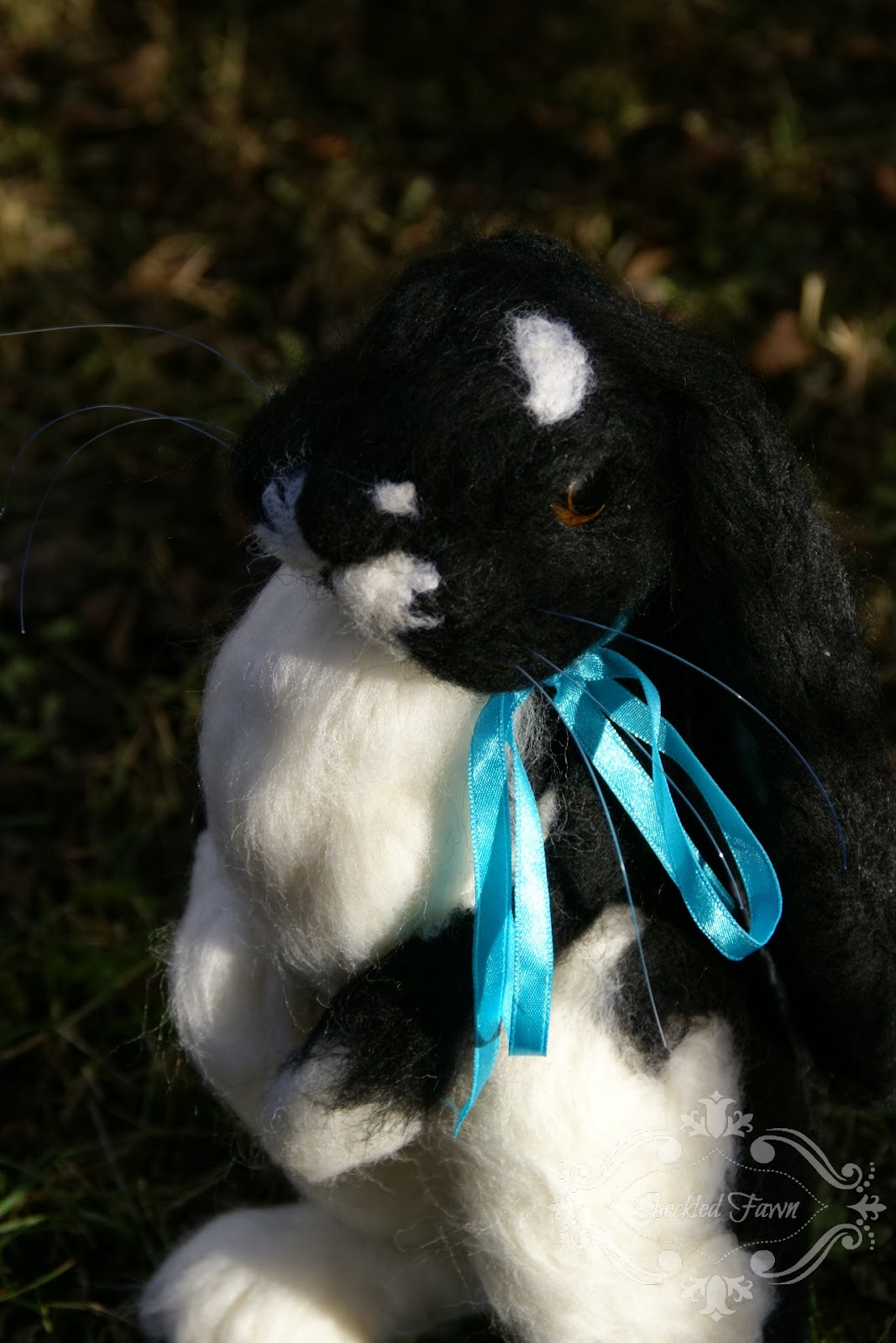 No więc zrobiłam kolejnego większego zwierzaka 🙂 Tym razem królik naturalnych rozmiarów (a właściwie to chyba nawet większy – tak na oko ponad 30cm). Czarno-biały z kilkoma łatkami i puchatym czarnym ogonkiem przekrzywia z zaciekawieniem głowę 🙂 Aż się prosił o jakąś kokardę, więc dostał niebieską – potraktujmy to jako zwiastun wiosny ;))