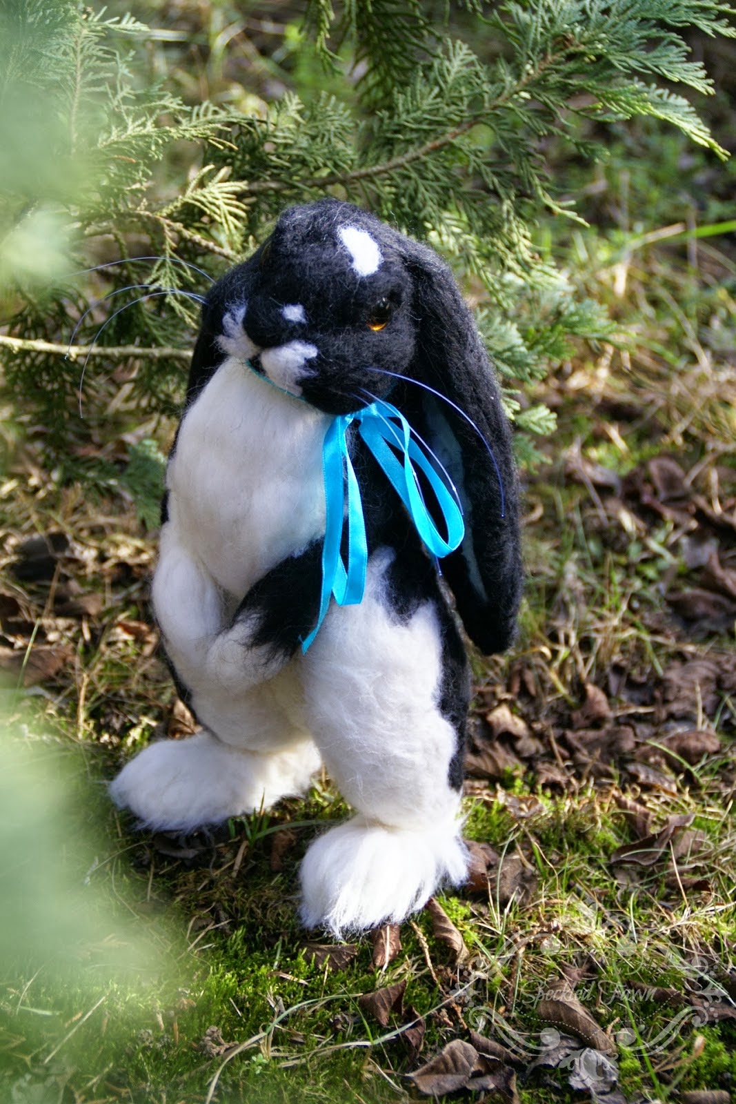 Jak tak teraz patrzę na daty tych postów, stwierdzam, że byłam na filcowym haju 😛 ledwo kończyłam jednego, zaczynałam następnego 😉 Kilka dni po pannie króliczce znowu zachciało mi się zrobić jakiegoś większego stworka 🙂 W ten sposób powstał królik naturalnych rozmiarów (ma trochę ponad 30cm!). Fajnie mi się go robiło, a jaki słodziak wyszedł! 😀 Kokardka dopełniła całości. Obecnie zwierzak czeka na lepsze czasy, nie mam miejsca, w którym mogłabym go postawić (chętnie wyjechałby do nowego domu!:).