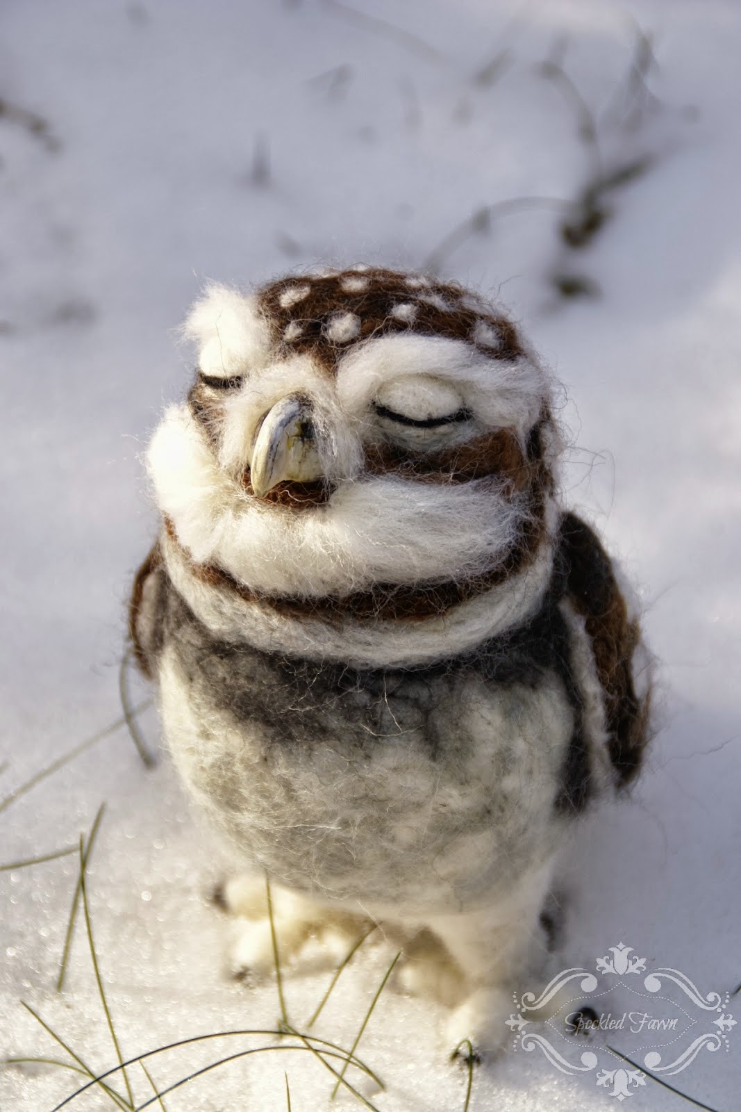 Później na kilka dni rzuciłam to wszystko w kąt i zbierałam się psychicznie po tak ogromnej porażce 😉 Ale kiedy już odpoczęłam i znów wzięłam wełnę w ręce, powstała moja filcowa Kaplica Sykstyńska 😛 czyli przeukochana i najulubieńsza sowa Snowhite 🙂 Stefan zajął mi 3 dni, sówka tyle samo, a robienie jej było jakoś tak nieporównanie przyjemniejsze :)) no i efekt też jakiś taki niewspółmierny;) Ta konkretna sówka bardzo szybko znalazła nowy dom, od tej pory zrobiłam jeszcze dwie, niby takie same, ale jednak każda była charakterystyczna 🙂