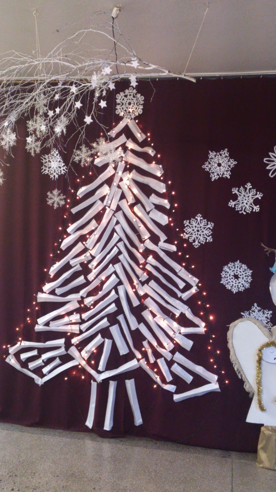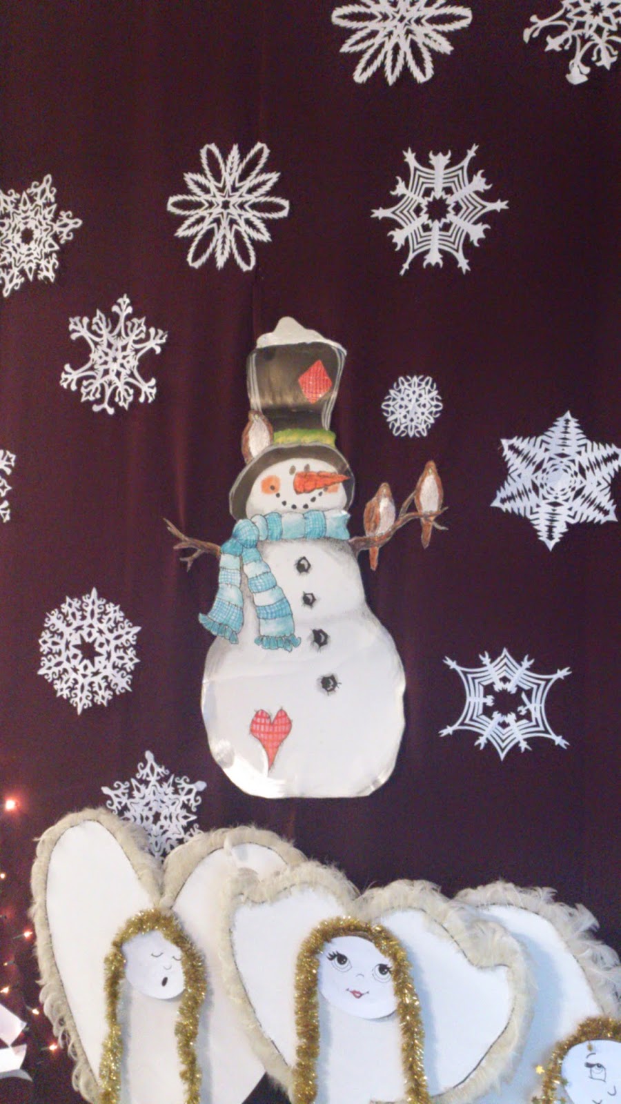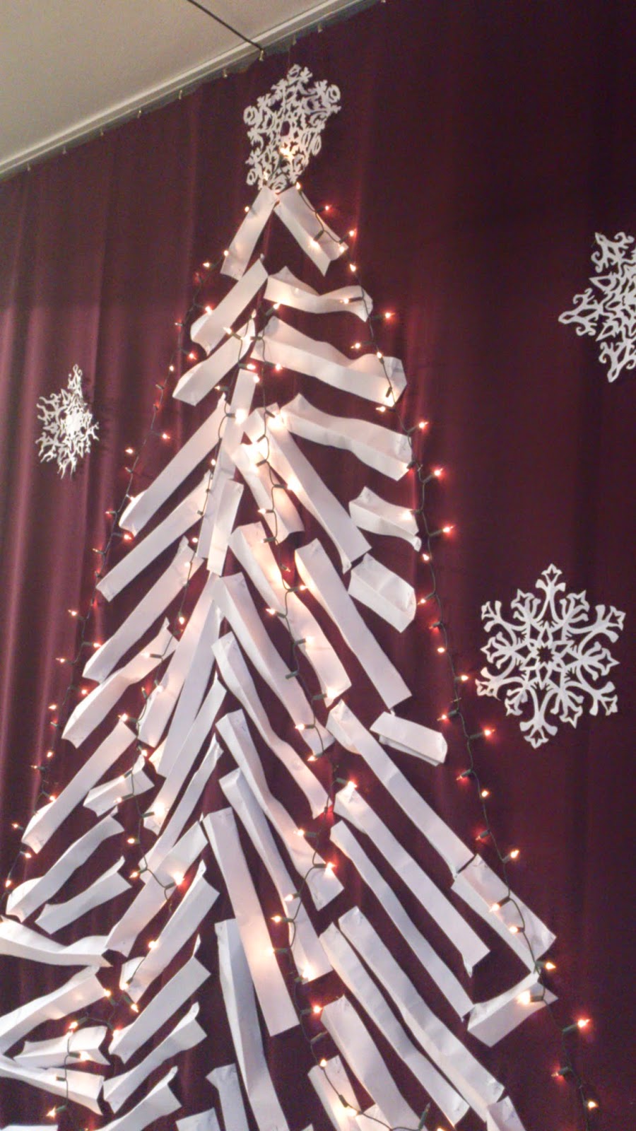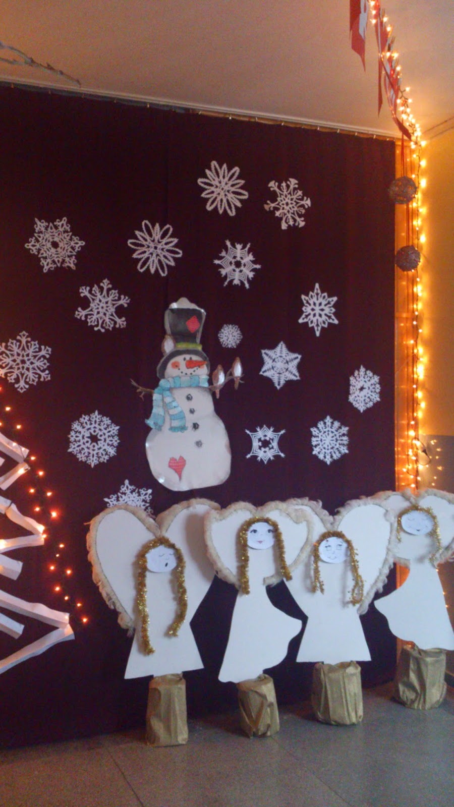 Bałwanka i misterne śnieżynki pojawiły się już w zeszłym roku (tutaj), nowością w tym roku jest wielka papierowa choinka – moi niewolnicy (czyt.uczniowie) wycięli mnóstwo pasków z papieru A3, każdy pasek był zgięty wzdłuż długości i przypinany szpilkami do kotary. Dzięki temu drzewko nie jest płaskie, a ma trochę faktury.