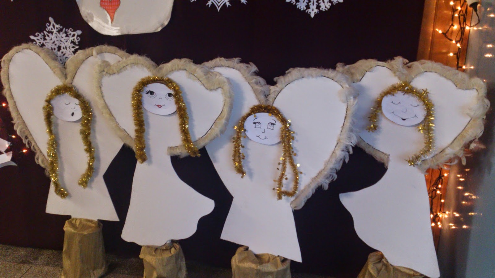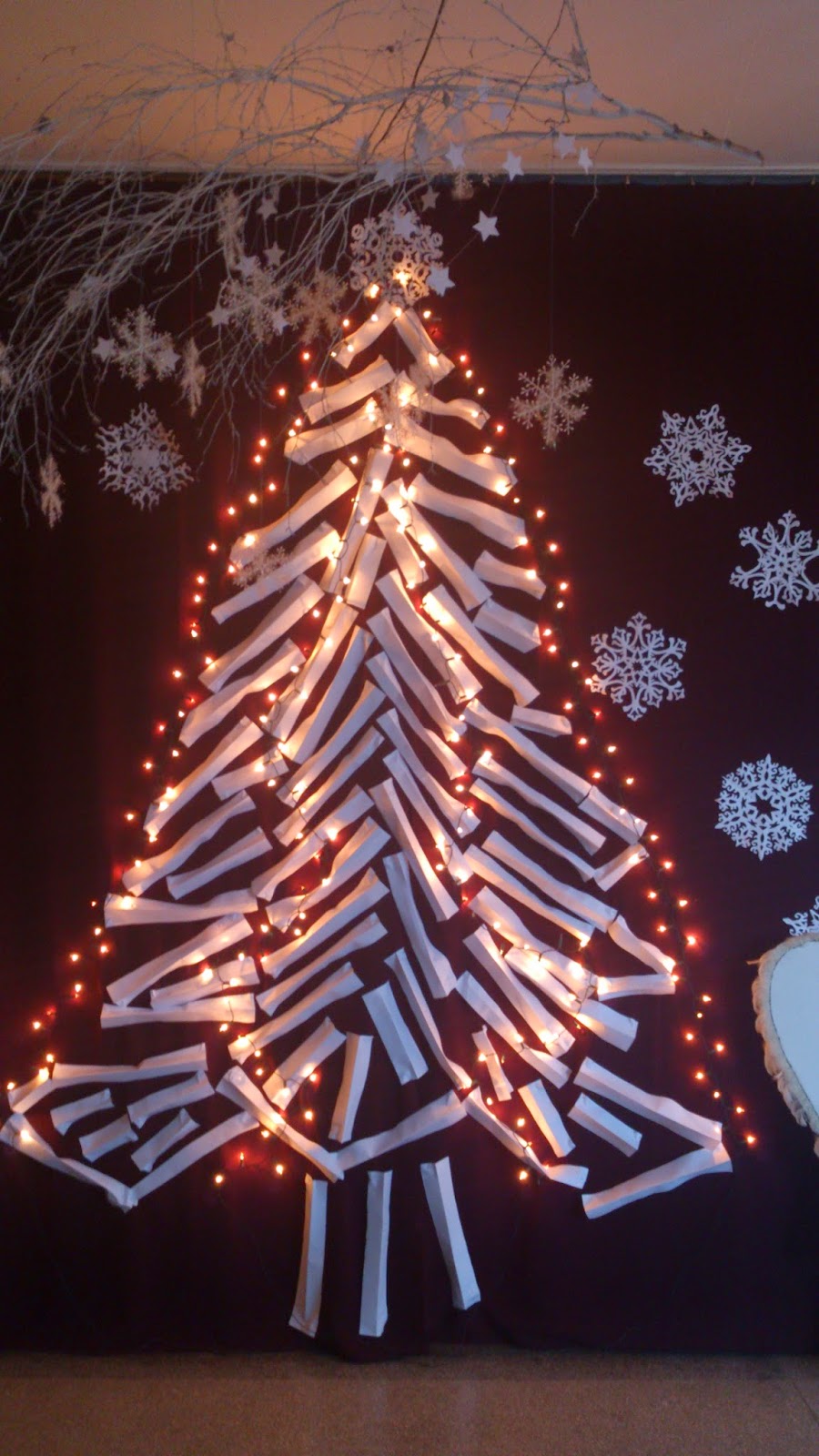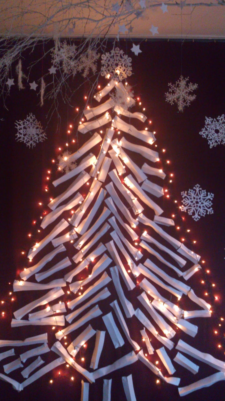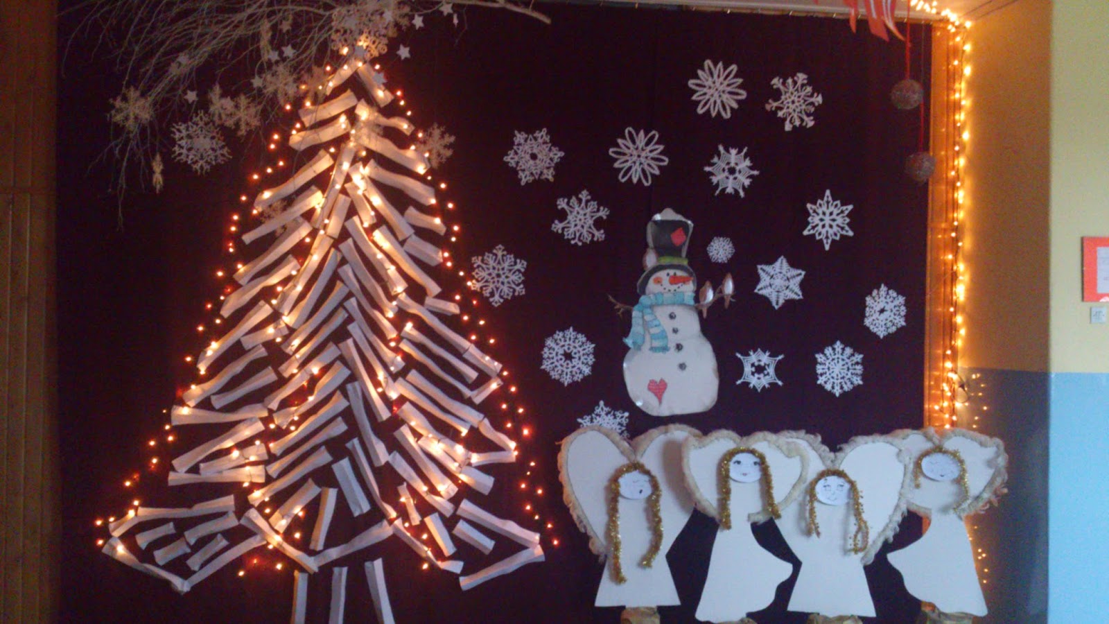 Bałwanka i misterne śnieżynki pojawiły się już w zeszłym roku (tutaj), nowością w tym roku jest wielka papierowa choinka – moi niewolnicy (czyt.uczniowie) wycięli mnóstwo pasków z papieru A3, każdy pasek był zgięty wzdłuż długości i przypinany szpilkami do kotary. Dzięki temu drzewko nie jest płaskie, a ma trochę faktury.