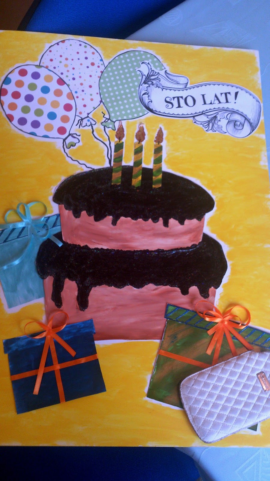 Tę kartkę zawoziłam wczoraj. Brystol złożony na pół, całość taka trochę 3D 😛 szczególnie podoba mi się polewa, wygląda naprawdę zachęcająco ;))