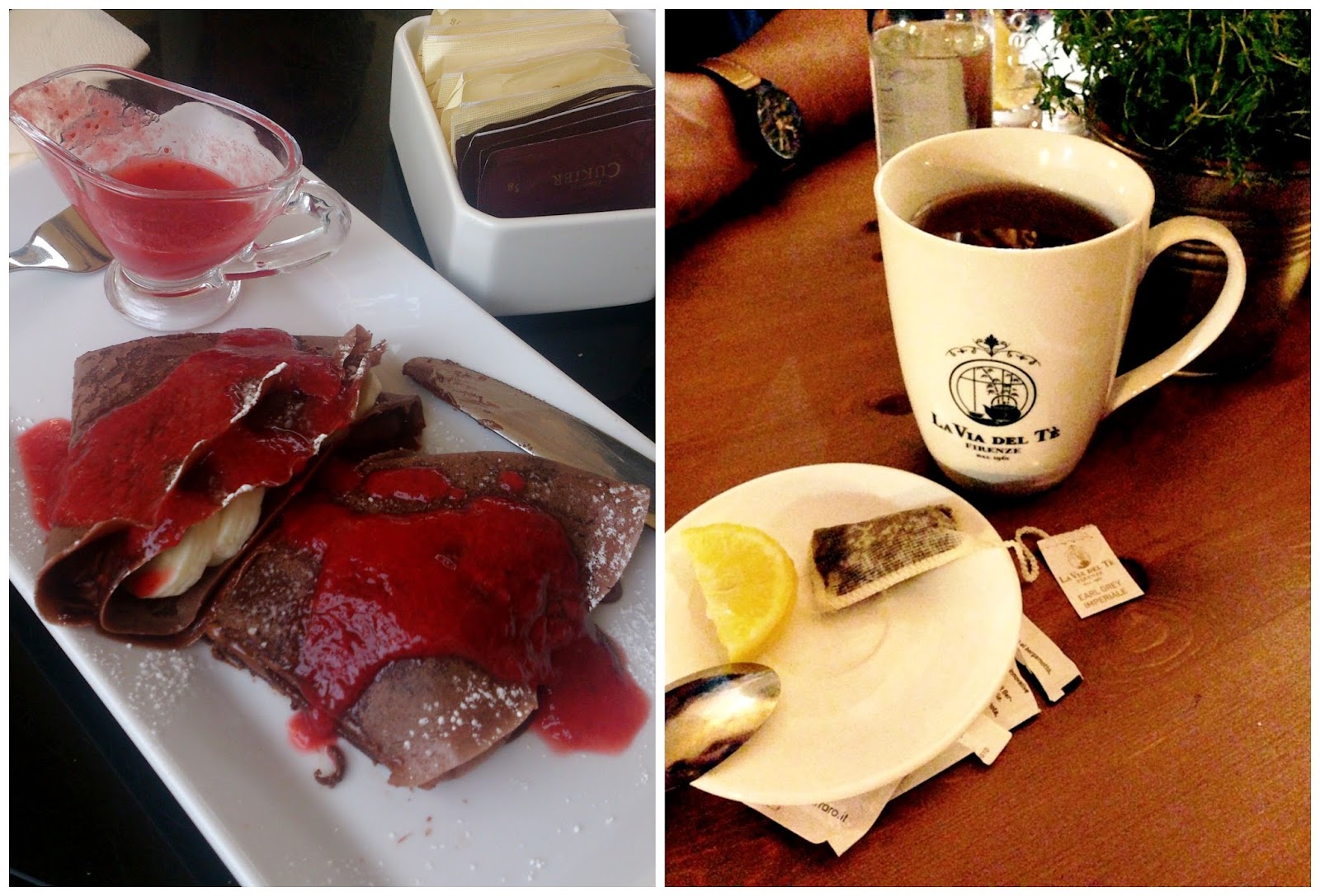 …i zjedliśmy mnóstwo pyszności 😀 Jak zobaczyłam restaurację o nazwie „Pijalnia Czekolady” to mówię „koniec, idziemy!” 😉 Naleśniki z bananami i sosem truskawkowym były niesamowite :)) Natomiast we włoskiej restauracji oprócz pysznej pizzy, miałam okazję napić się prawdziwej włoskiej herbaty 😀