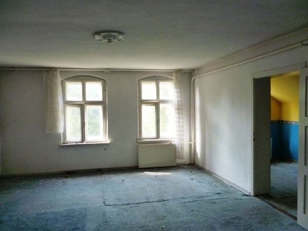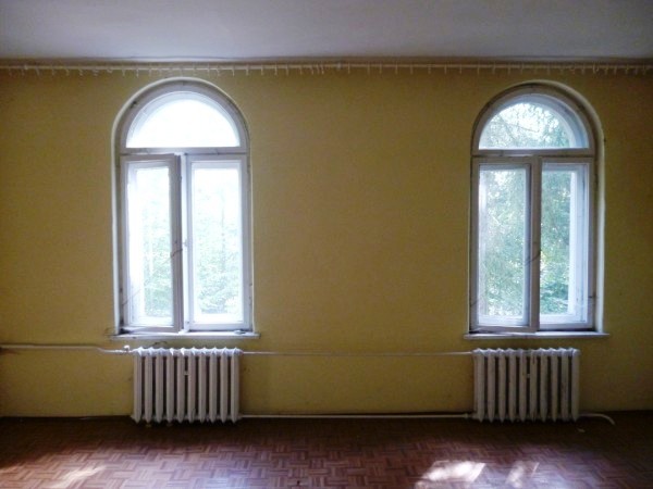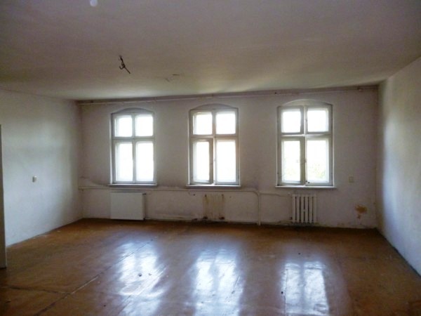 Właściciel przysłał nam więcej zdjęć na maila. Ustaliliśmy termin i nie mogliśmy się wręcz doczekać 😉 1,5h jazdy w niedzielne popołudnie i byliśmy na miejscu. I tam ogromne rozczarowanie – od razu na przeciwko budynku (za kilkoma drzewami, które trochę widok zasłaniały) były budynki (jak się później okazało, kiedyś należące do dworku i osobno odsprzedane), w których ktoś sobie miał sporą hodowlę krów :/ No to wiadomo, mimo, że wtedy żadnego zapachu nie wyczuliśmy, to latem mogło być już różnie, nie mówiąc o hałasie (bo też maszyny). Byłam tak rozczarowana, że właściwie nie chciałam już nawet wchodzić do środka. W końcu jednak stwierdziliśmy, że skoro już jesteśmy… No, wnętrza mnie zauroczyły, ogromne pokoje, piękne okna (w jednym pokoju nawet ogromne okiennice wewnątrz:D), mnóstwo miejsca… Miałam już przed oczami co bym z tym wszystkim zrobiła….