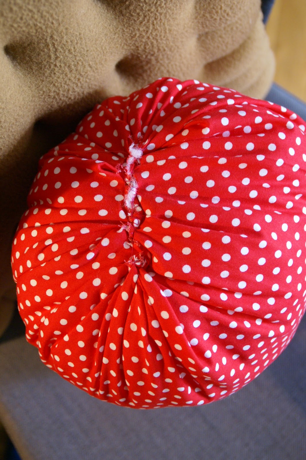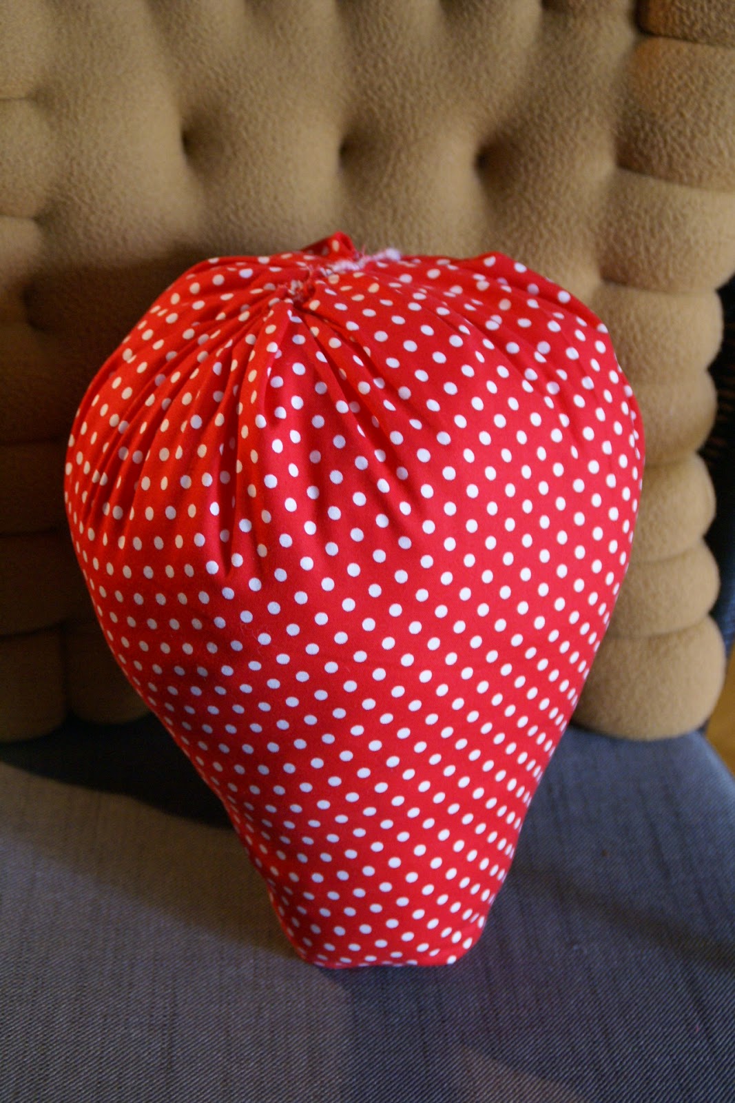 Wstępny kształt truskawki gotowy, teraz trzeba ją wypchać wypełnieniem do poduszek i zszyć ręcznie górę.