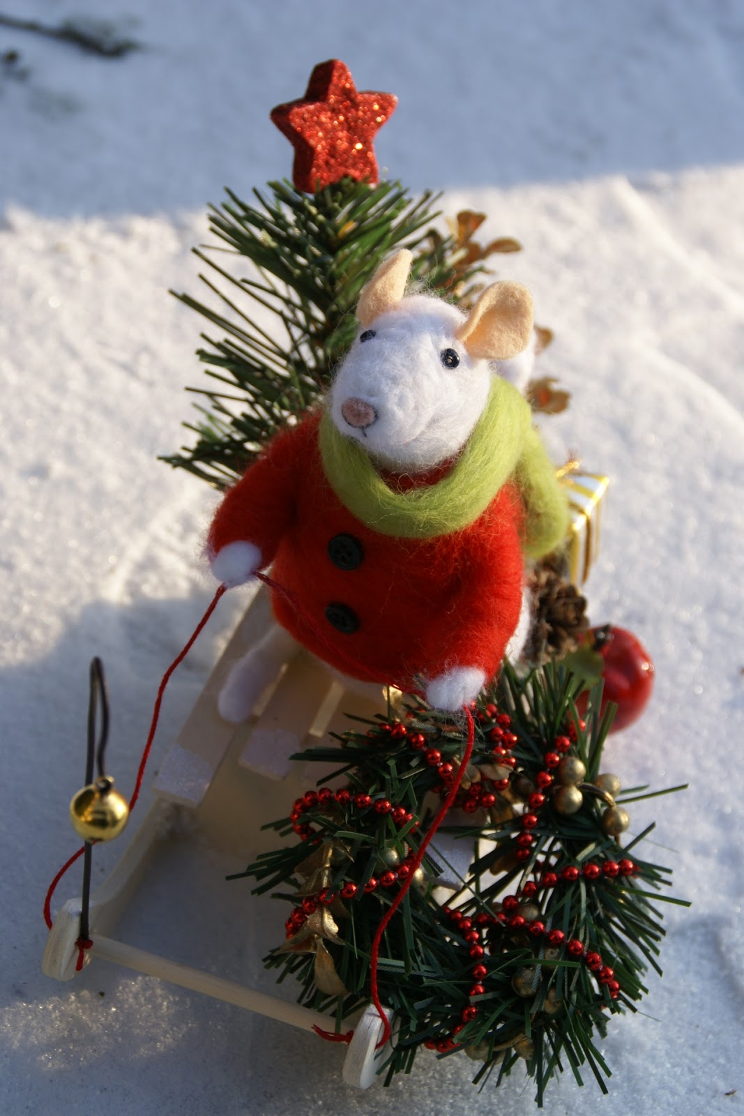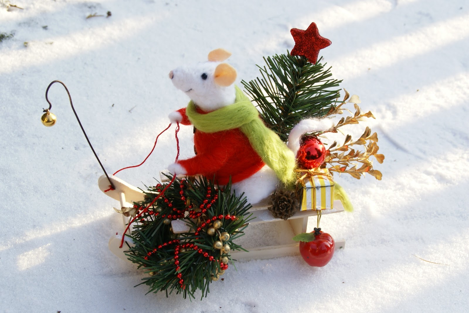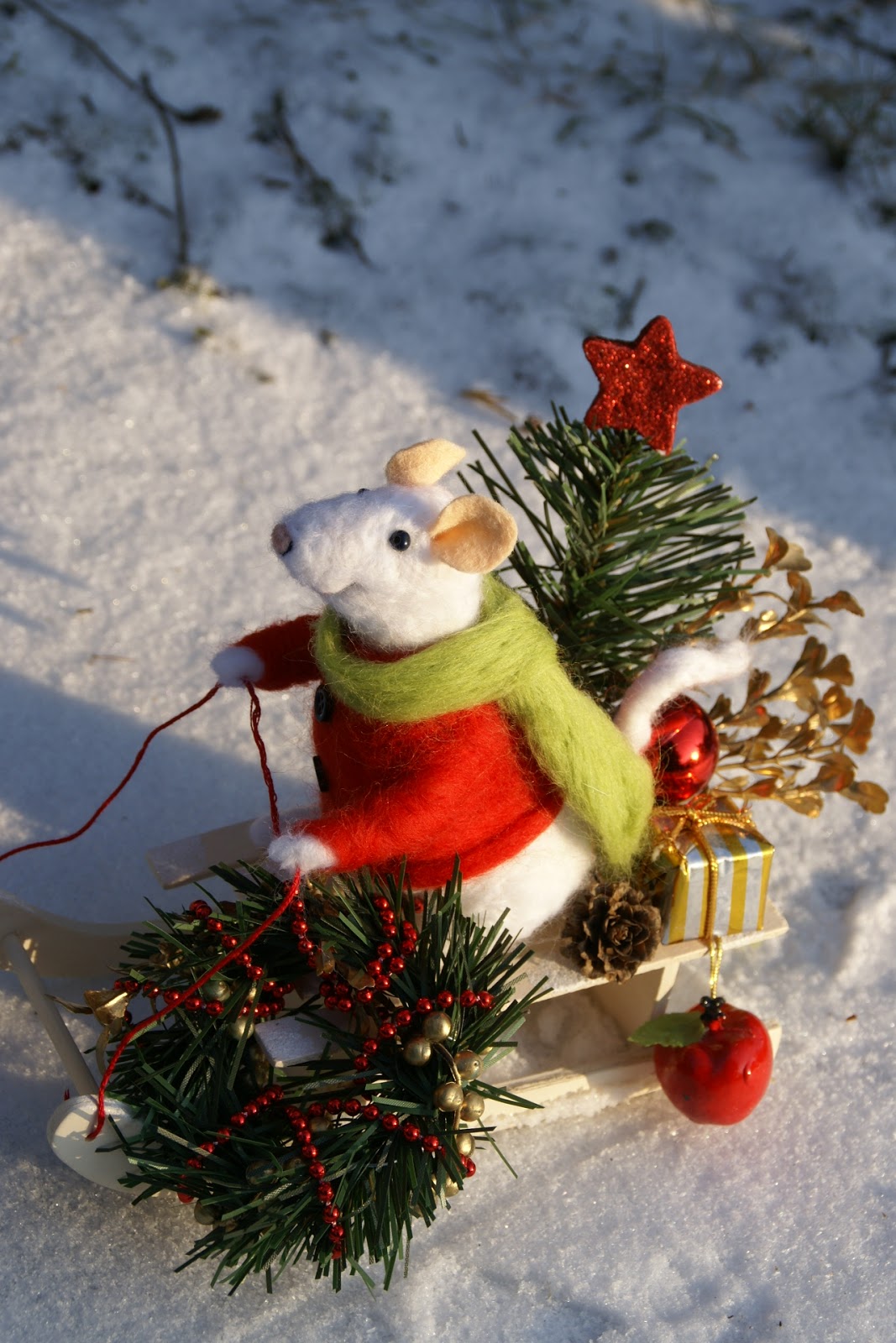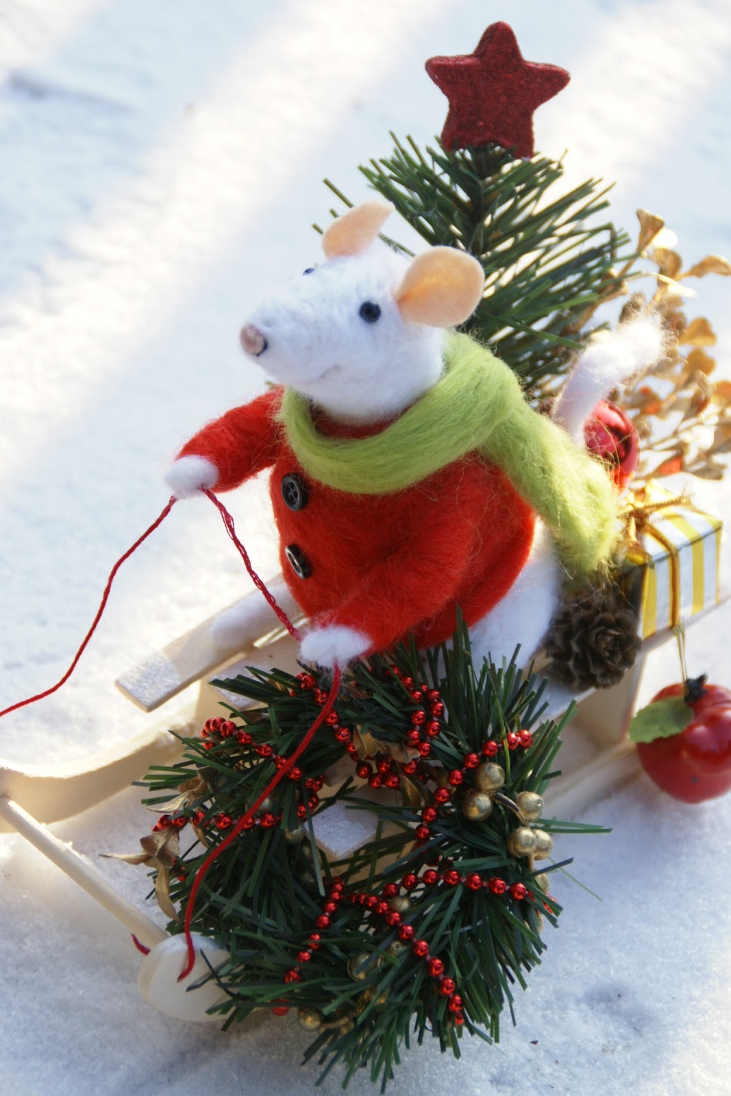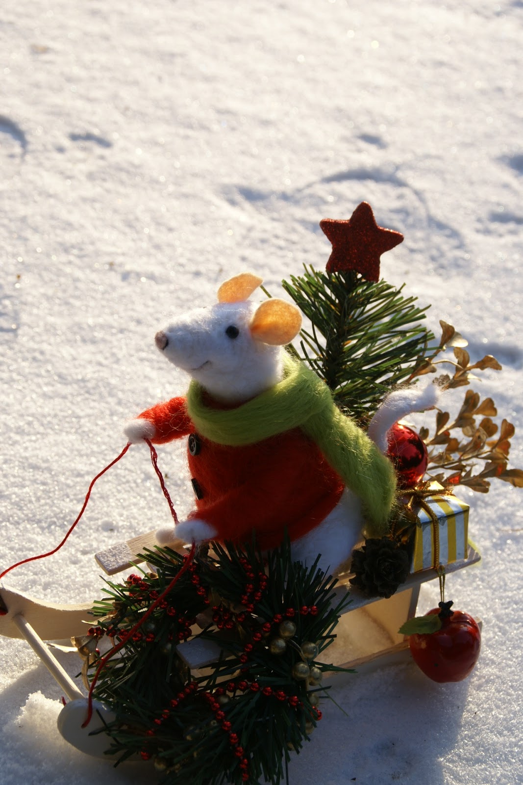 Tak więc Pan Mysz założył swój najcieplejszy sweter i długaśny szalik i wybrał się na sankach na ostatnie przedświąteczne zakupy, a że ma z górki (i na szczęście śniegu nasypało!) może sobie spokojnie na sankach zjechać 😉 Udało mu się zdobyć małą choinkę, wianek na drzwi mysiej norki, bombkę (może jakiś ludź zostawił?), jabłuszko na świąteczny deser i jakiś prezencik, którego wcześniej nie zdążył kupić 🙂