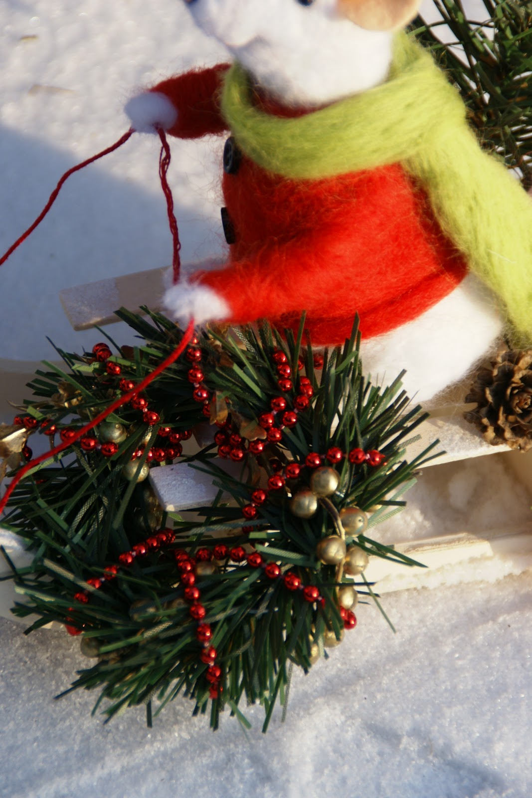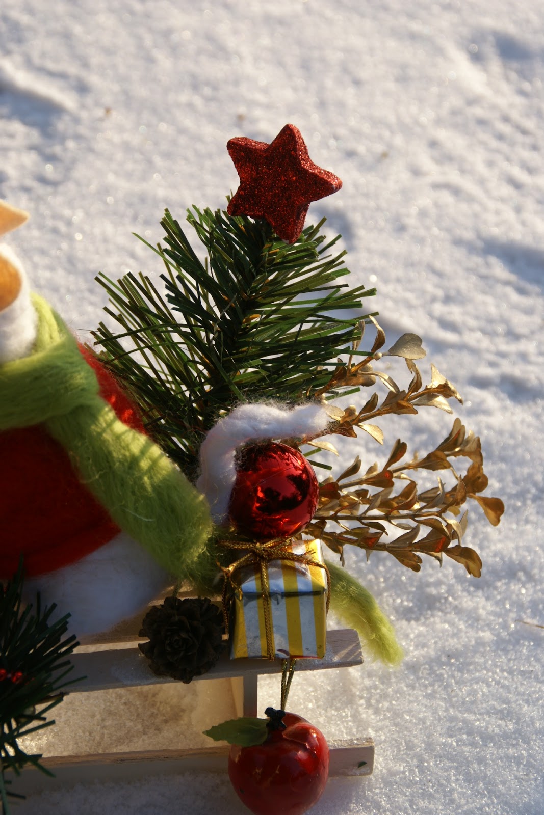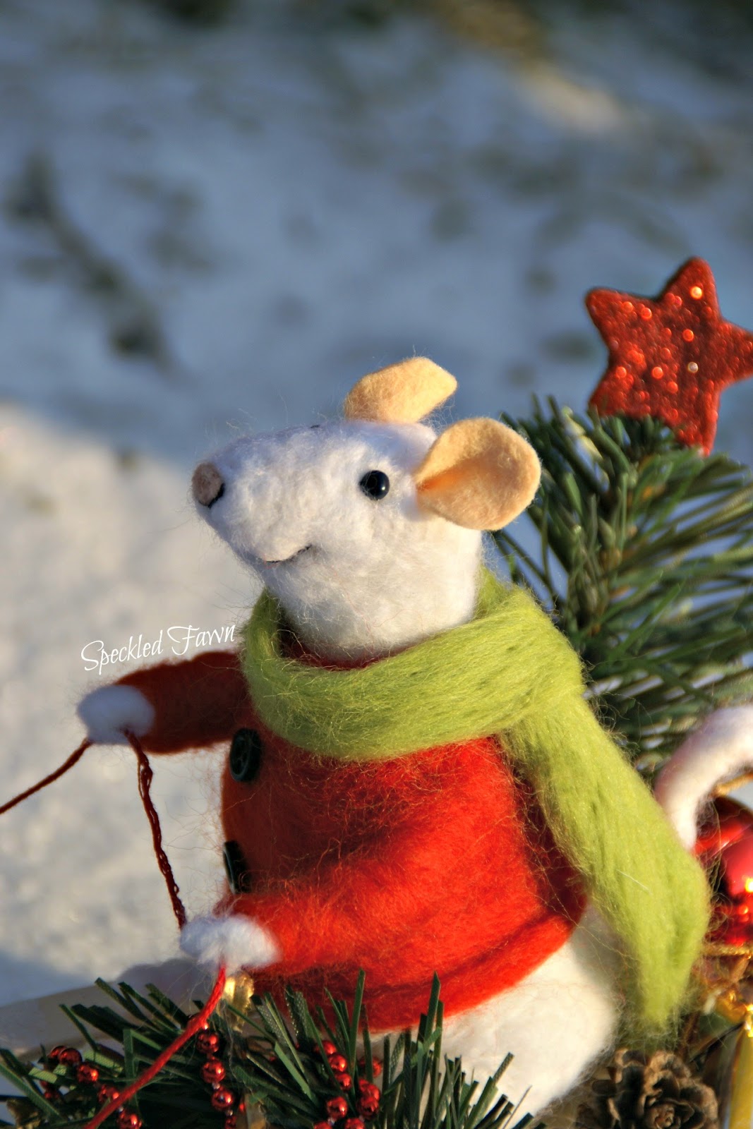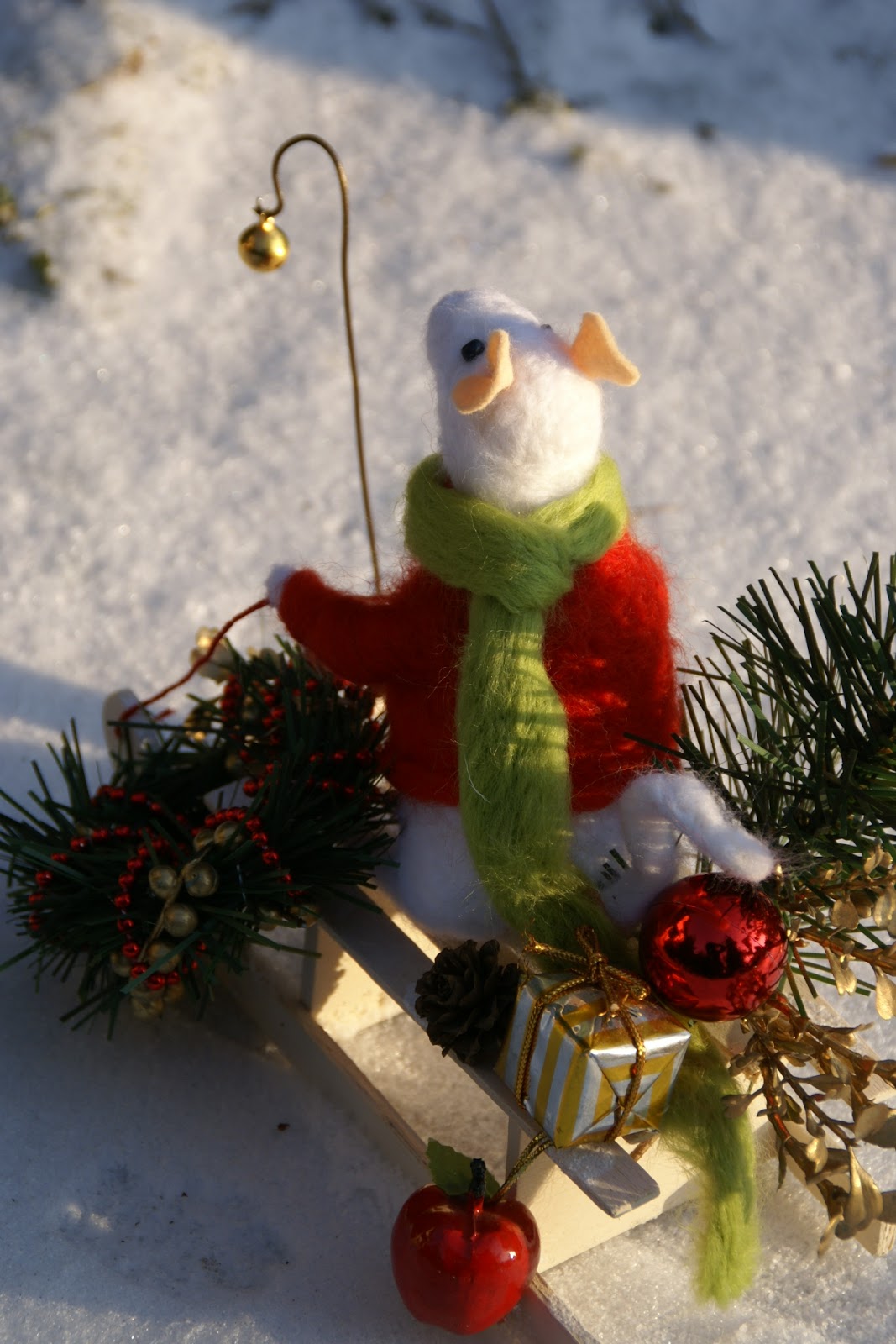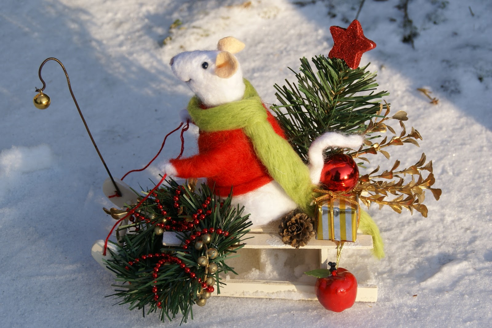 Tak więc Pan Mysz założył swój najcieplejszy sweter i długaśny szalik i wybrał się na sankach na ostatnie przedświąteczne zakupy, a że ma z górki (i na szczęście śniegu nasypało!) może sobie spokojnie na sankach zjechać 😉 Udało mu się zdobyć małą choinkę, wianek na drzwi mysiej norki, bombkę (może jakiś ludź zostawił?), jabłuszko na świąteczny deser i jakiś prezencik, którego wcześniej nie zdążył kupić 🙂