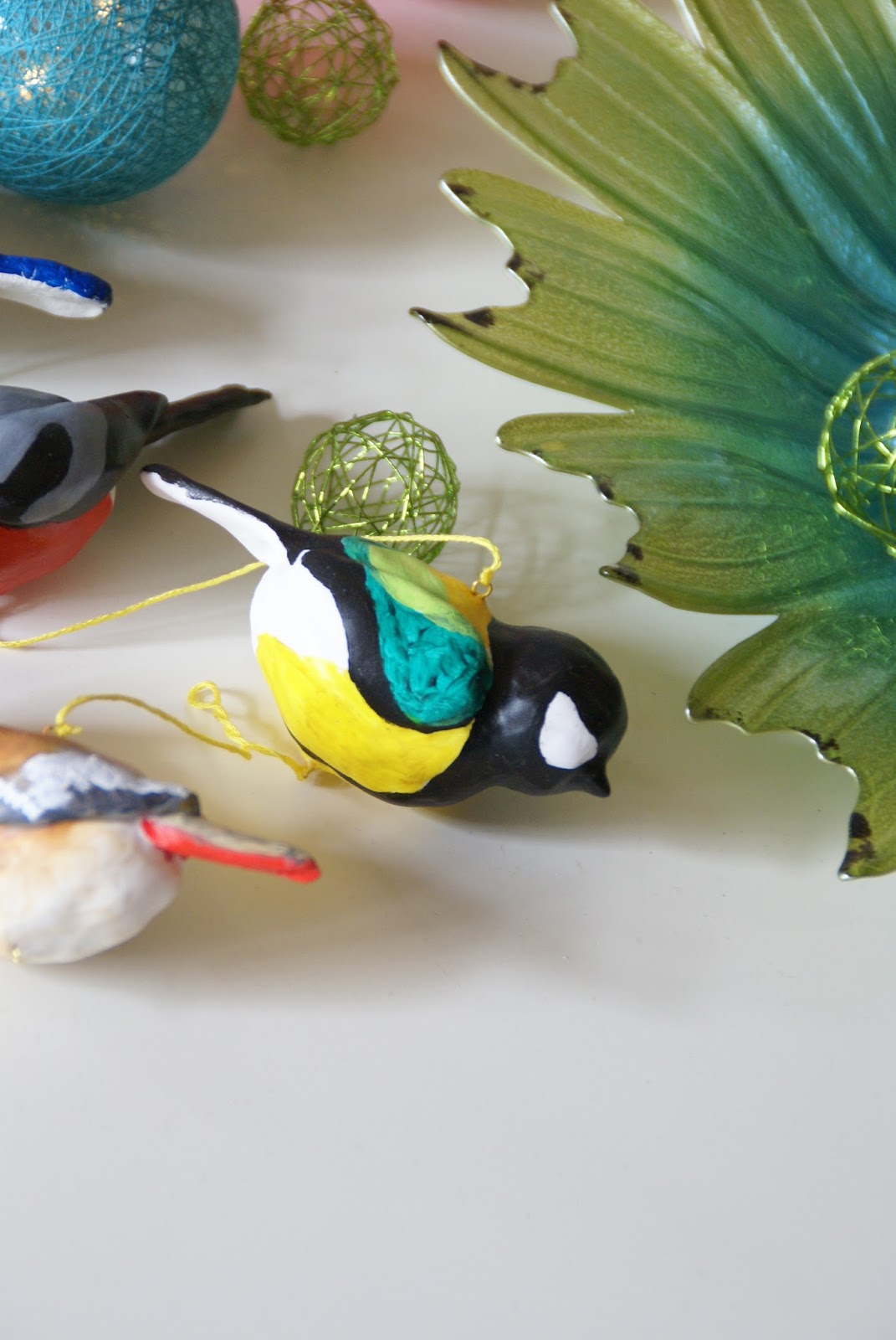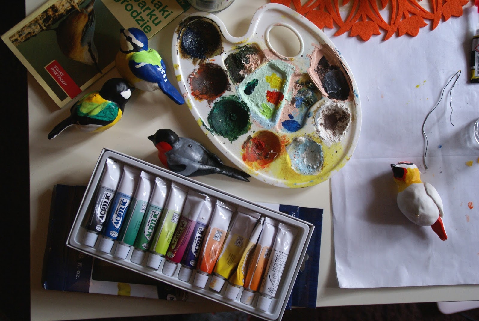 A później zaczęło się malowanie ;))) Wygląd ptaków podpatrywałam sobie z książki „Ptaki w parku i w ogrodzie”, którą mam już od lat. Internet też będzie dobrym źródłem 🙂 (już na etapie lepienia wstępnie wybrałam, które ptaki będę robić i odpowiednio kształtowałam ogony i skrzydła)