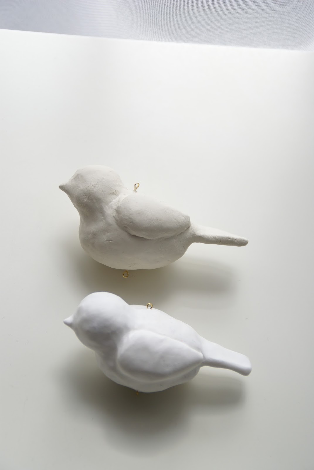 Później te aluminiowe kulki oklejałam warstwą modeliny/gliny. Na zdjęciu poniżej górny ptaszek jest z gliny, dolny z modeliny.