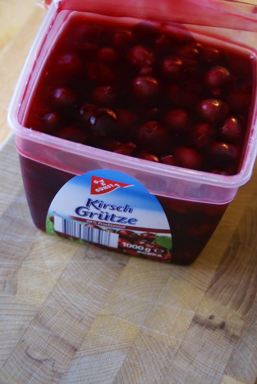 - do tego na wierzch dodaję sobie wiśnie we frużelinie, kupuję je na targu, coś pysznego 😀 (Jednak jeśli czegoś podobnego nie znajdziecie polecam wypróbować krem z jabłek, który pokazany jest powyższym filmiku).
