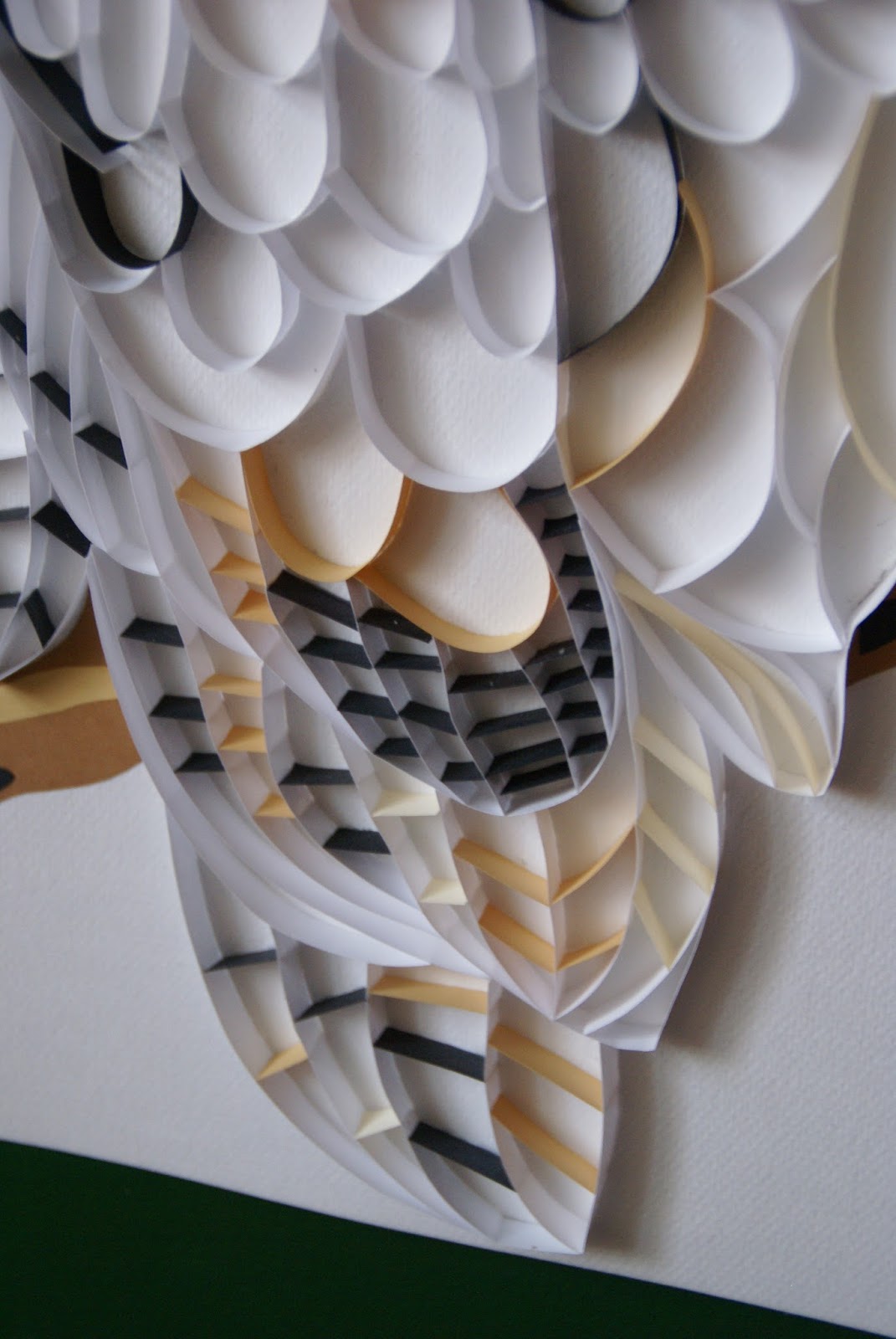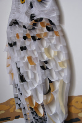 Ci, którzy odwiedzają mnie od dłuższego czasu, wiedzą, że jak już jakiejś techniki spróbuję to lecę z nią ”po całości” ;P I tu podobnie, na początek skromna karteczka, a później już 'z grubej rury’ – wielka sowa na papierze A3. Się udało, śmiem twierdzić 🙂 Najpierw delikatnie rozrysowałam sobie zarys sowy ołówkiem, później na bieżąco przyklejałam paseczki (szer.8mm) zaczynając od głowy. Używałam kleju Magik – zdążyłam się już nauczyć, że jest najlepszy w te klocki 🙂