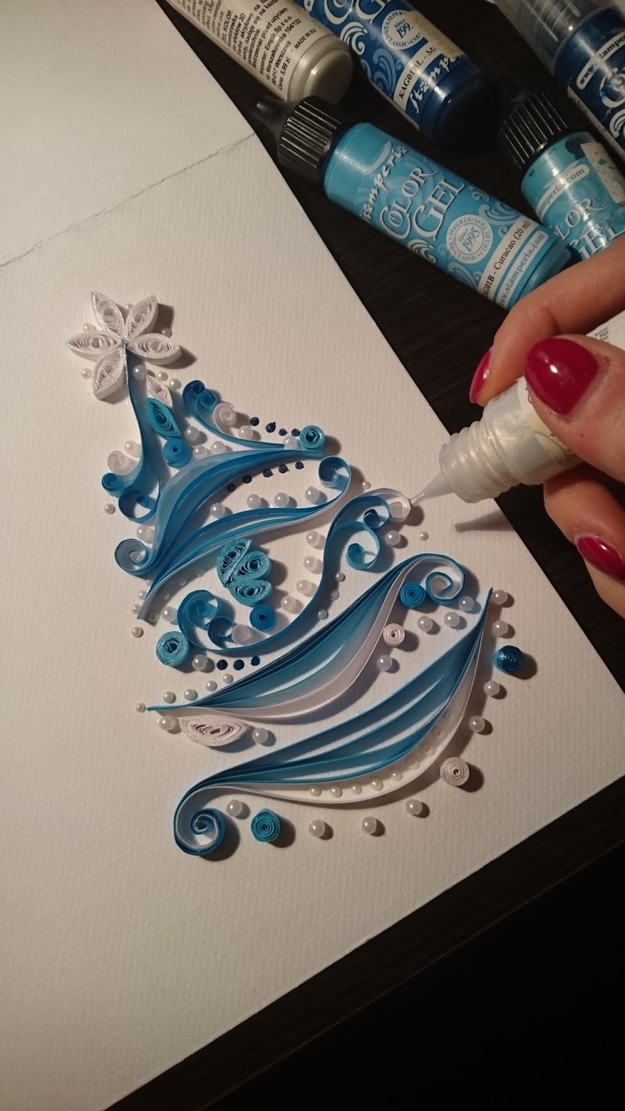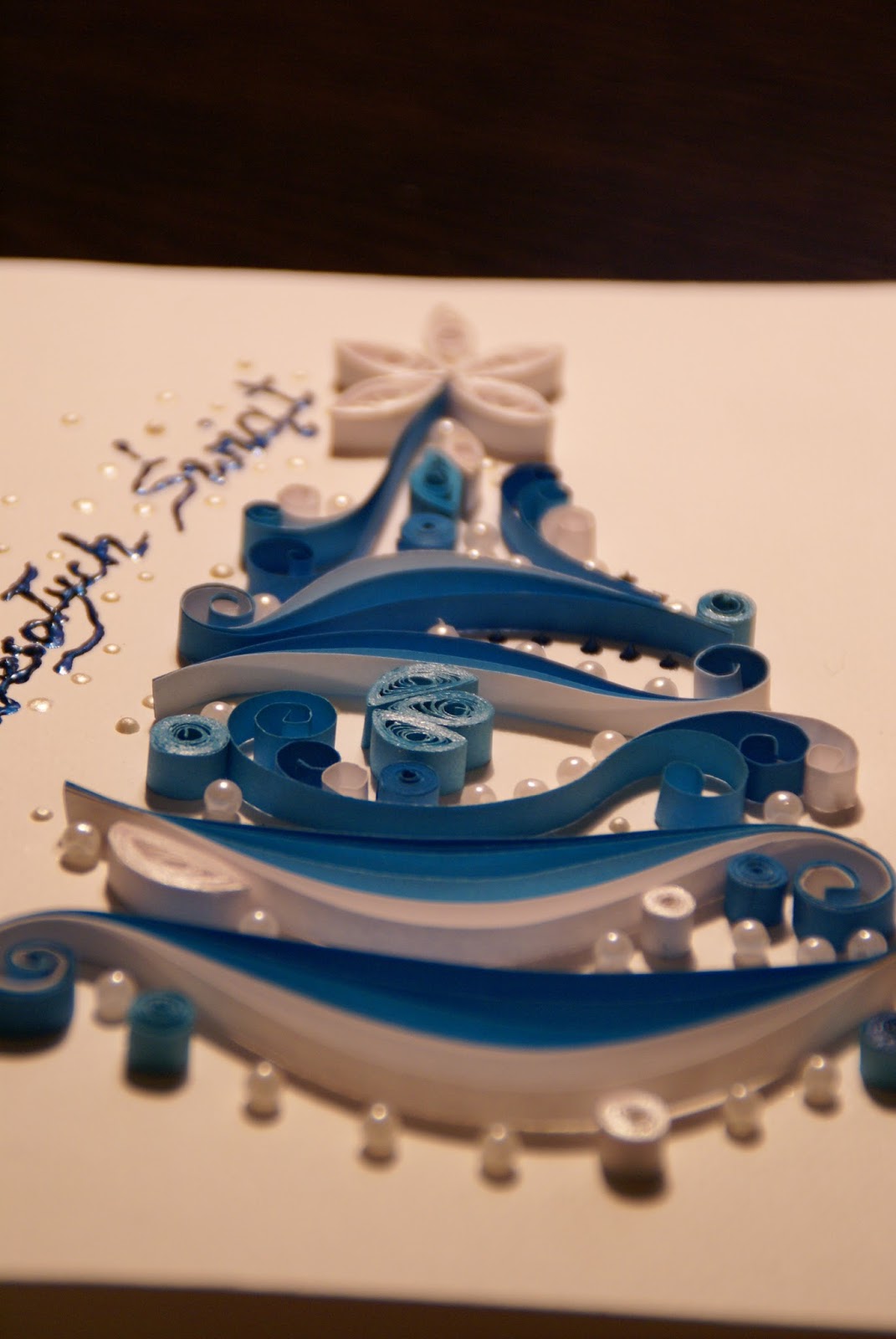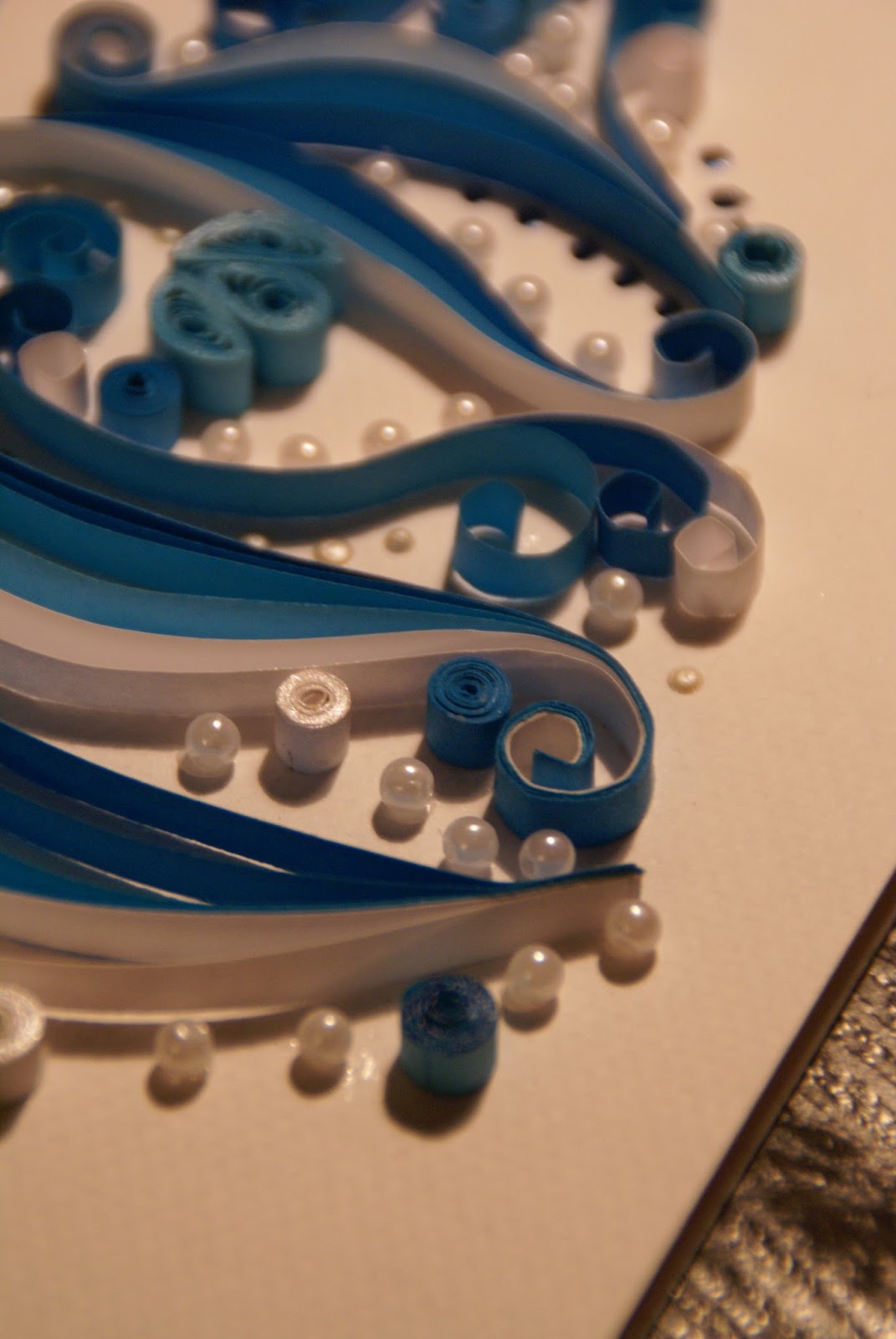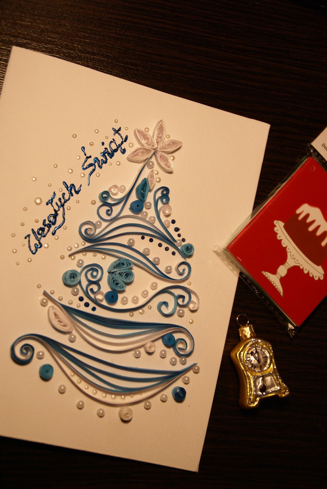 Na koniec pokażę Wam jeszcze moją pierwszą w życiu kartkę metodą quillingu, właściwie to w ogóle pierwszą rzecz jaką w ten sposób zrobiłam 🙂 Z efektu jestem bardzo zadowolona i z tego co słyszałam, osoba tą kartką obdarowana również 😉