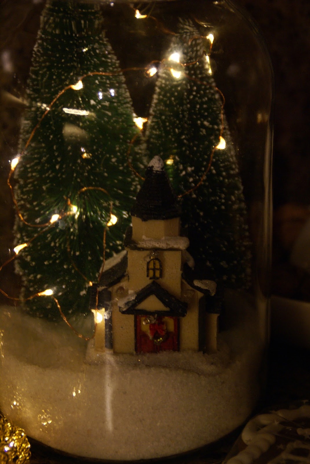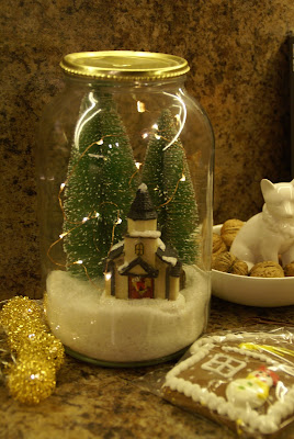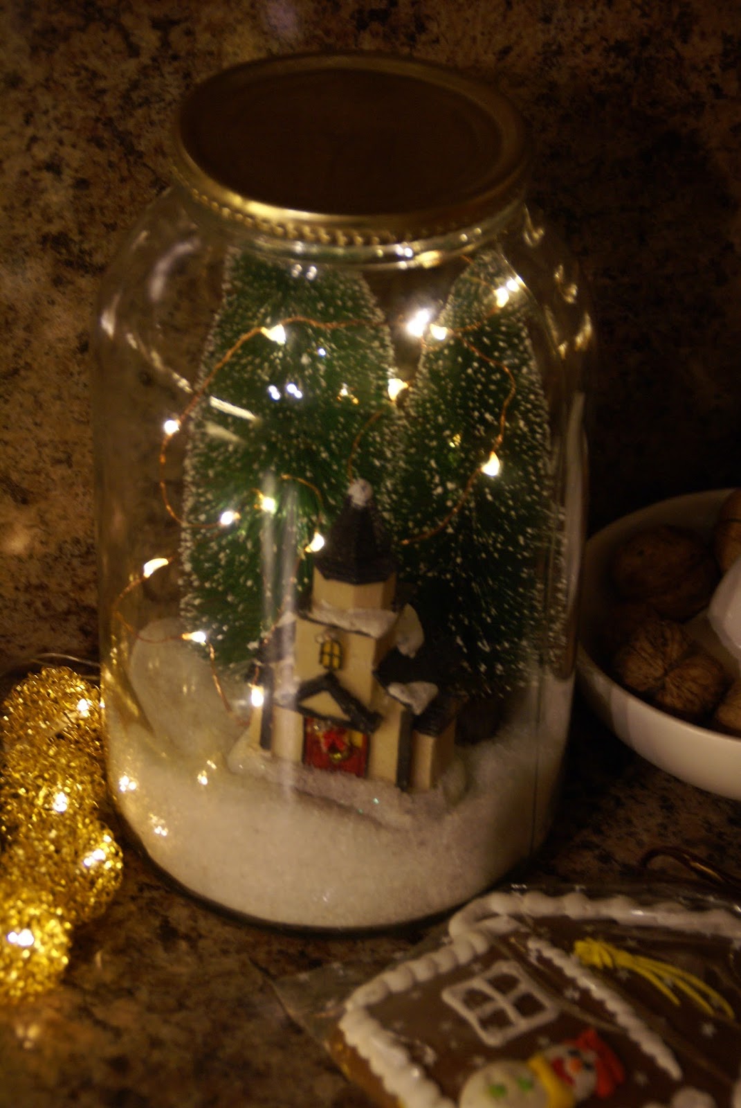 Potrzebne będzie: domek, sól gruboziarnista, choinki, duży słoik, lampeczki na druciki (na baterie). W moim przypadku wszystkie te pierdółki zbierałam kupując coś to tu, to tam, ale podczas ostatniej wizyty w sklepie Tiger widziałam dosłownie wszystkie potrzebne do takiej scenki rzeczy (właściwie to domek właśnie stamtąd pochodzi;)